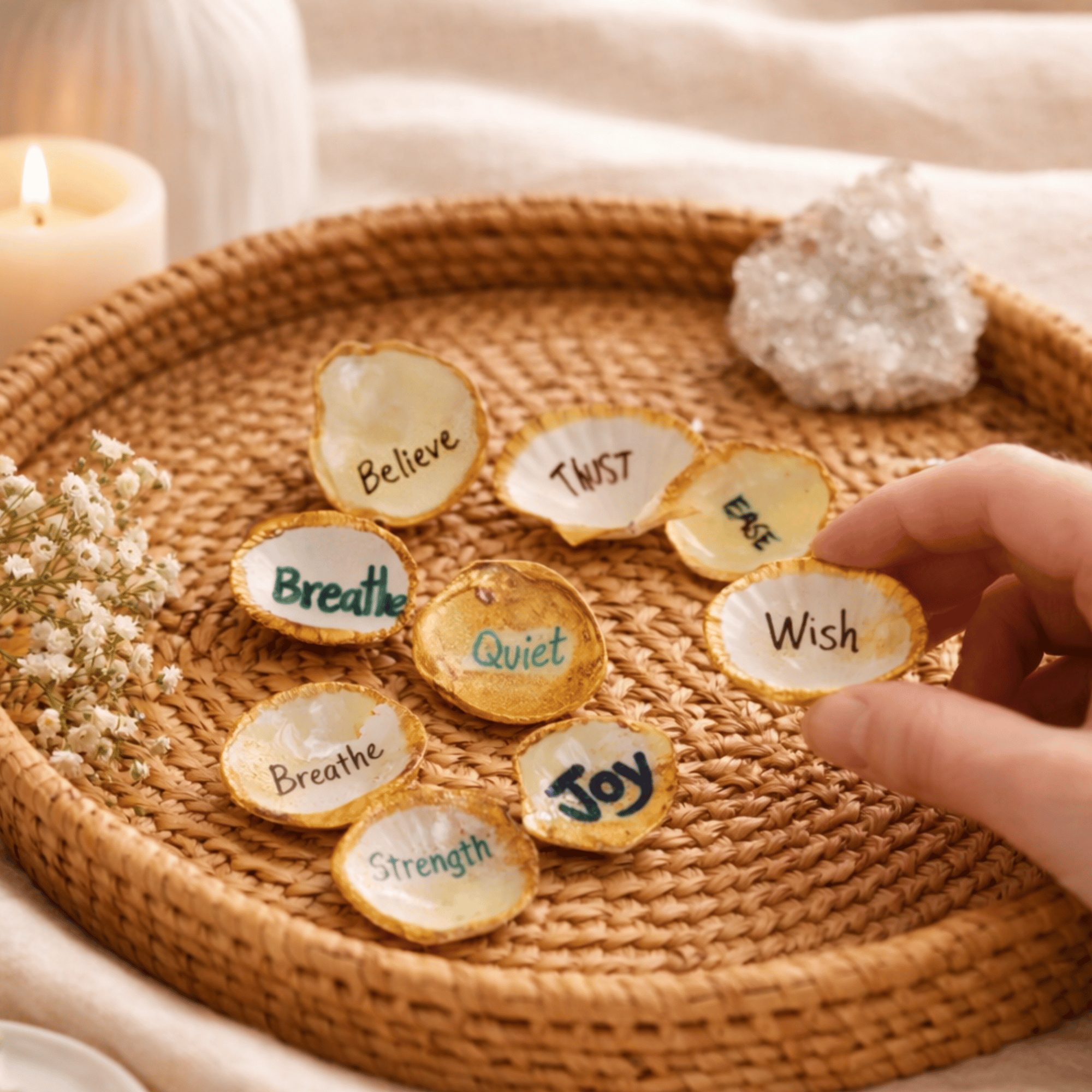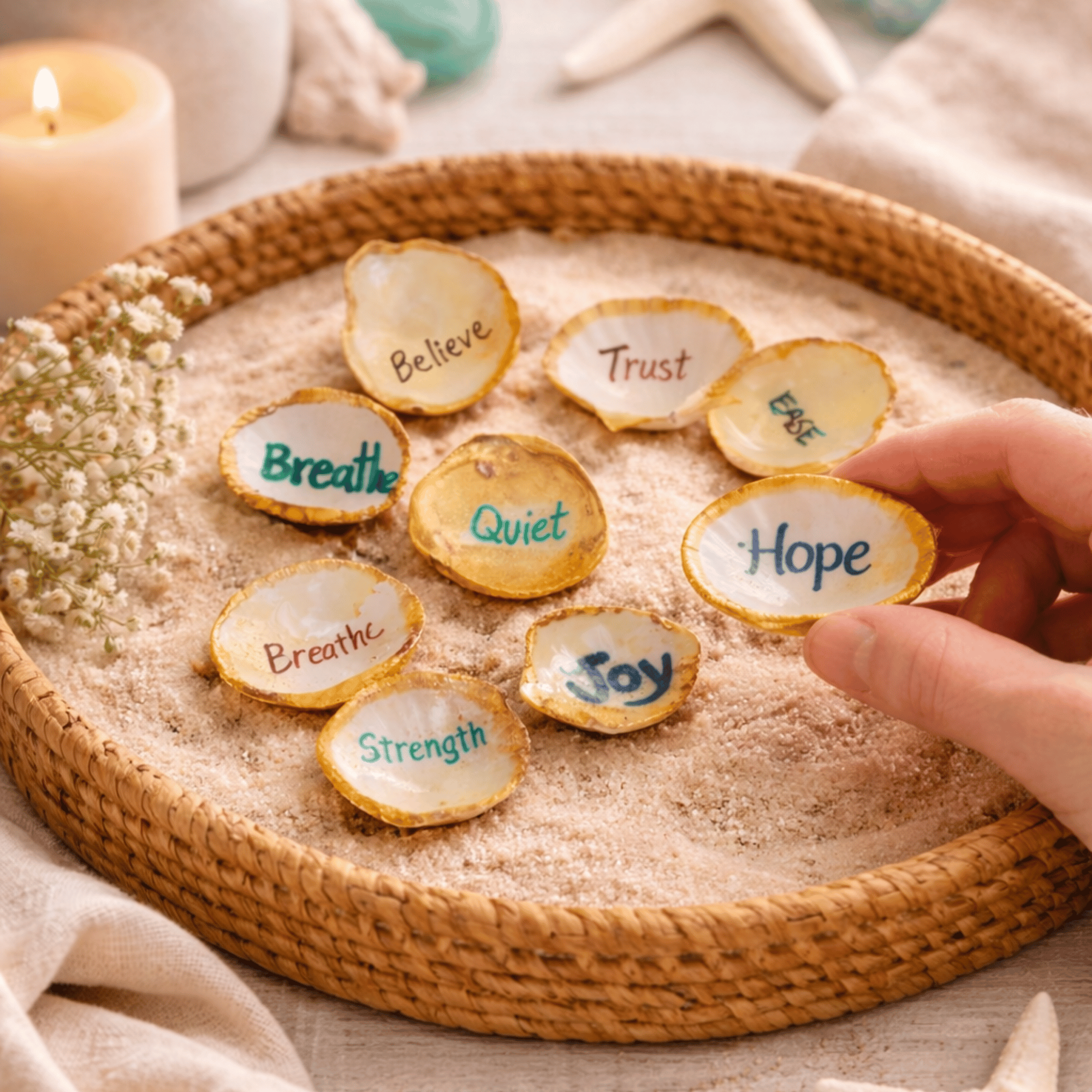 I begin by painting the edge of each shell with gold acrylic paint. Next, I inscribe an uplifting word on each shell to elevate your spirit! Finally, I finish by applying a layer of clear Mod Podge to protect them.