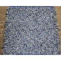 This rag rug is a beautiful shades of light slate blue and toupe. Sustainably made with discarded trimmings from upholstery fabric.