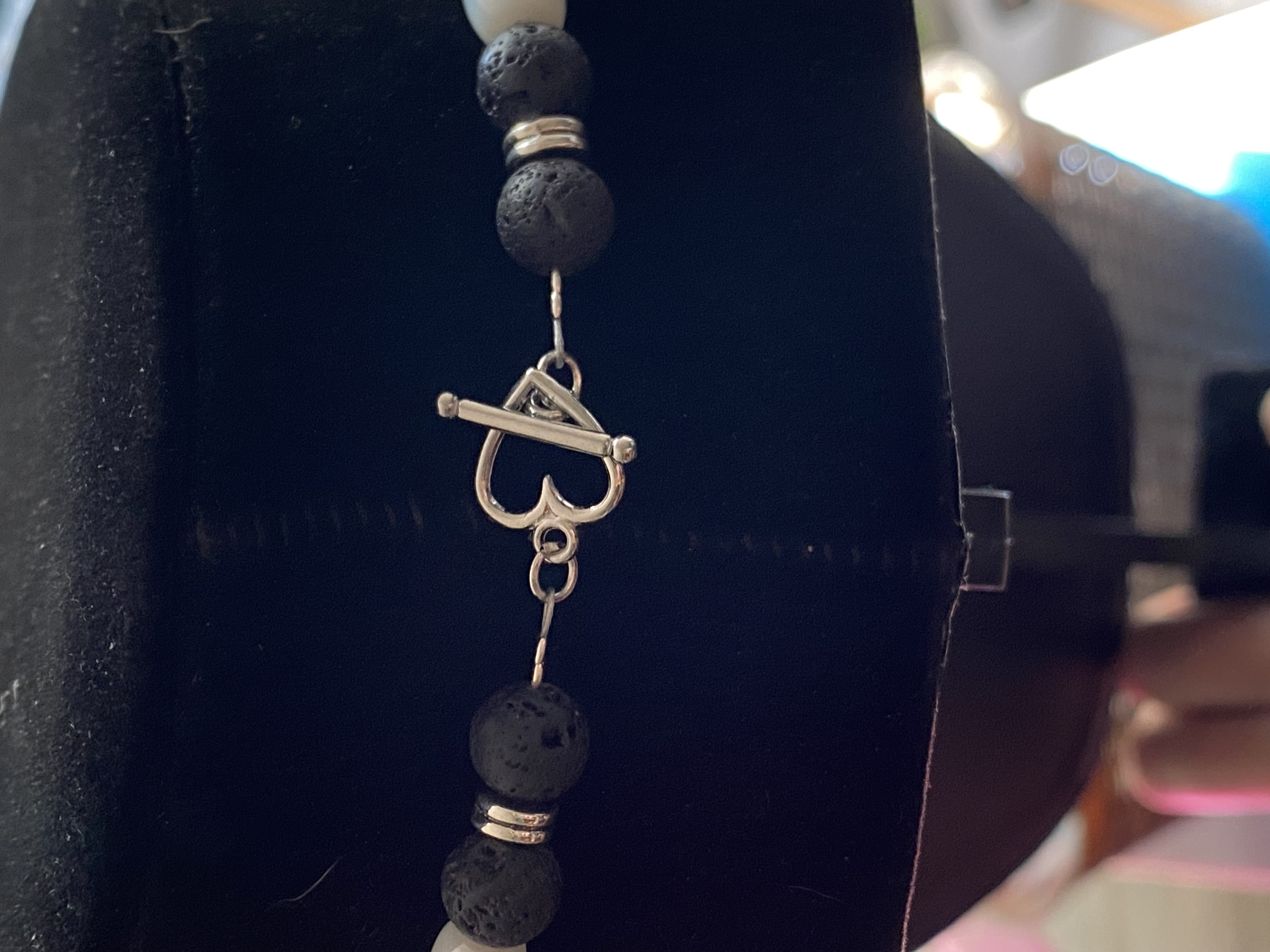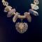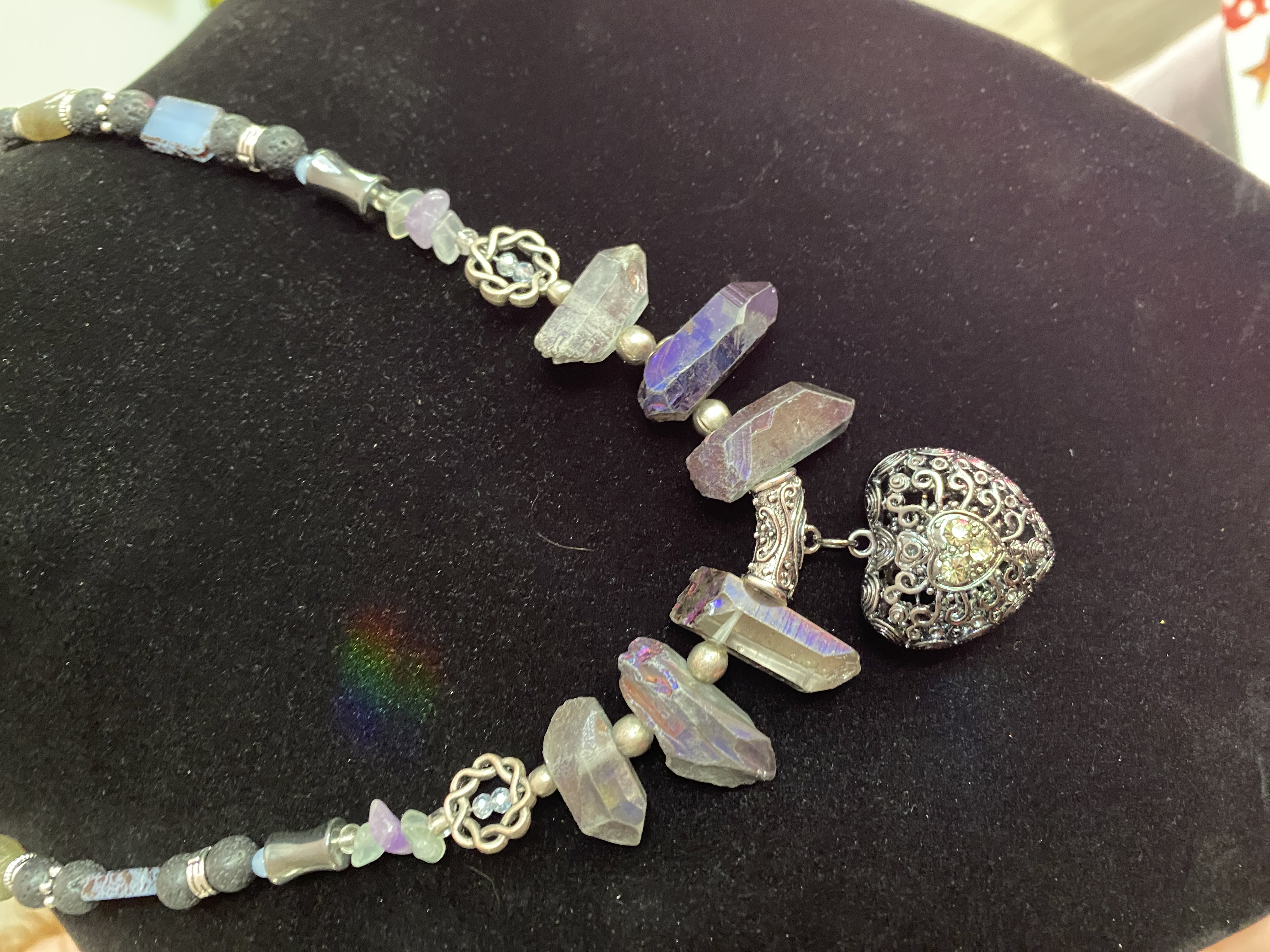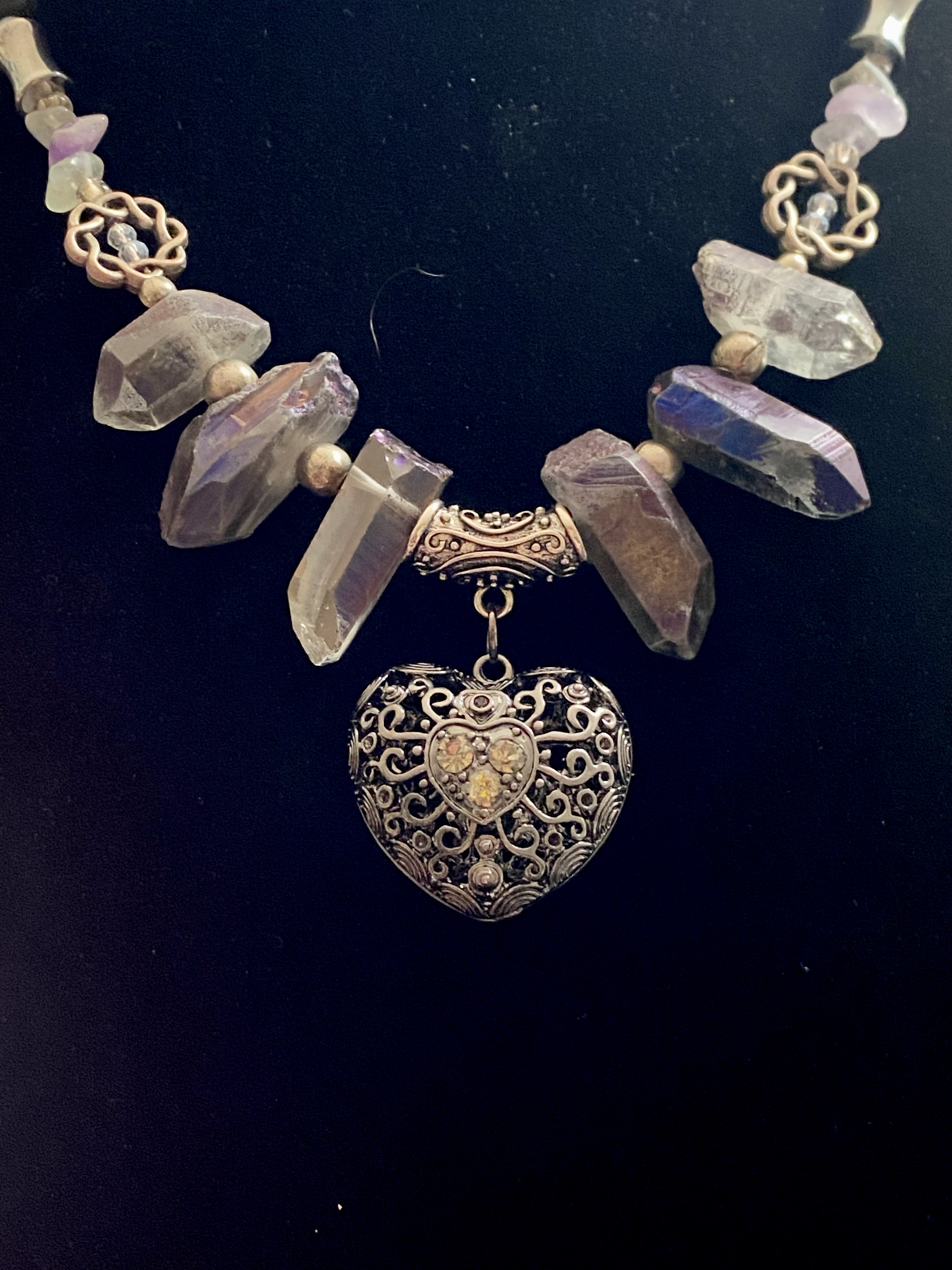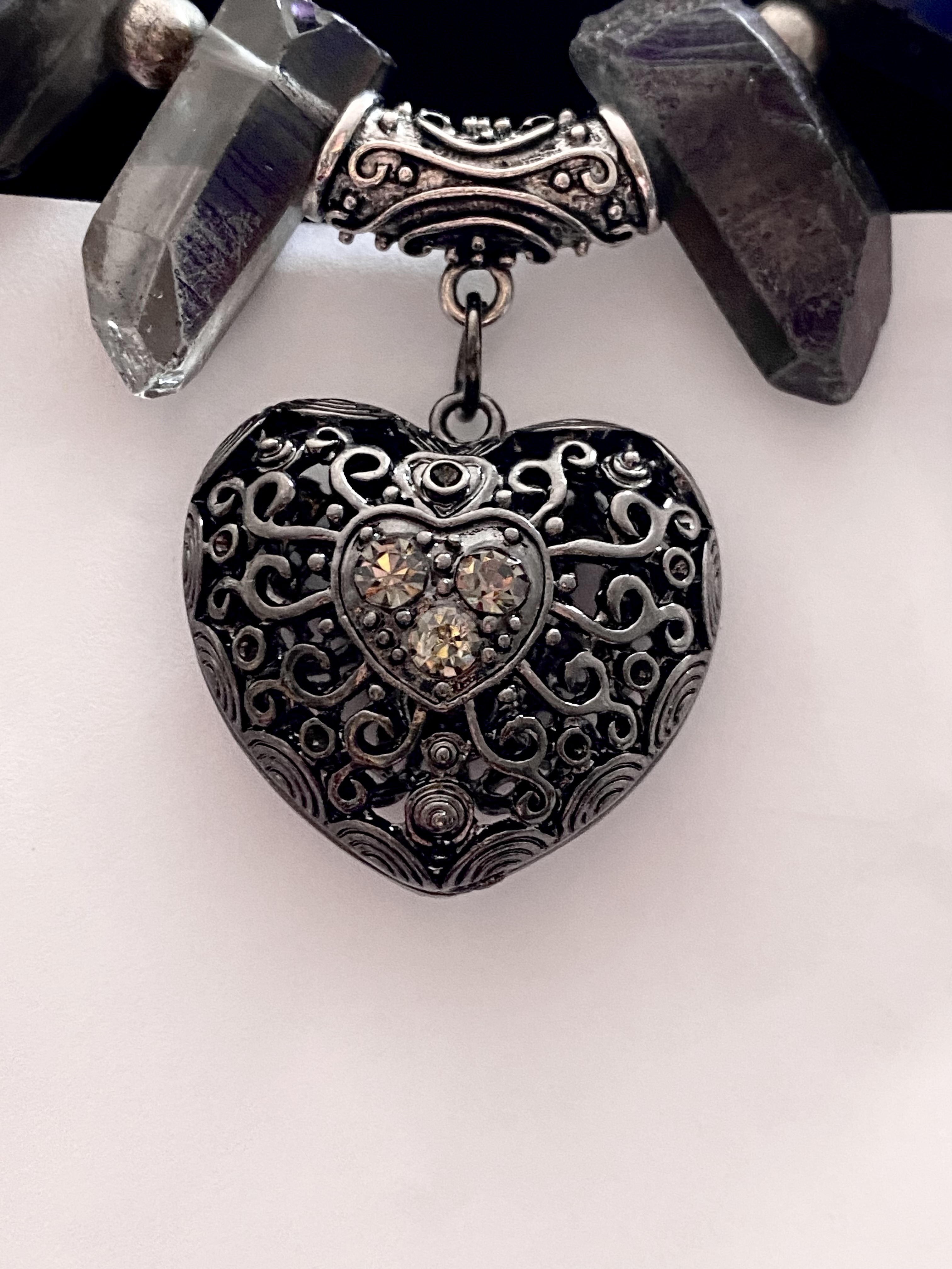 Shadow & Stone is a bold statement necklace that blends shadowy elegance with natural power. Featuring a reclaimed vintage heart pendant suspended beneath raw quartz and flanked by labradorite, amethyst, and grounding lava stones, this piece evokes the liminal space between light and dark.