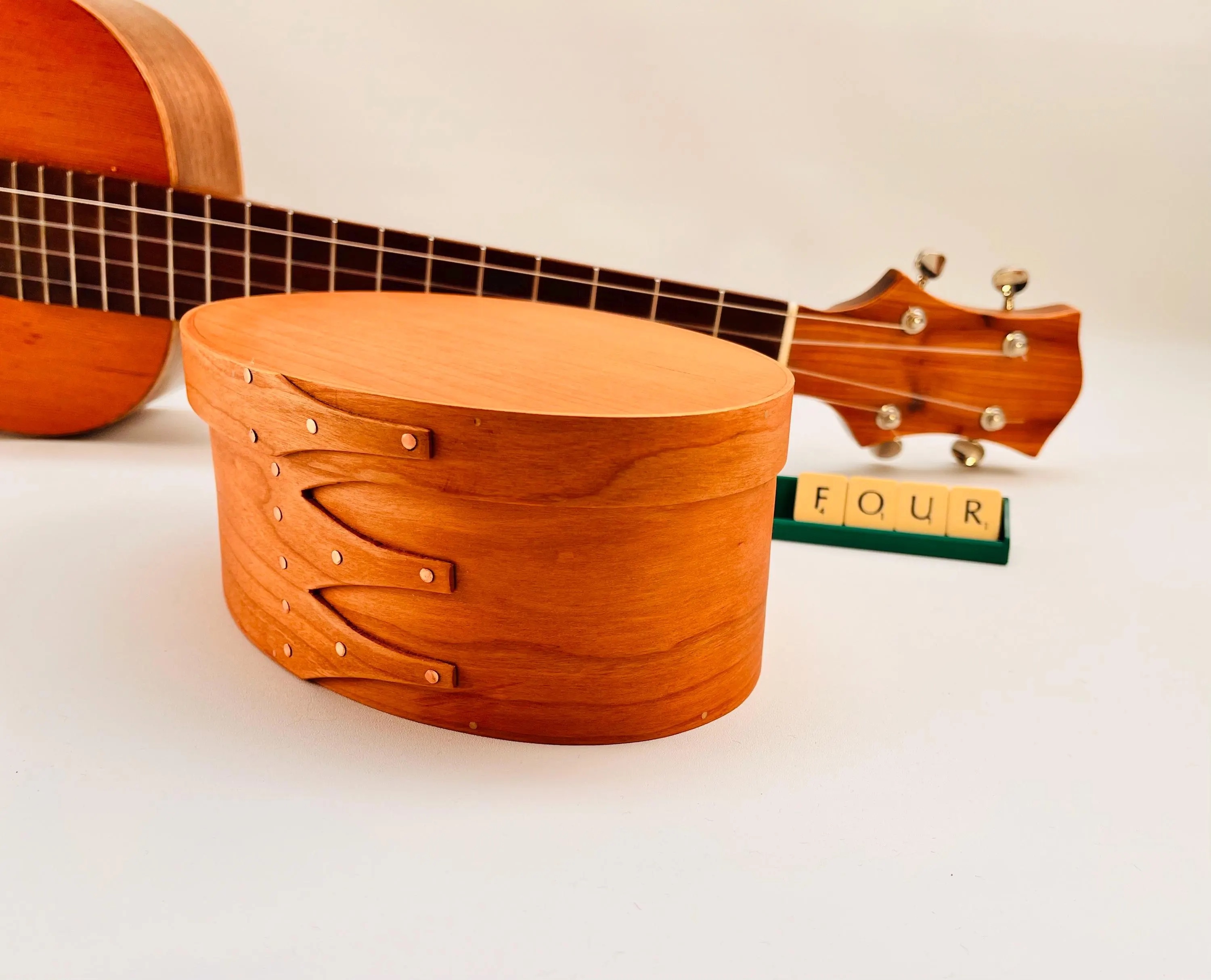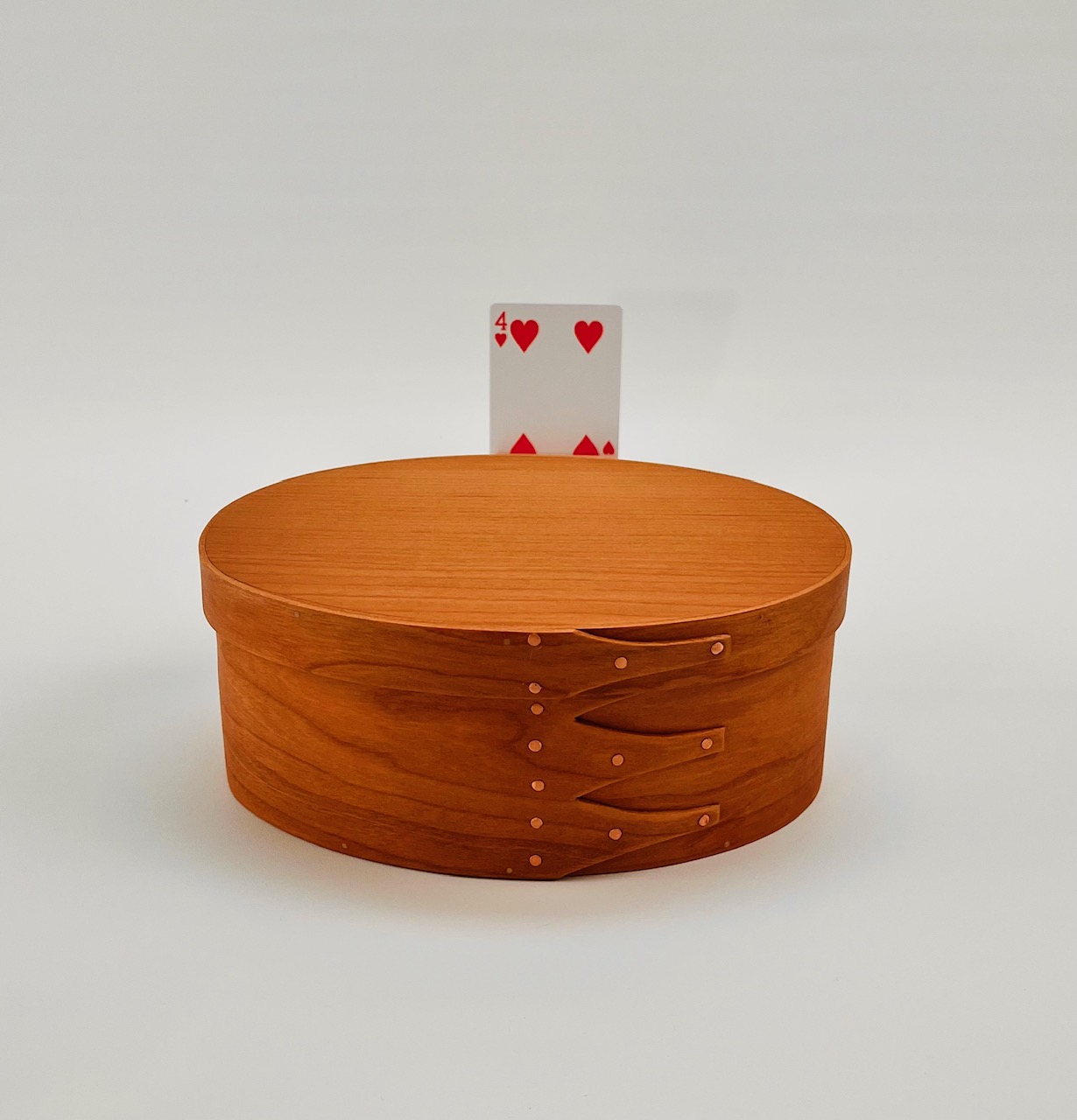 Once pliable, the wood is carefully bent around a form to create the graceful oval shape that defines Shaker craftsmanship. The distinctive “fingers” on the band are overlapped and hand-fastened with authentic copper tacks, just as the Shakers did over two centuries ago. Each joint and edge is shaped and sanded until perfectly smooth, ensuring that the box is as functional as it is beautiful.