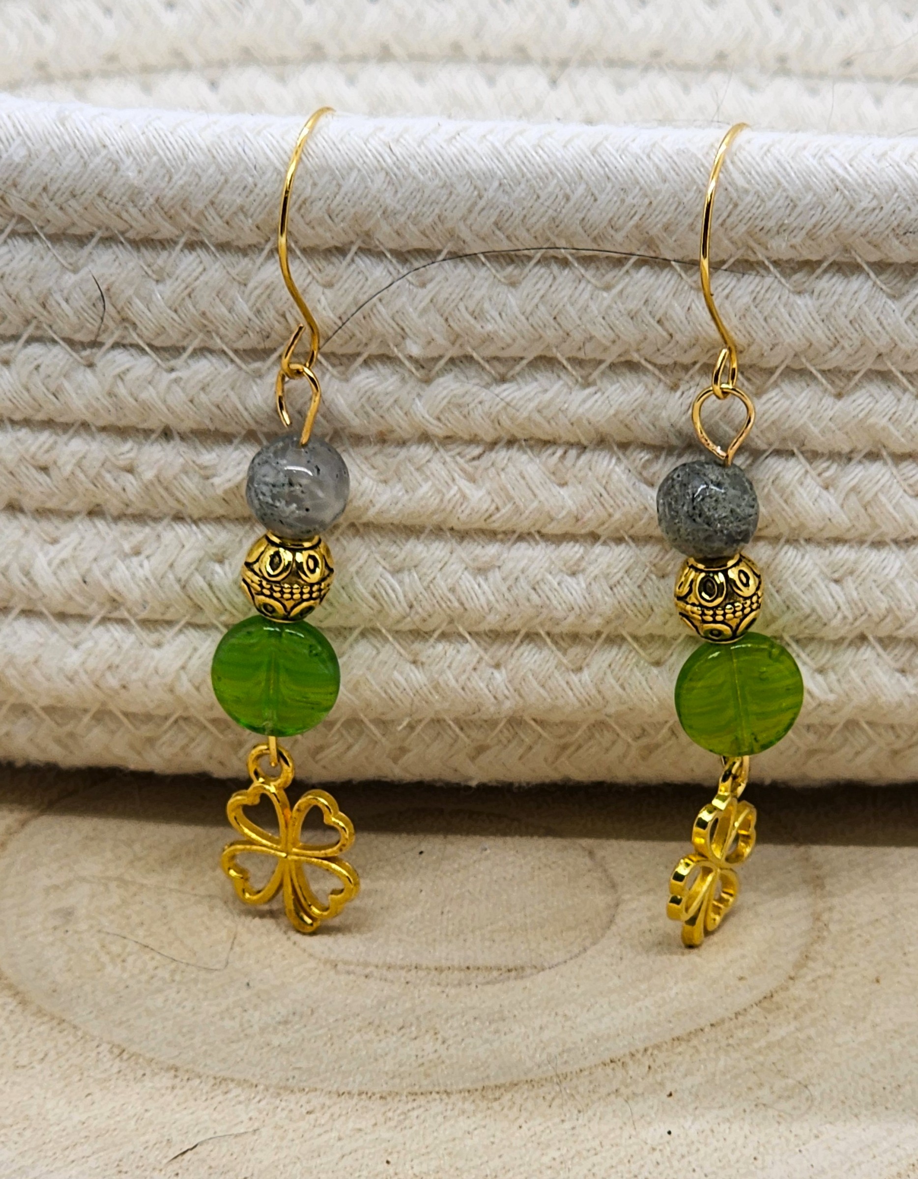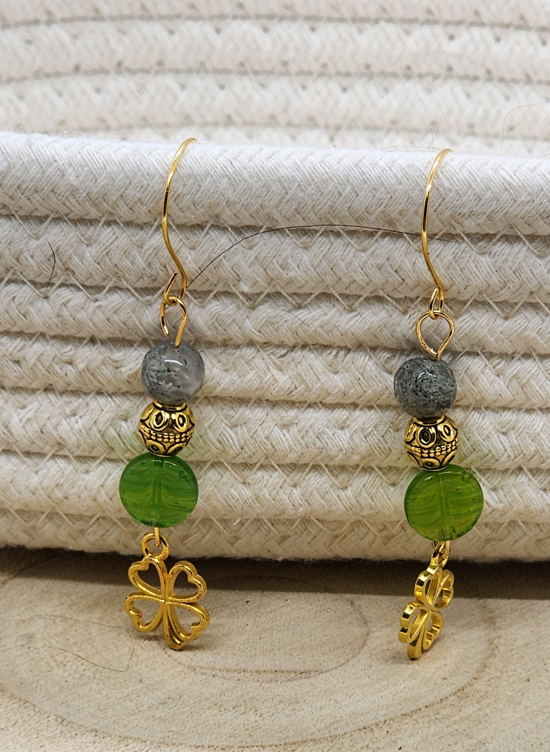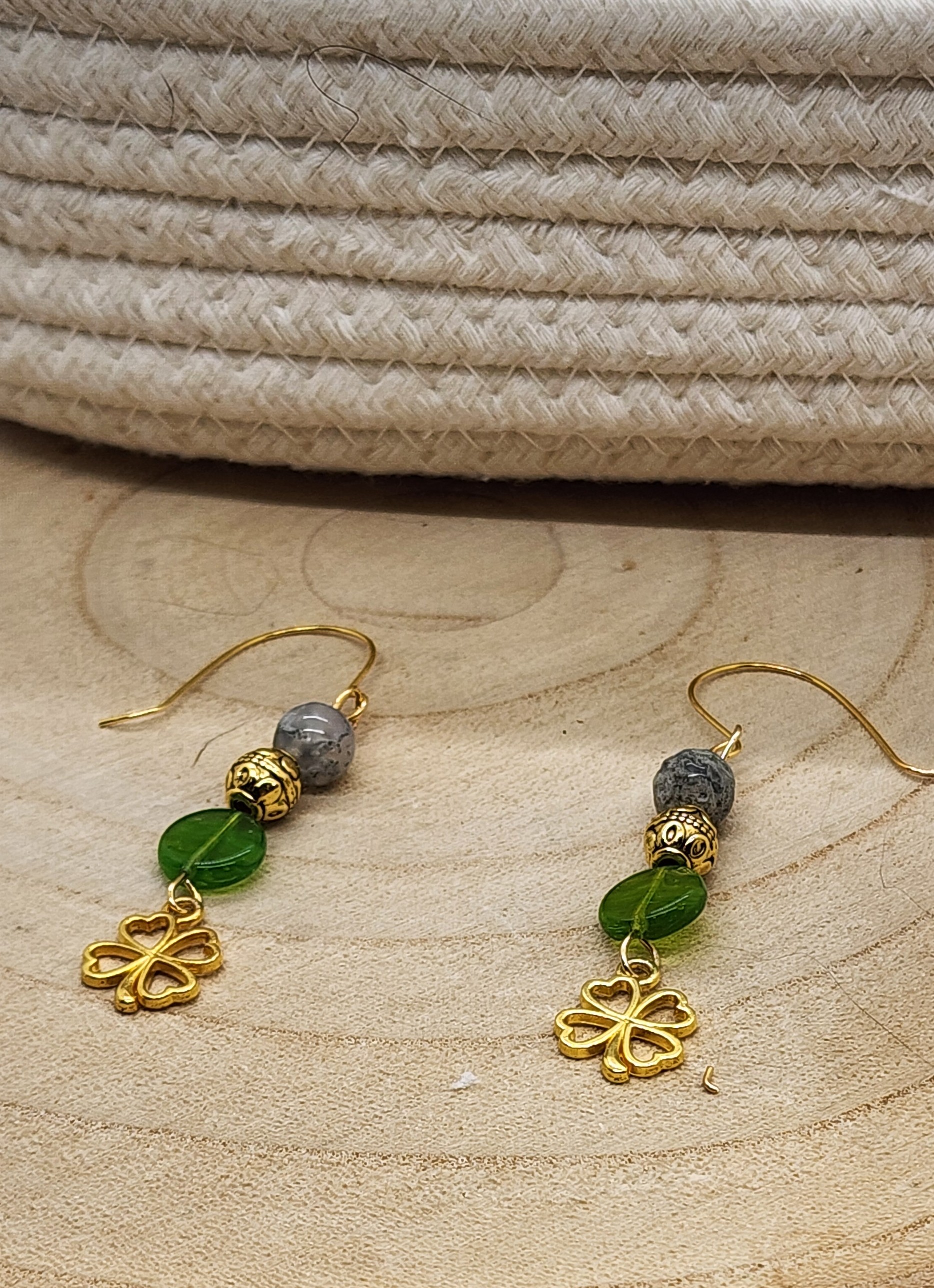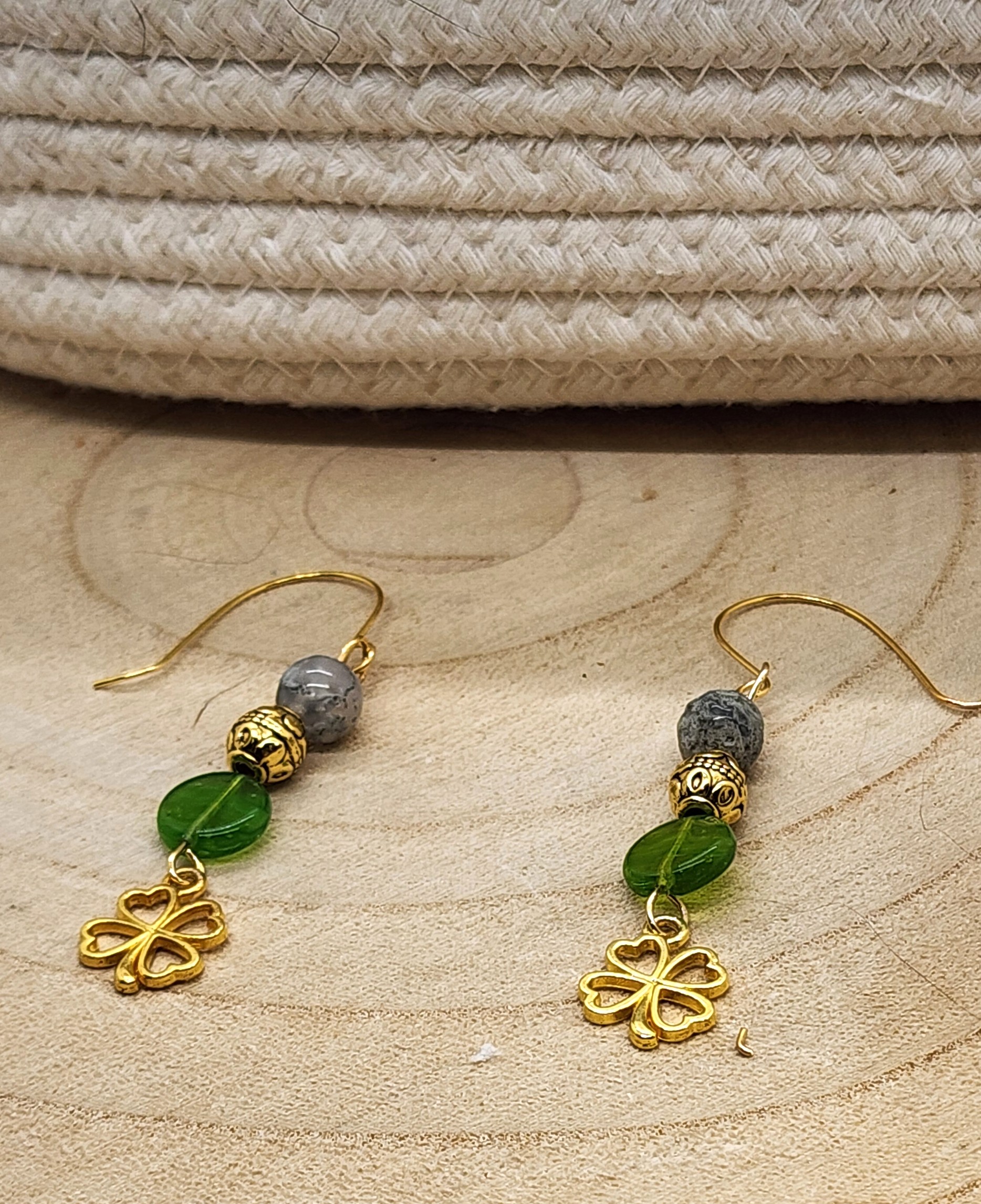 The Stones: A shimmering Moss Agate bead paired with a vibrant, translucent green glass bead for that essential pop of Irish color.
