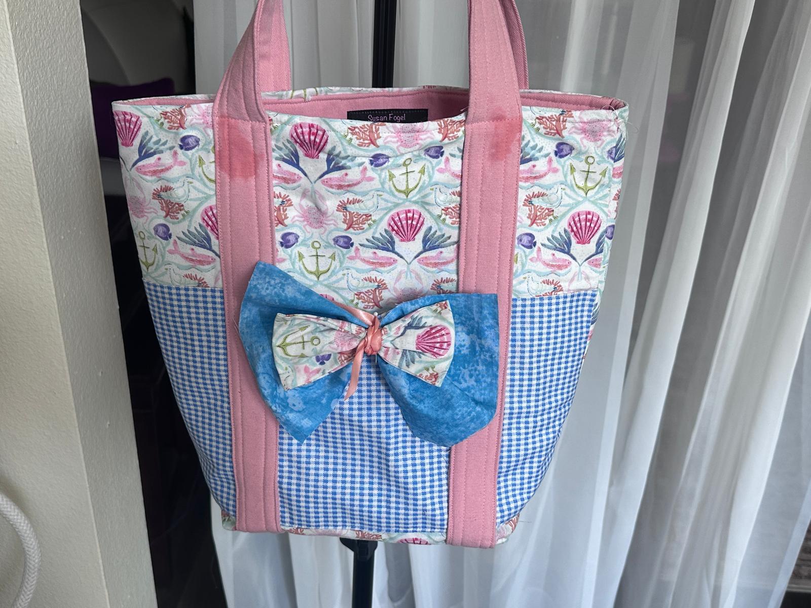 This tote is simply beautiful. With her soft colors, lovely shell print, and optional pastel bow, she’s the perfect small carryall.