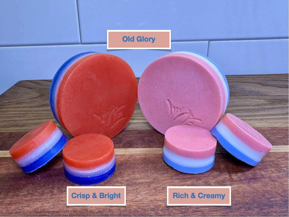 Celebrate the red white and blue with this Old Glory Signature Set. These pours are made for everyday use as a bath and body bar, or for refreshing shampoo or shave.