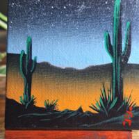 Silent Guardian of the Star-Kissed Sands captures the serene beauty of a desert landscape at dawn. This intimate 2 by 3-inch acrylic painting features a tall green cactus standing prominently in the foreground, framed by desert vegetation under a gradient sky that fades from light blue near the horizon to a star-filled dark blue above. Silhouetted distant mountains add depth and highlight the expansive quiet of the scene. The artwork invites viewers to experience the peaceful stillness and timeless guardianship of the desert beneath a shimmering starry sky. A small easel is included for display.