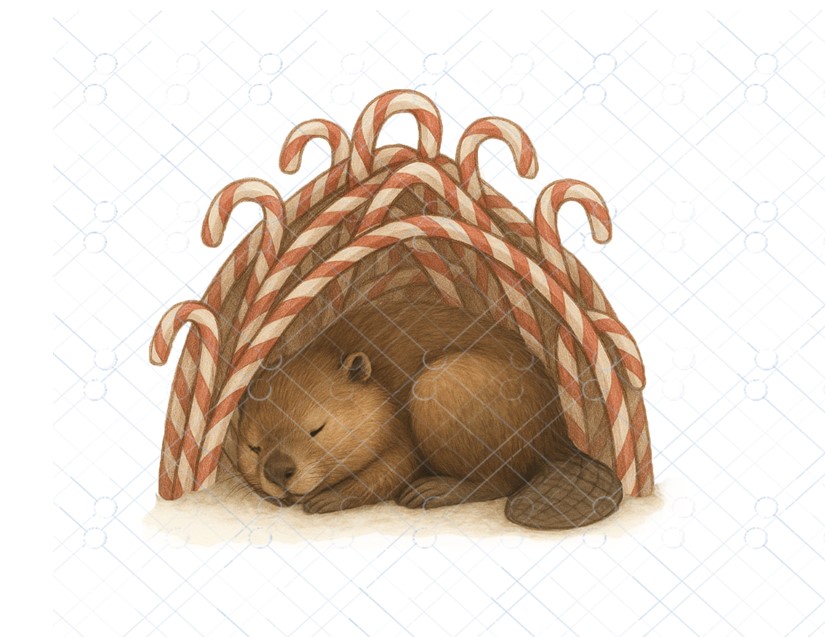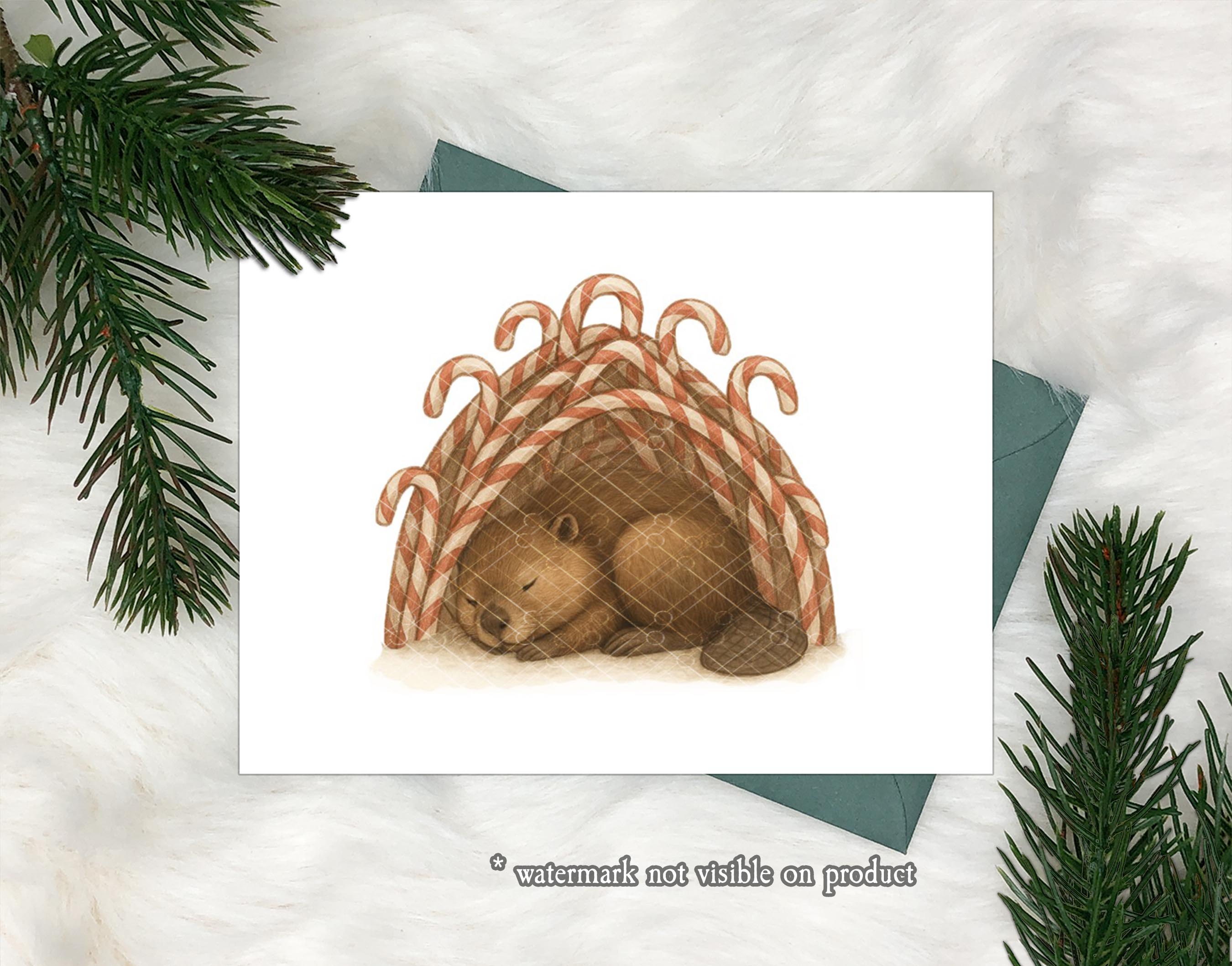 Part of the Silent Night Series, this card features “Benny,” a cozy little beaver fast asleep beneath a den made entirely of candy canes.