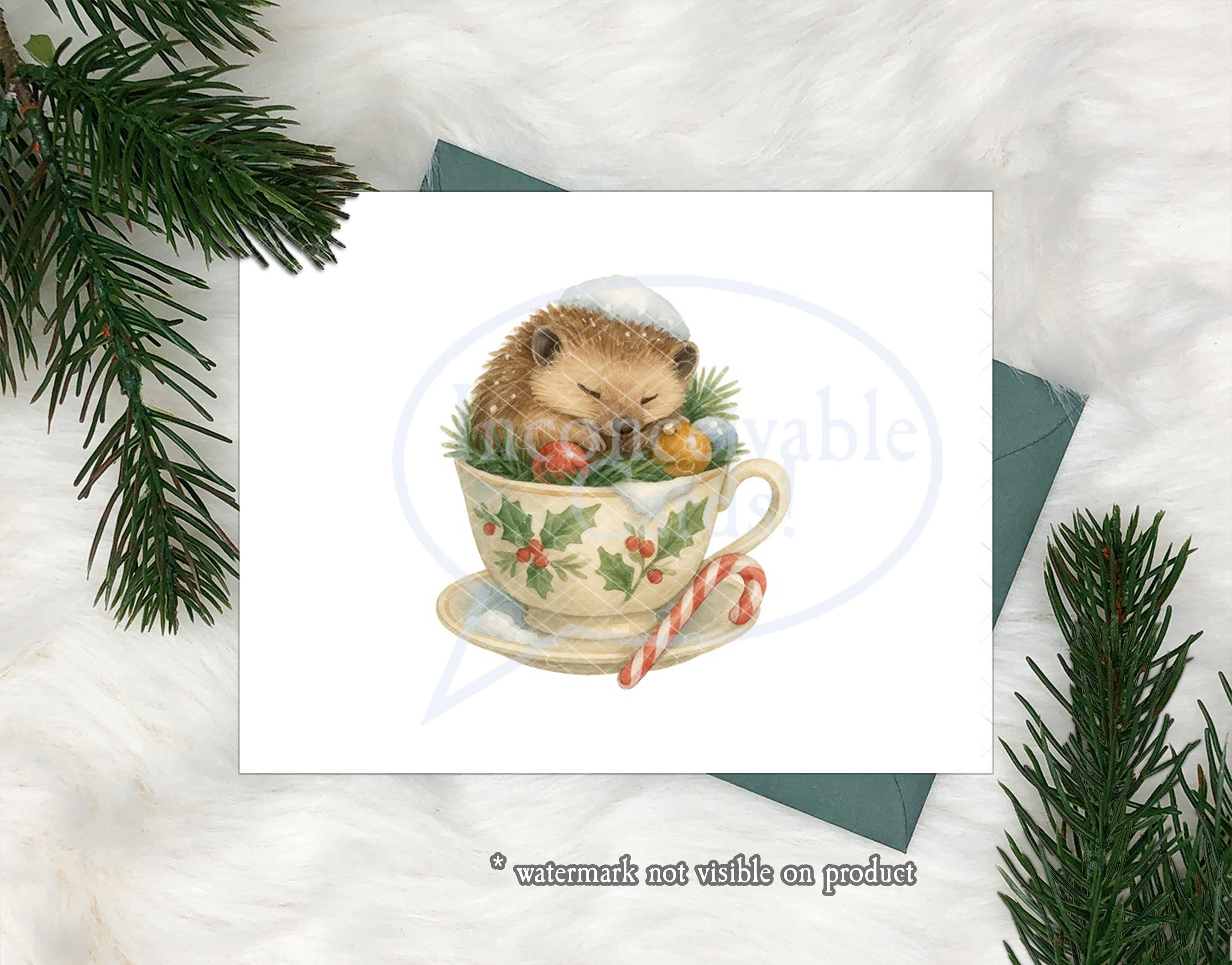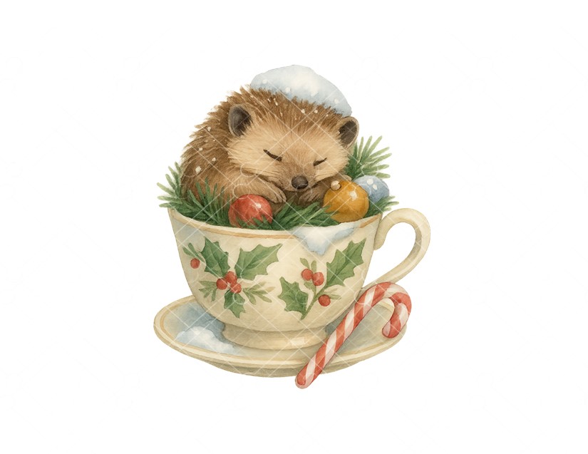 Description: Behold: the spirit of the holidays, perfectly captured in one hedgehog-sized power nap. Curled up in a holly-patterned teacup like a festive little emotional support burrito, this hedgehog knows exactly how to survive December—by sleeping through it.