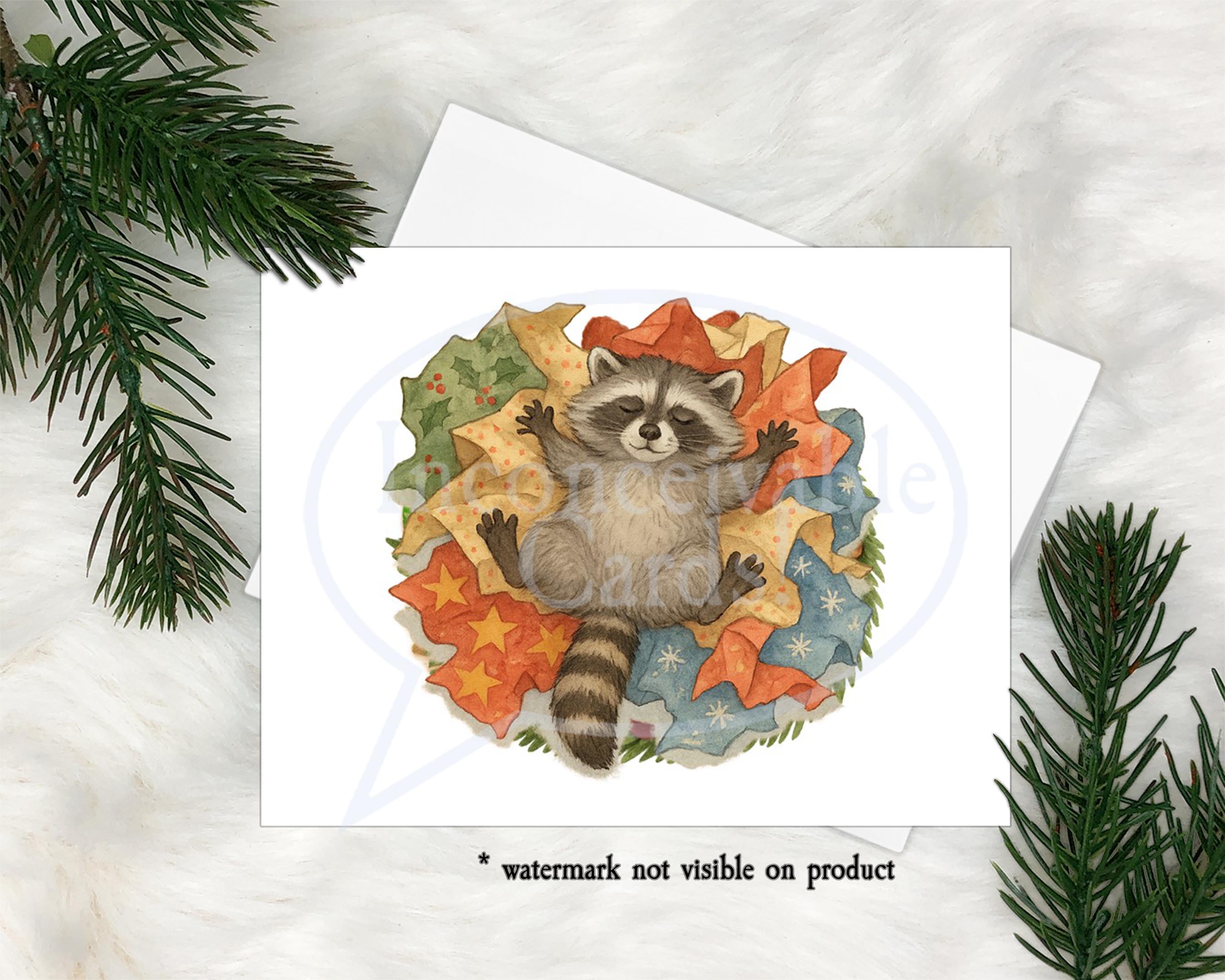Part of the Silent Night Series, this design features “Remy,” a sleepy raccoon blissfully snoozing in a pile of torn wrapping paper — the aftermath of a perfect holiday.