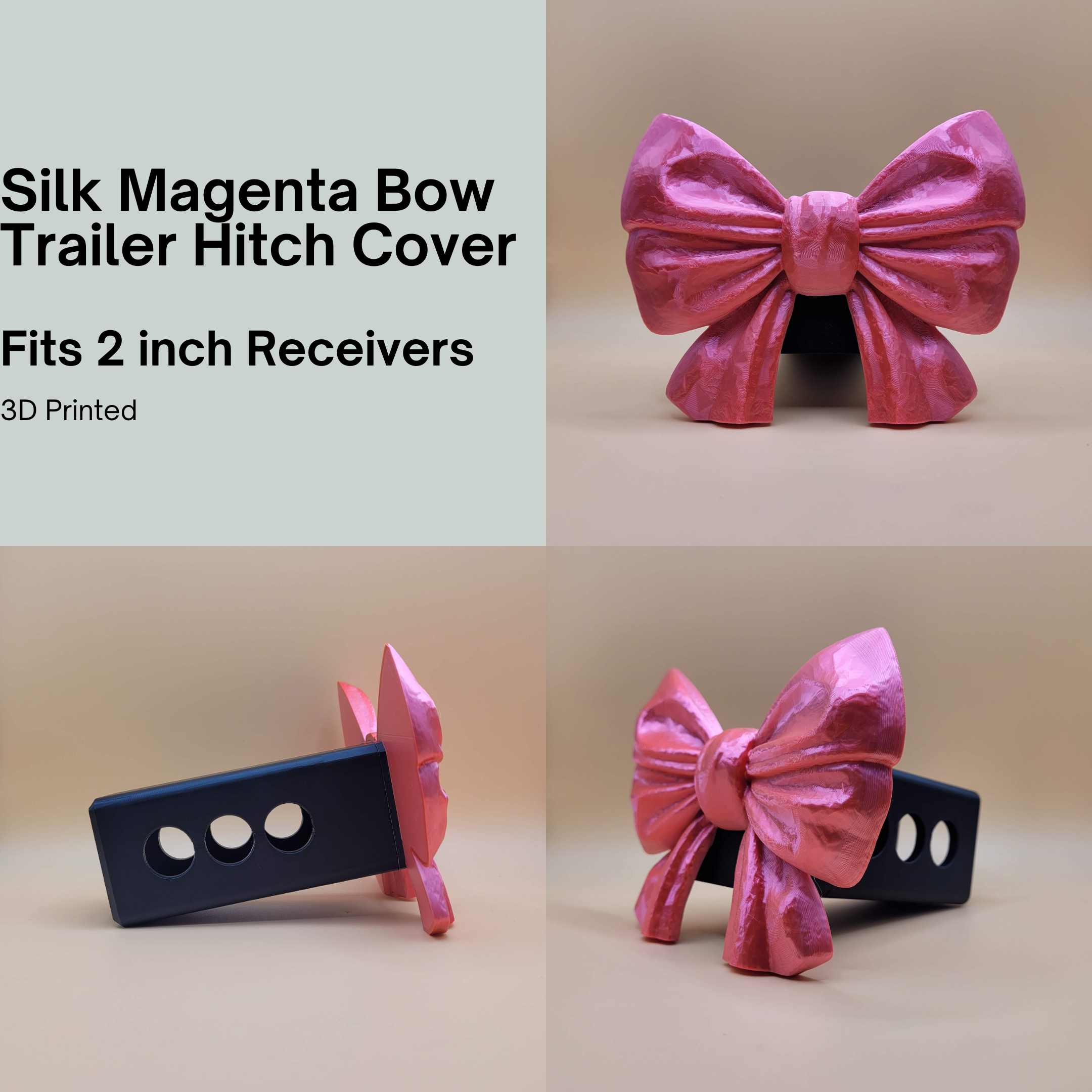 Add a touch of personality and style to your ride with this beautifully detailed Silk Magenta Bow Trailer Hitch Cover. Perfect for trucks, SUVs, and any vehicle with a standard 2-inch receiver, this 3D-printed hitch plug blends durability with customizable charm.