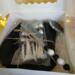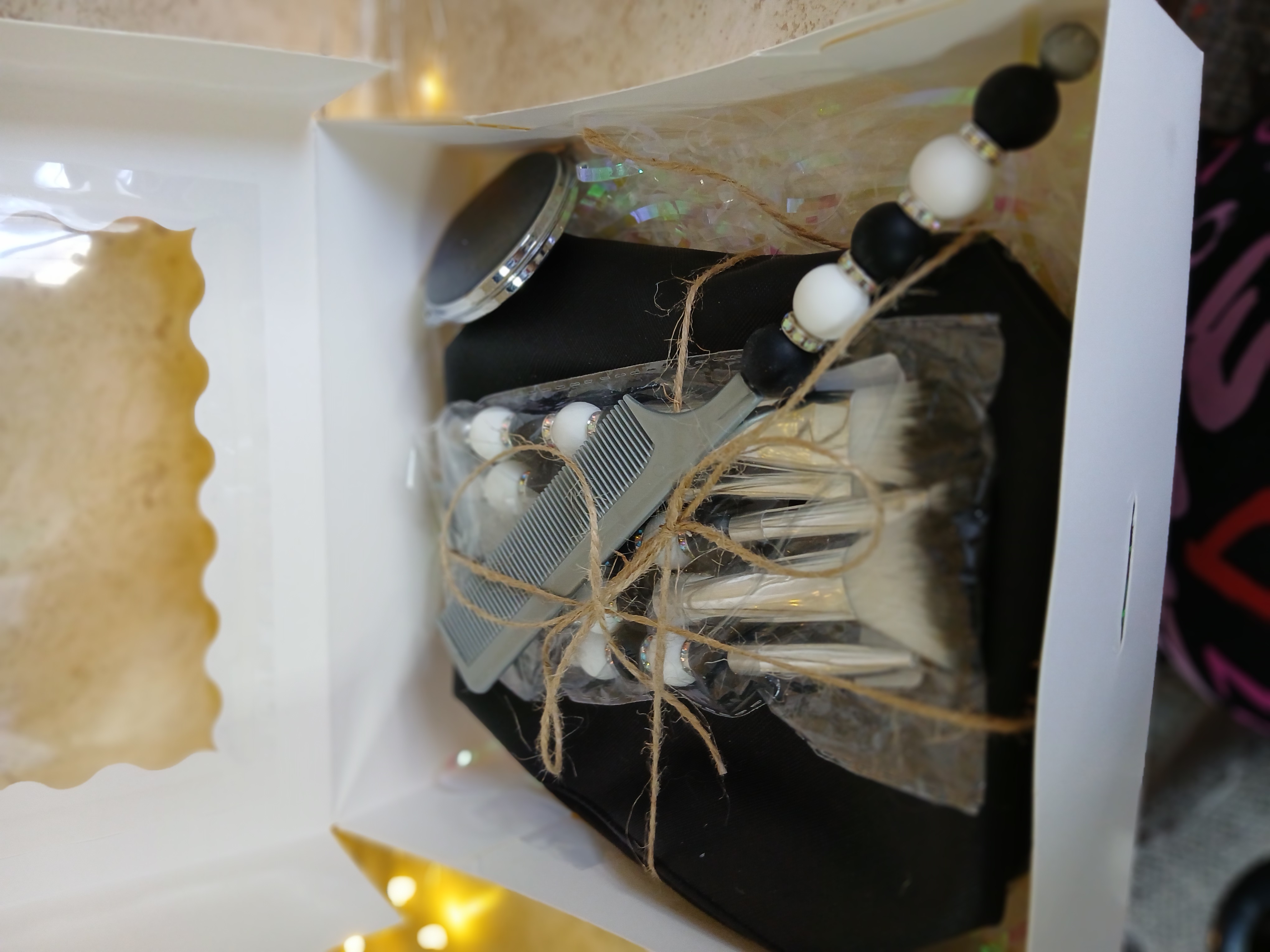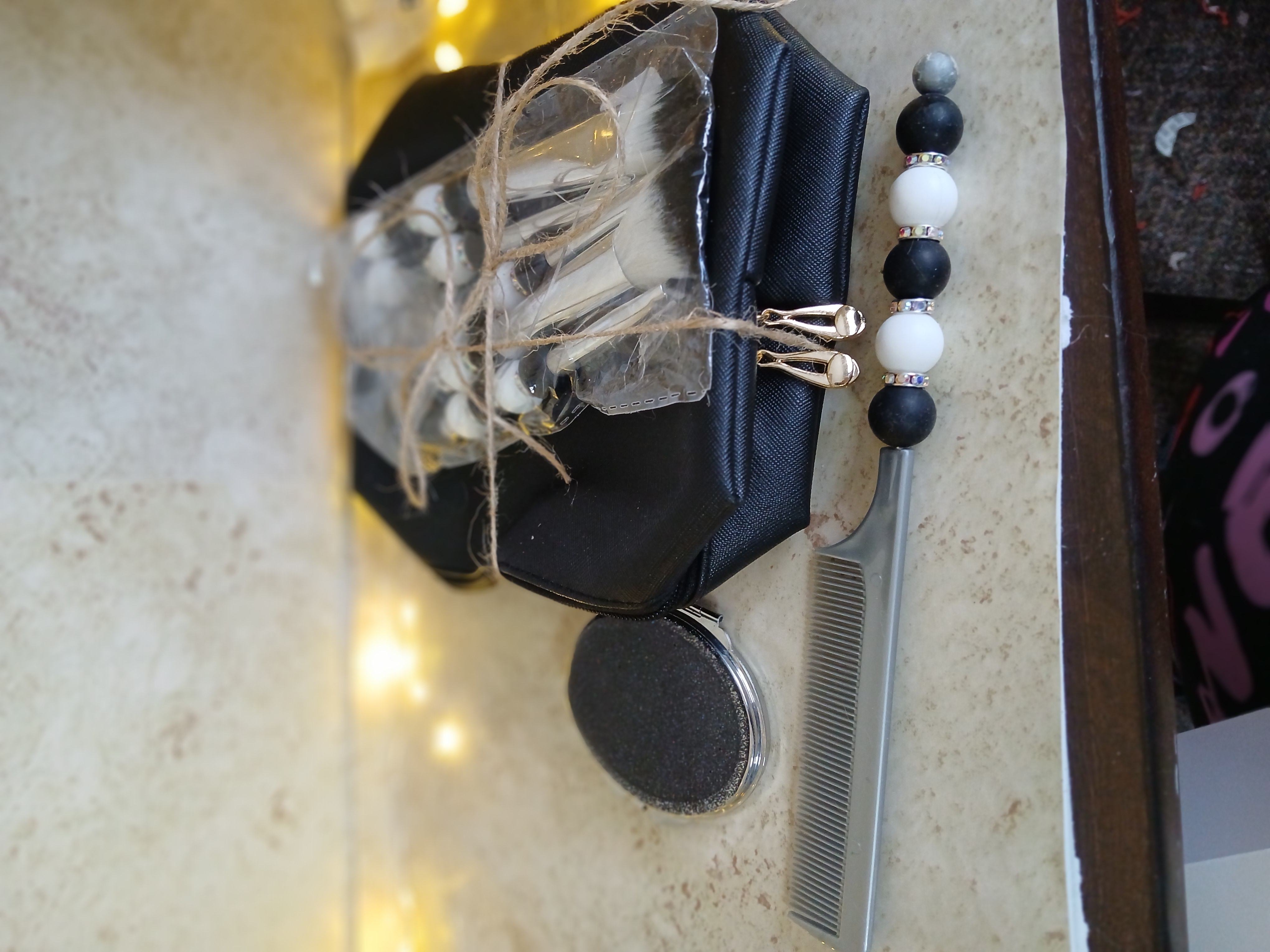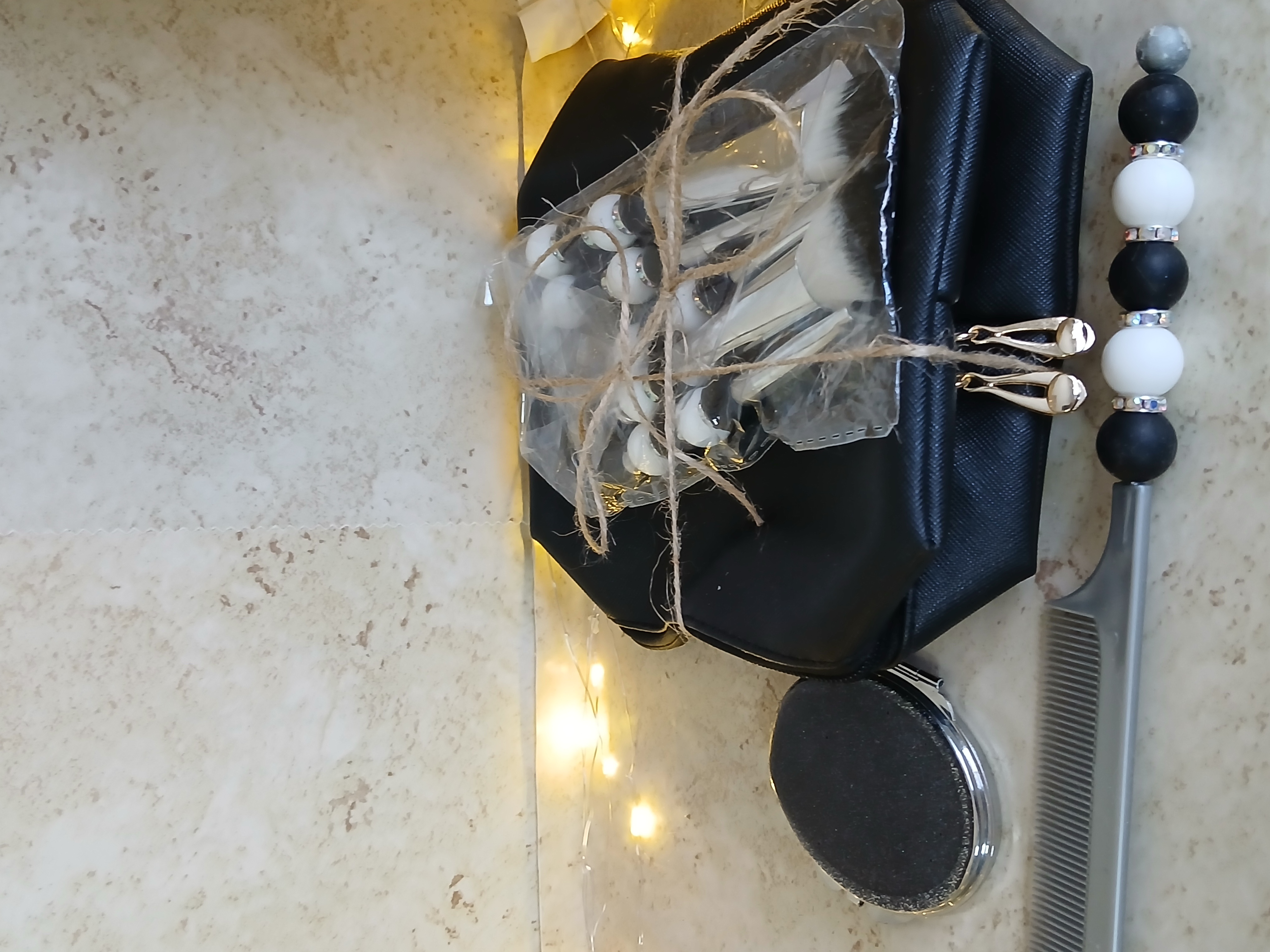 black silver and white together put them together in a quality 5pc makeup brush kt including the 5pc set with beaded handles and a comb with beaded handle a compact with black glitter resin top and a real leather large makeup bag