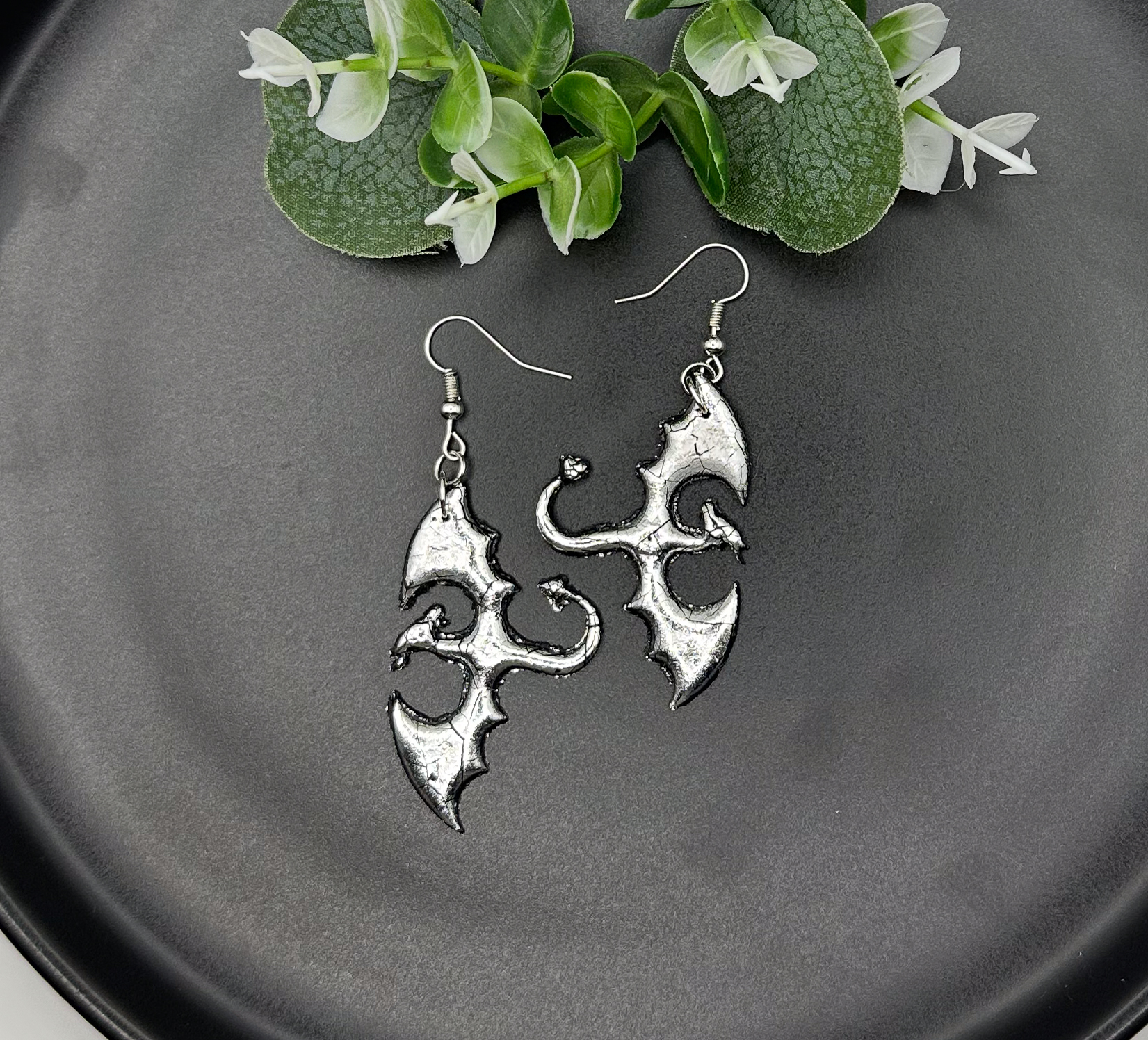 Unleash your inner adventurer! These handcrafted earrings feature bold dragon wing silhouettes in a shimmering silver finish, perfect for adding a touch of mythical magic to any outfit. Lightweight yet striking, they’re a must-have for fantasy lovers and statement jewelry fans.