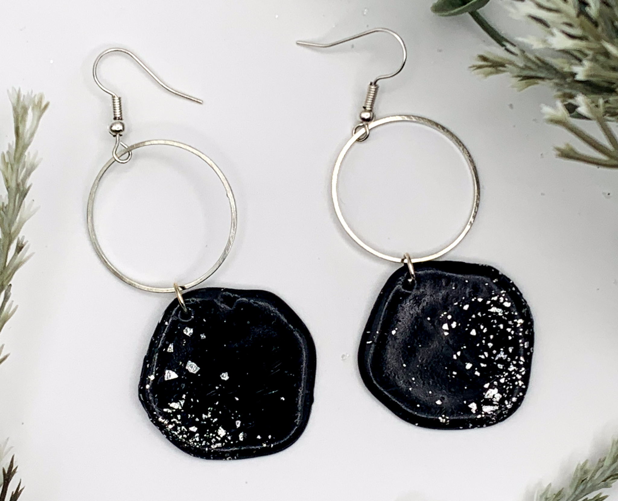 A cosmic dream come true! These round black clay charms with silver foil details are paired with sleek silver hoops for a modern celestial vibe.