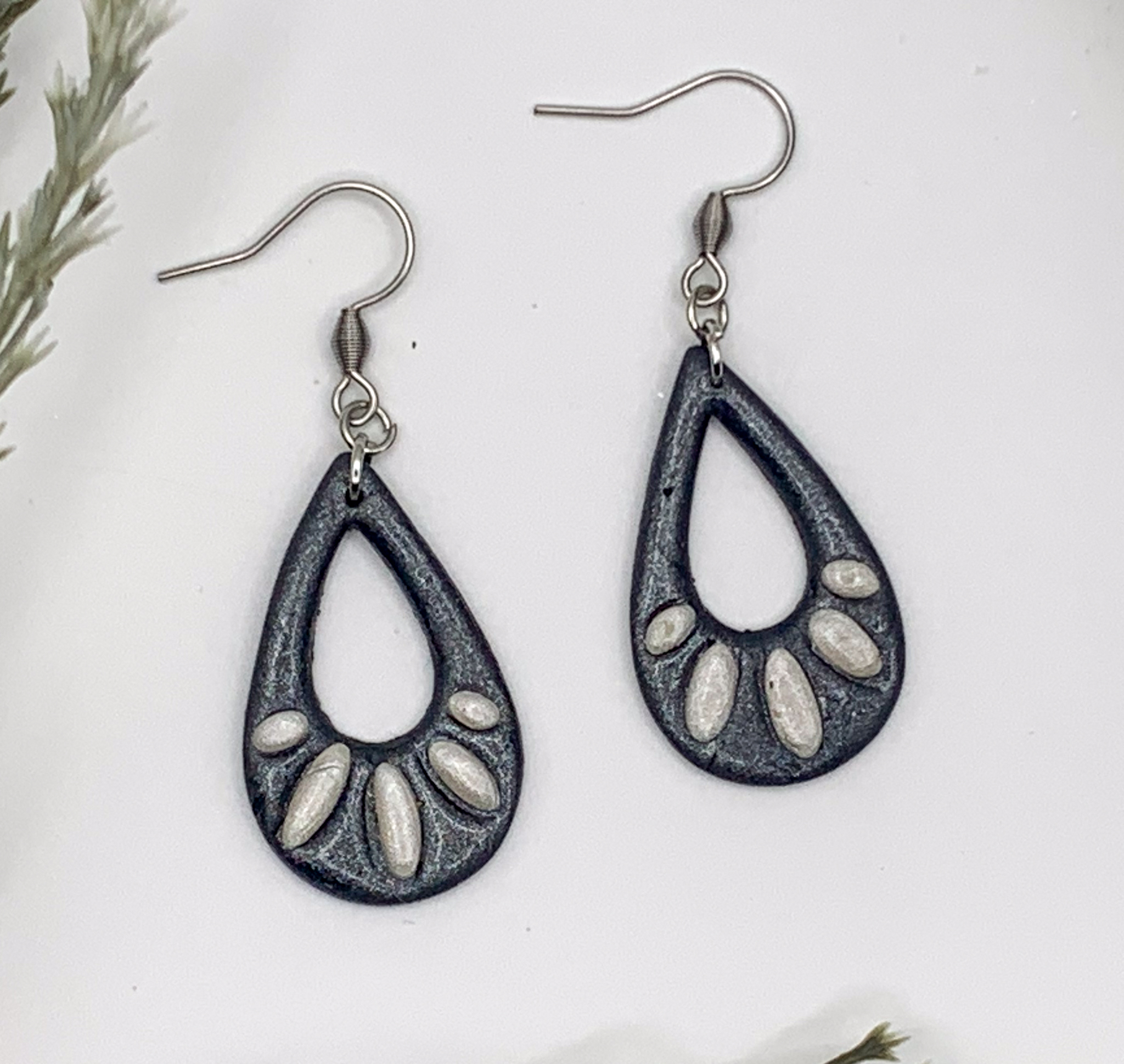 Sleek and sophisticated! These black clay teardrop earrings feature silver petal accents for a chic, nature-inspired look.