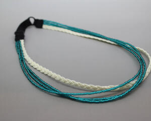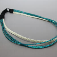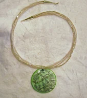 Four strands of pink and crystal seed beads make up this necklace holding a green shell pendant. This unique necklace is hand beaded and has silver plated spring ring clasp and findings. Beaded chain is approx 18" in length and the shell is approx 2" in diameter.