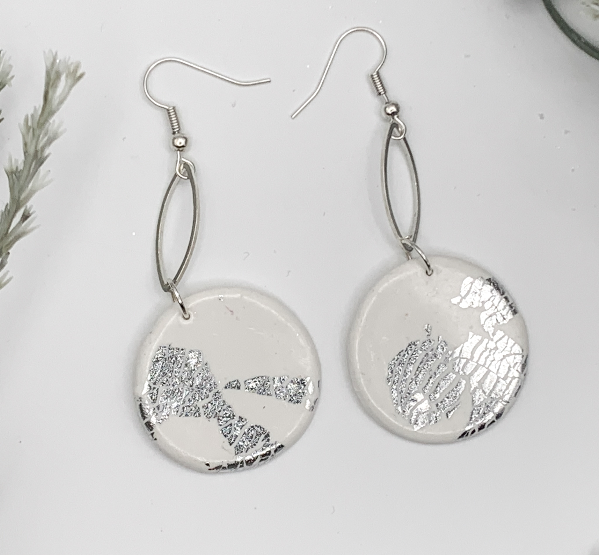 Understated elegance with a twist! These round clay earrings feature delicate silver foil accents and elongated oval connectors for a chic, airy look.
