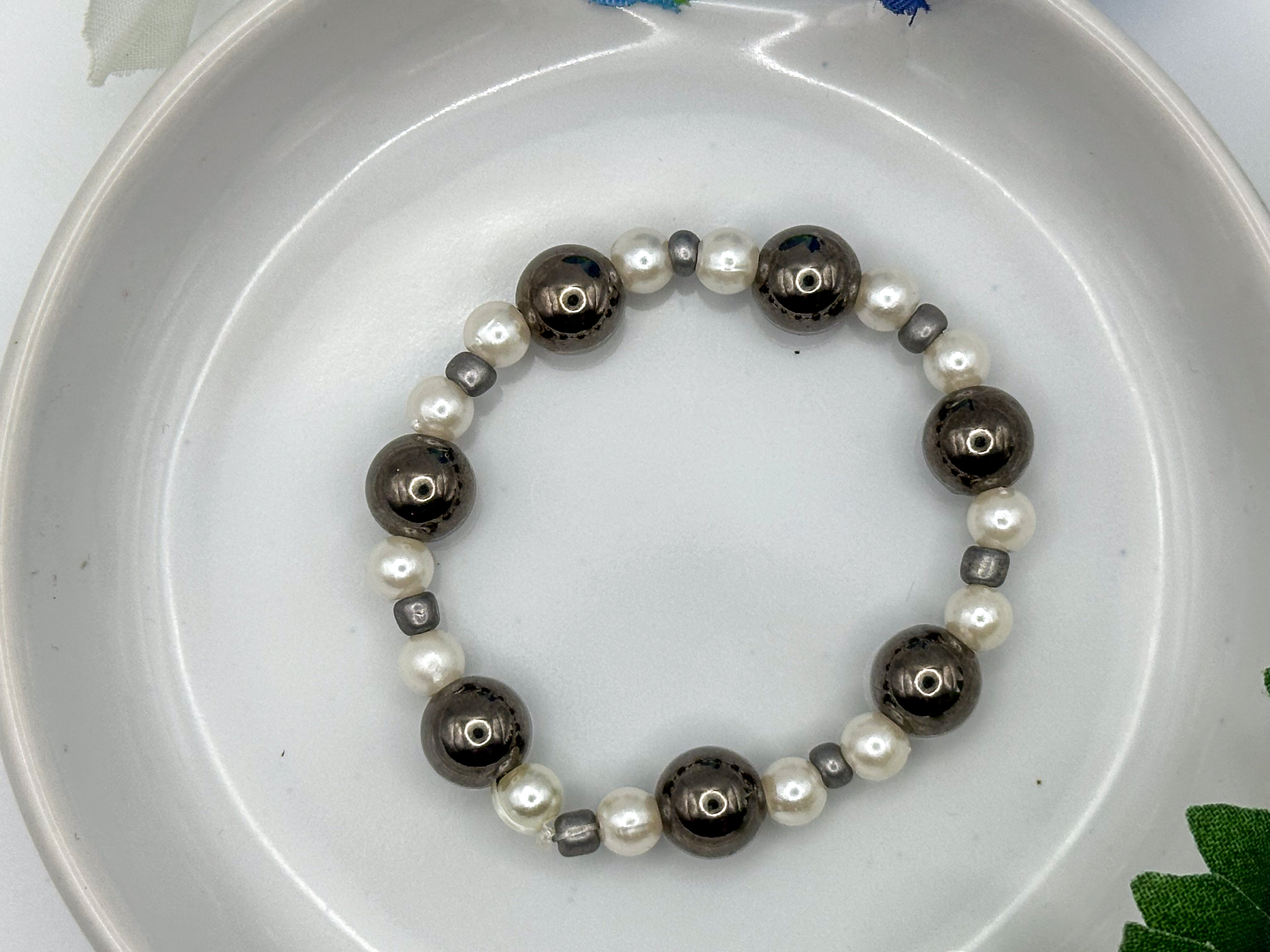 Silvered Moon Bracelet – Soft Pearls with Gunmetal Orbs