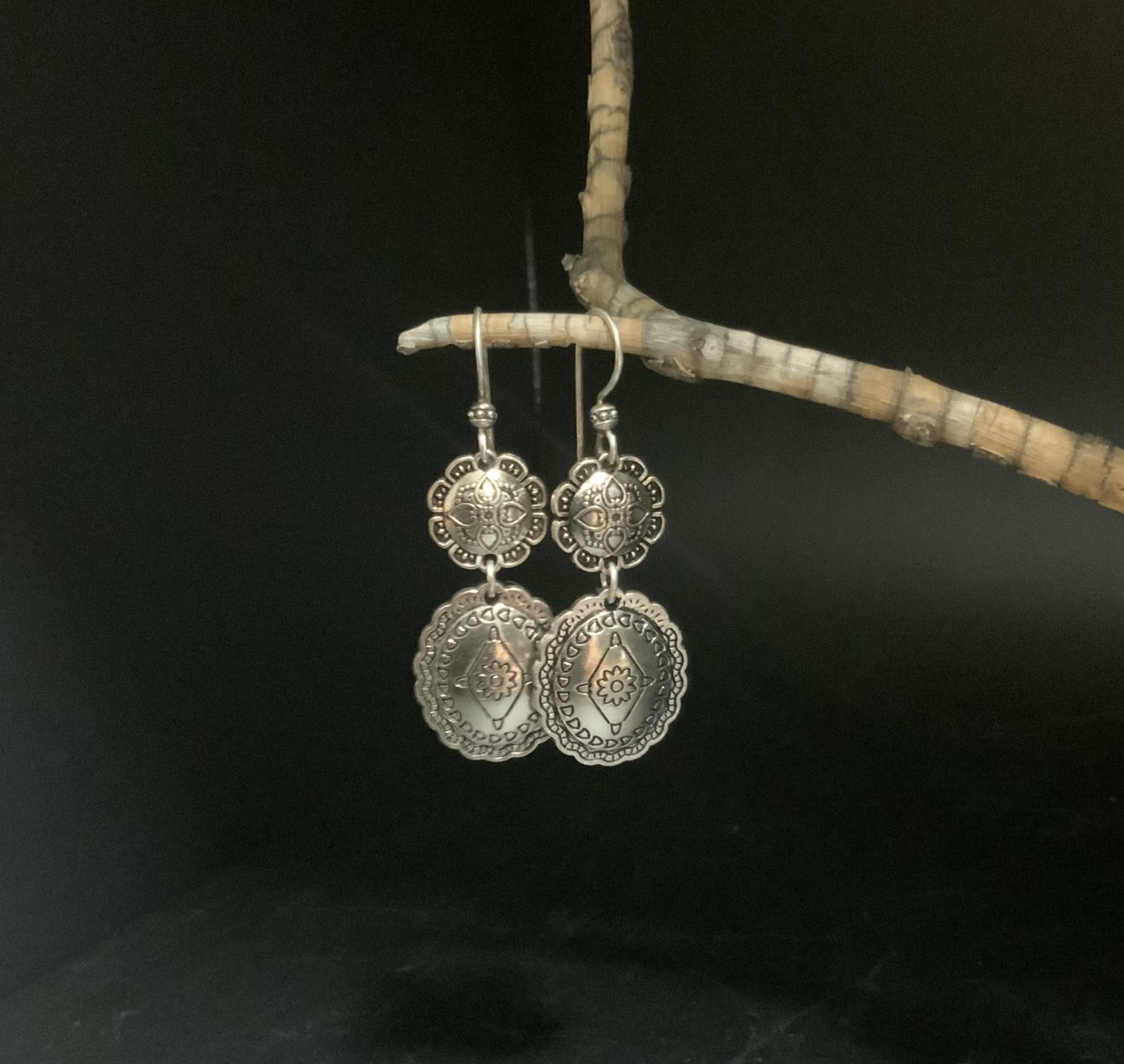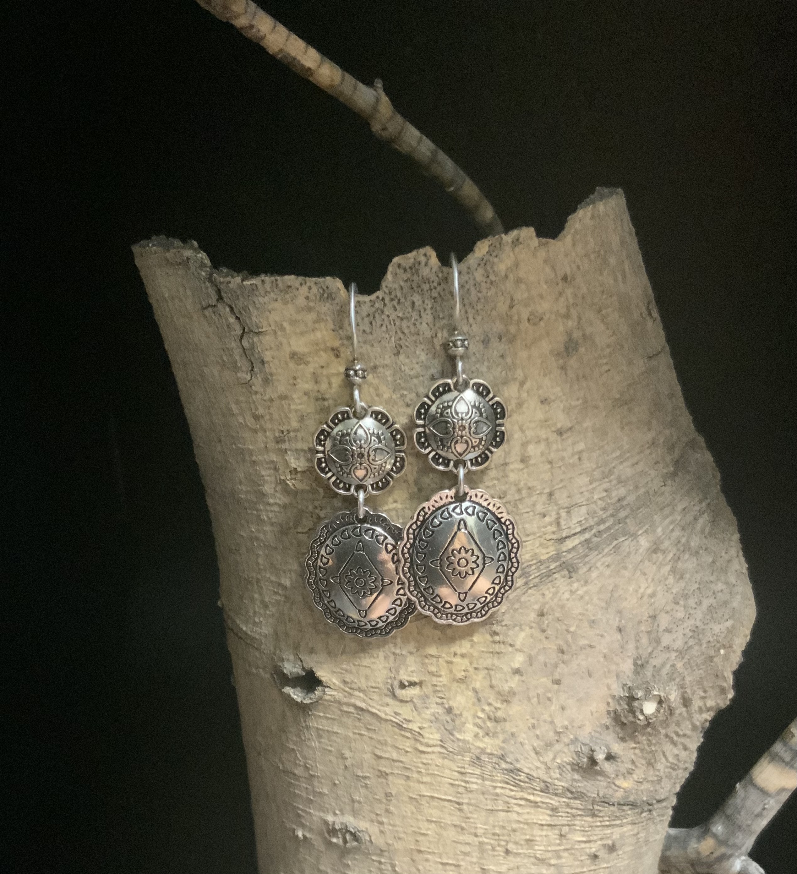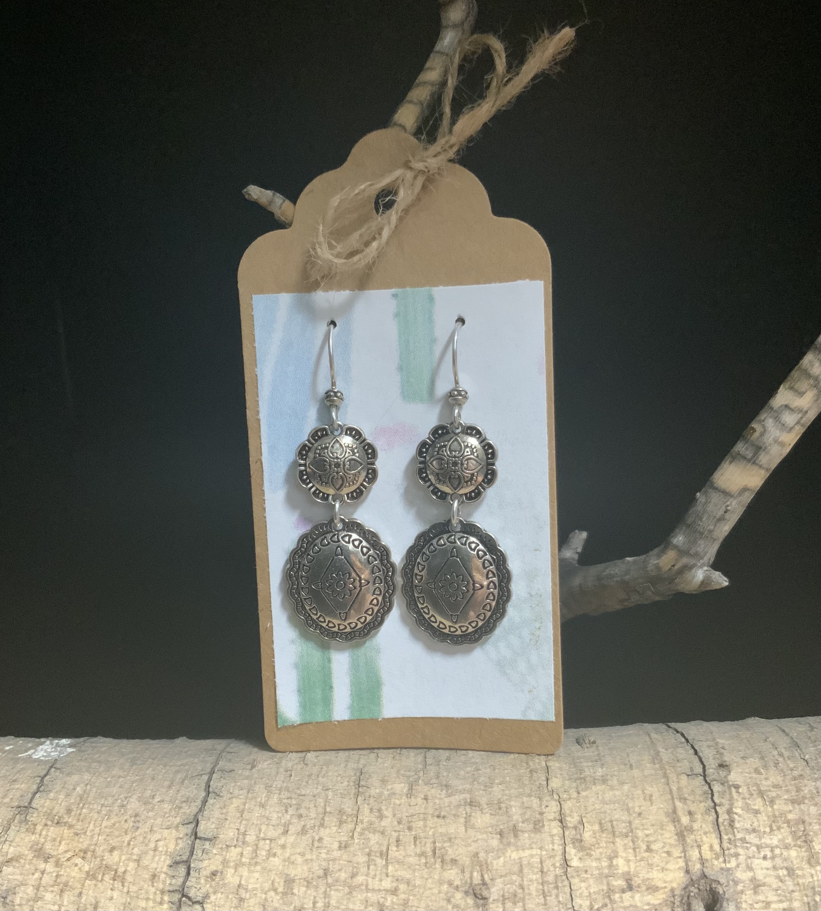 These concho earrings have handmade ear wires with silver fill wire. The two silver plated dangles are a concho style with different designs, giving them that southwest style. Each pair of earrings comes displayed on a handmade card.