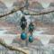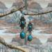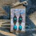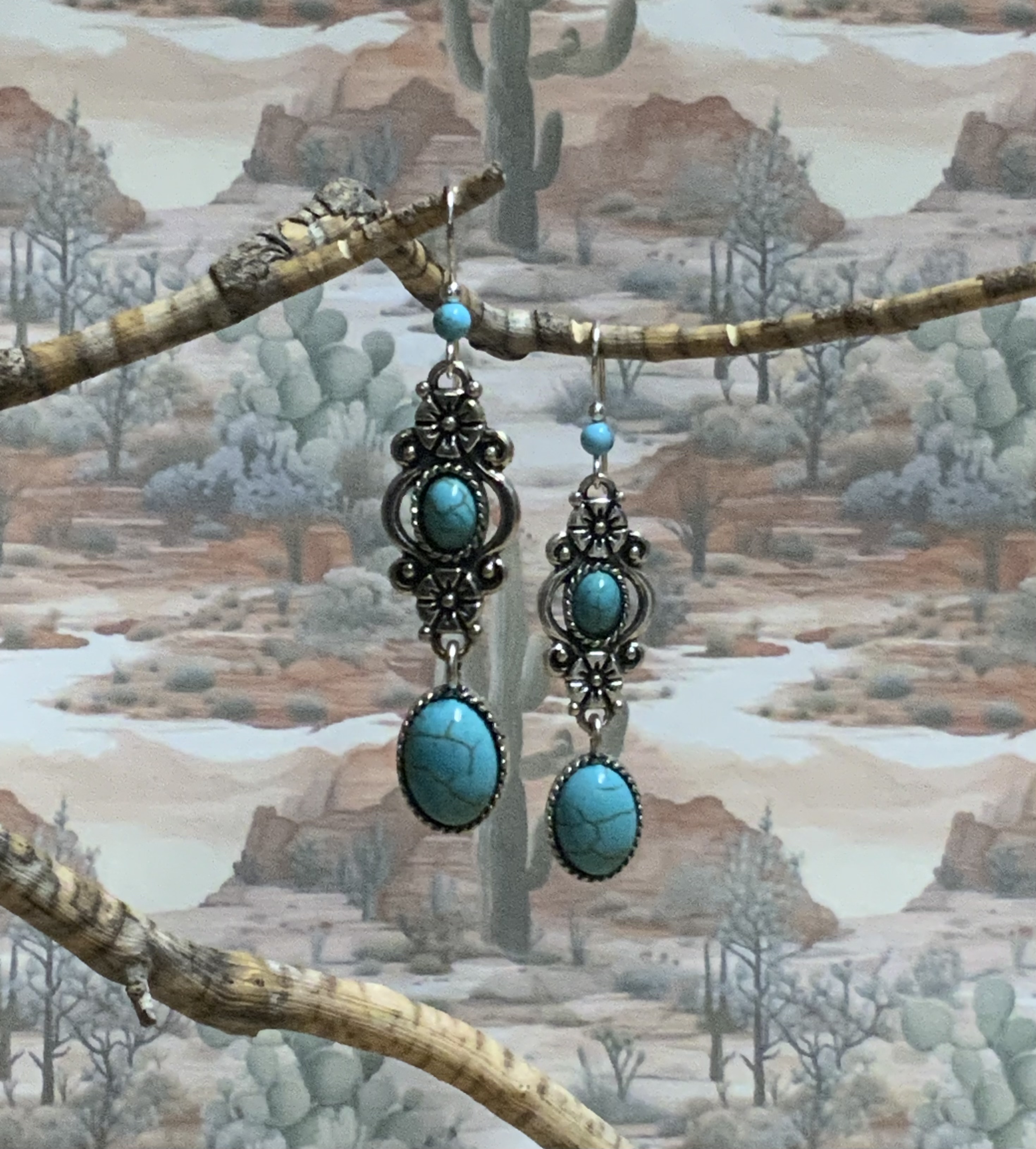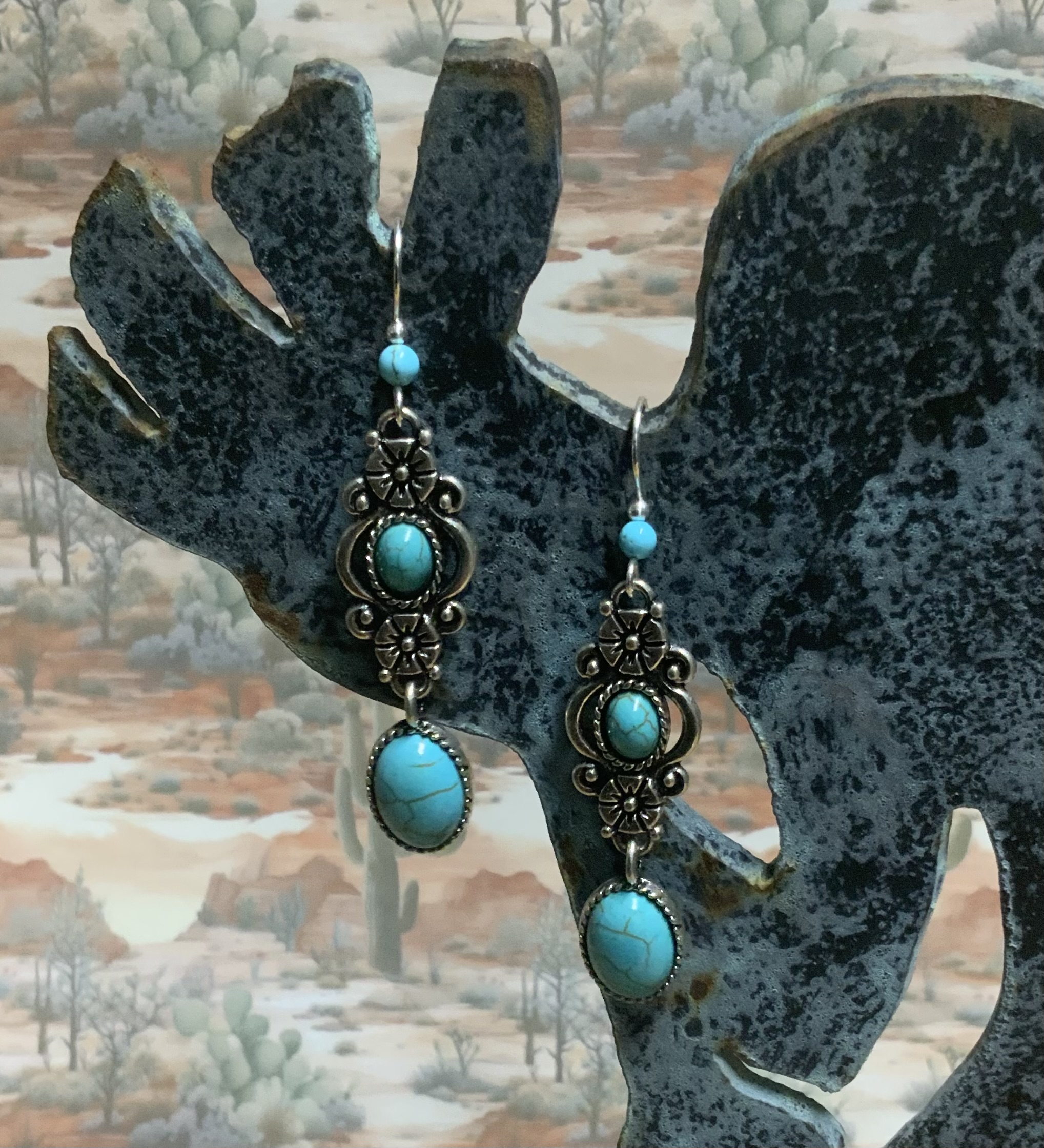 These southwest elegant looking earrings have handmade Silver Fill ear wires with 4mm turquoise Howlite beads. The dangle on these earrings have a more dressy look to them, great for a night out. The flower style dangle is silver plated with faux turquoise stones, Beautiful. Each pair of earrings comes displayed on a handmade card.