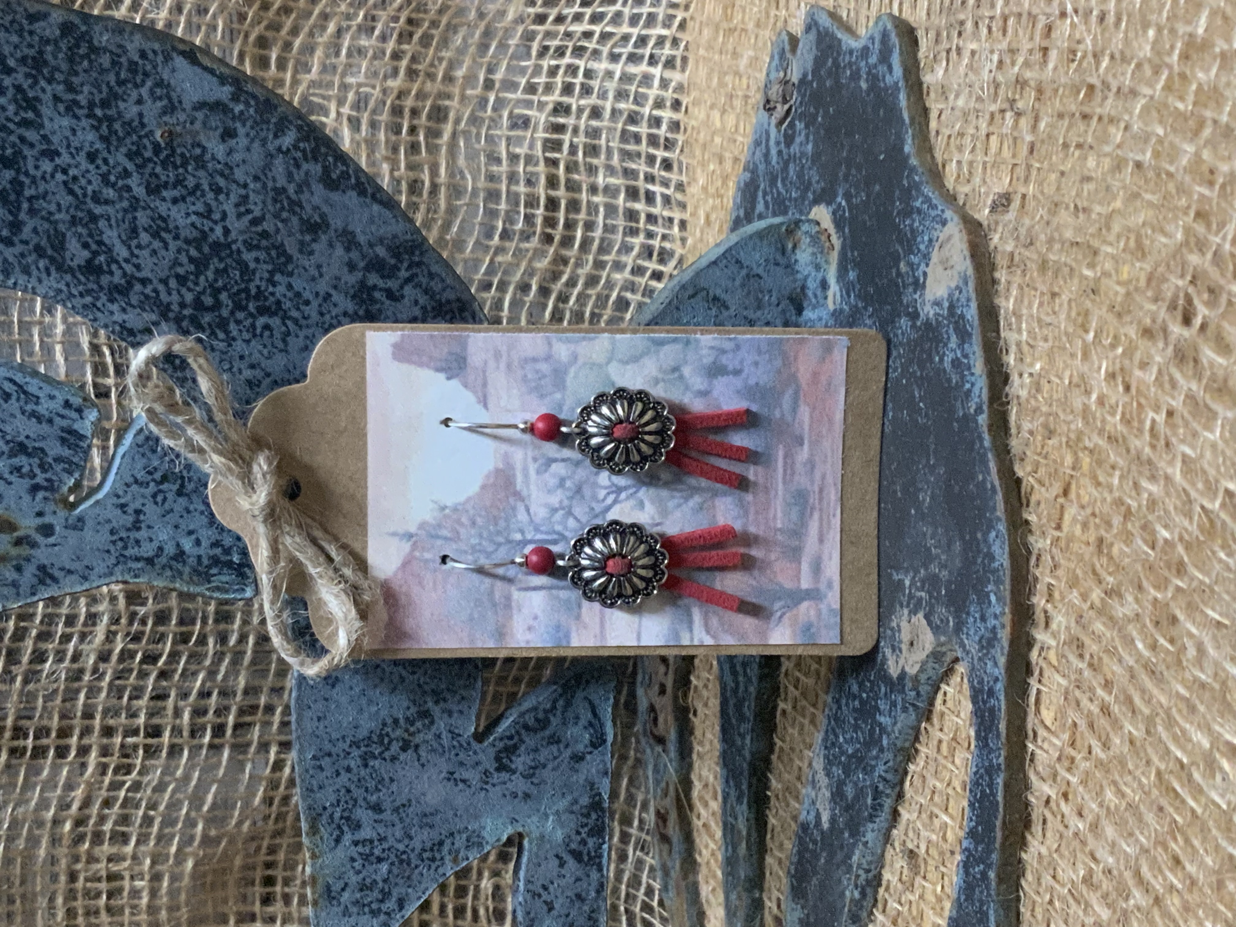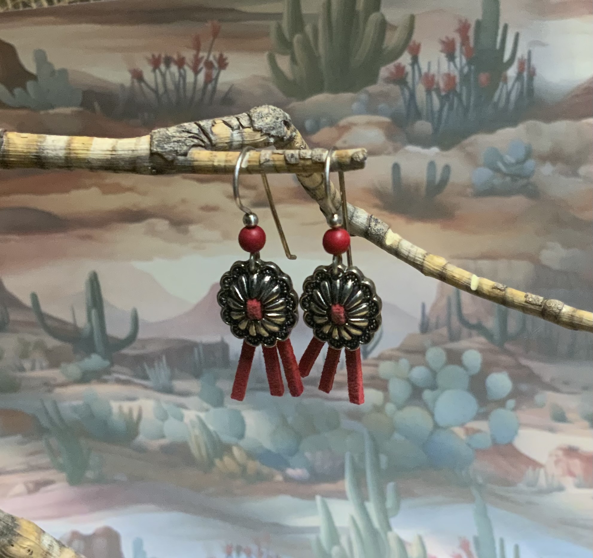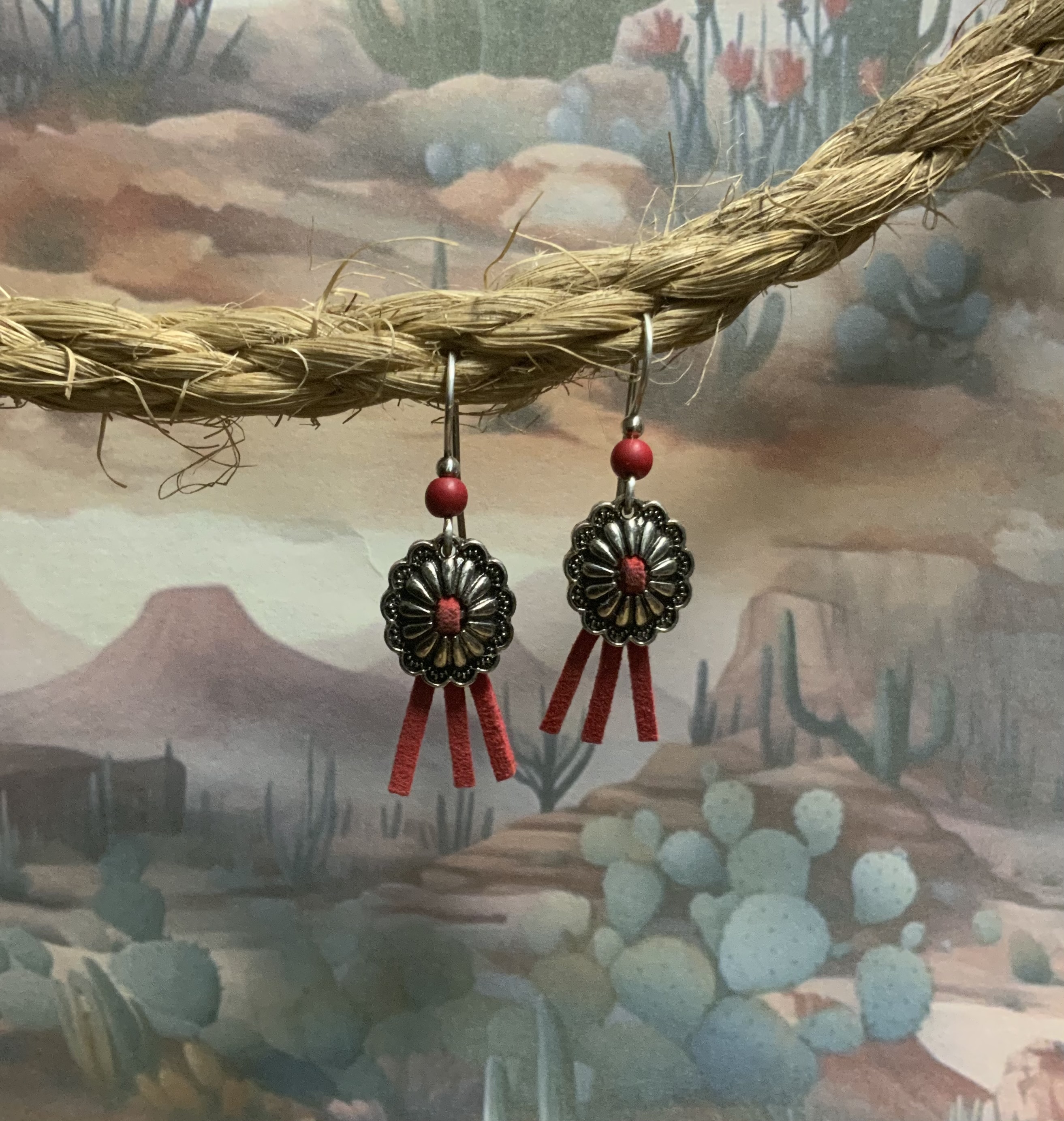 These southwest style earrings have handmade ear wires with silver fill wire and 4mm red howlite beads. The concho drop is silver plated with faux suede, attached to center. Each pair of earrings comes displayed on a handmade card.