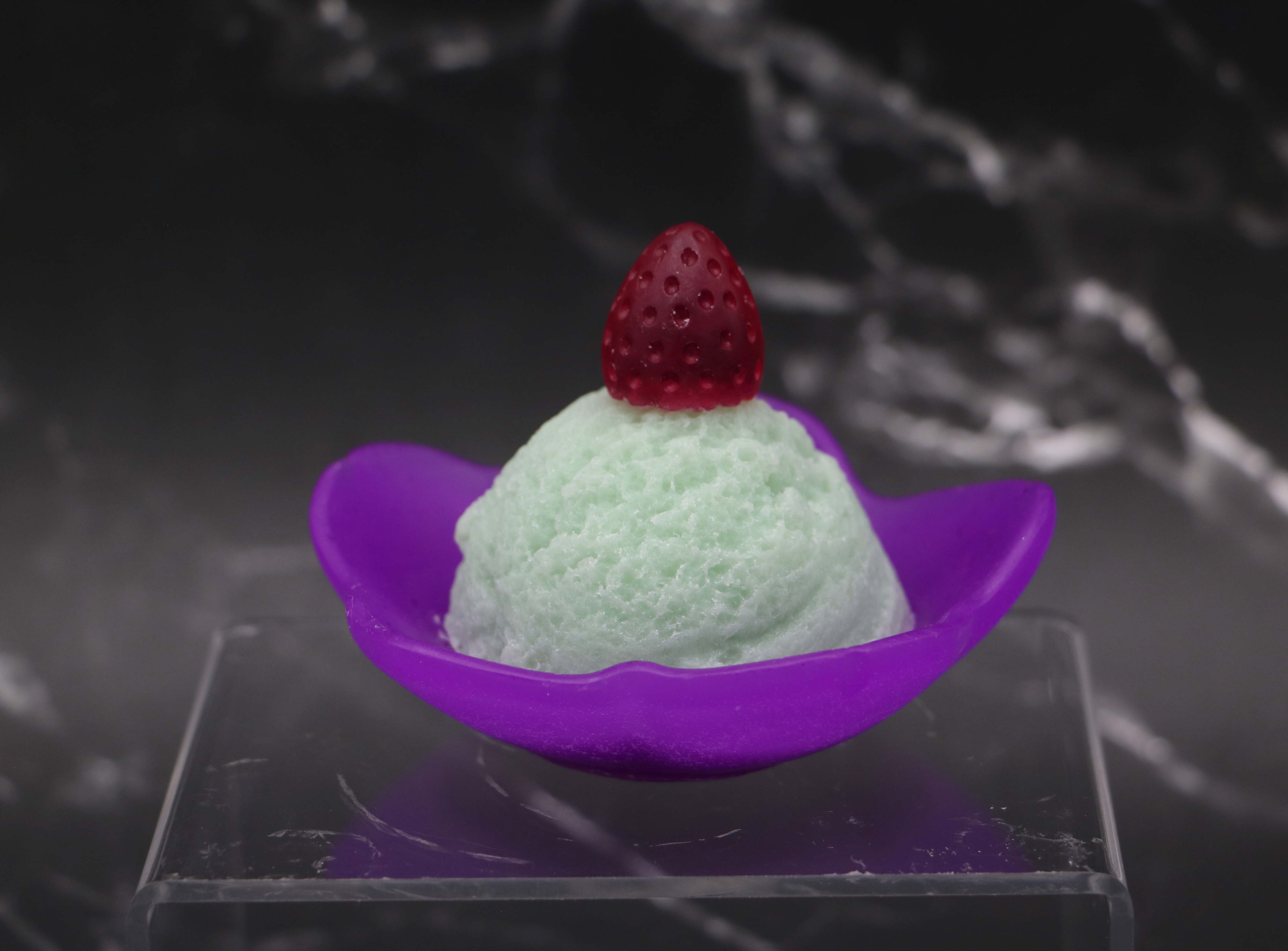 The construction of this soap takes place in several stages with 5 different soap molds. If an Ice Cream "Flavor" is selected, I use my white shea butter soap base. Otherwise, all other soaps are made using my premium extra clear glycerin soap because the colors will be brighter/vibrant. I prepare the soap for the Ice Cream/Sherbet scoop with the customers requested color and fragrance & pour it into the soap mold to harden. I then prepare soap for the dish and spoon & pour that into the molds. Next is the Cookie. And finally, the strawberry on top of the Ice Cream scoop.