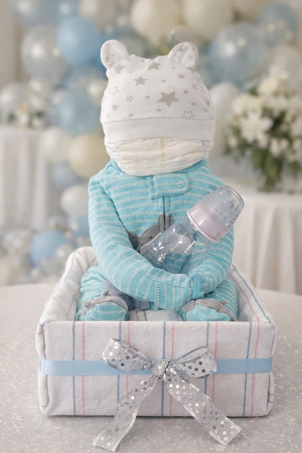 This adorable baby diaper cake bassinet is a beautiful and practical centerpiece, thoughtfully handcrafted to celebrate a new arrival. Designed to look like a cozy little bed, this gift is both eye-catching and useful for new parents.