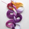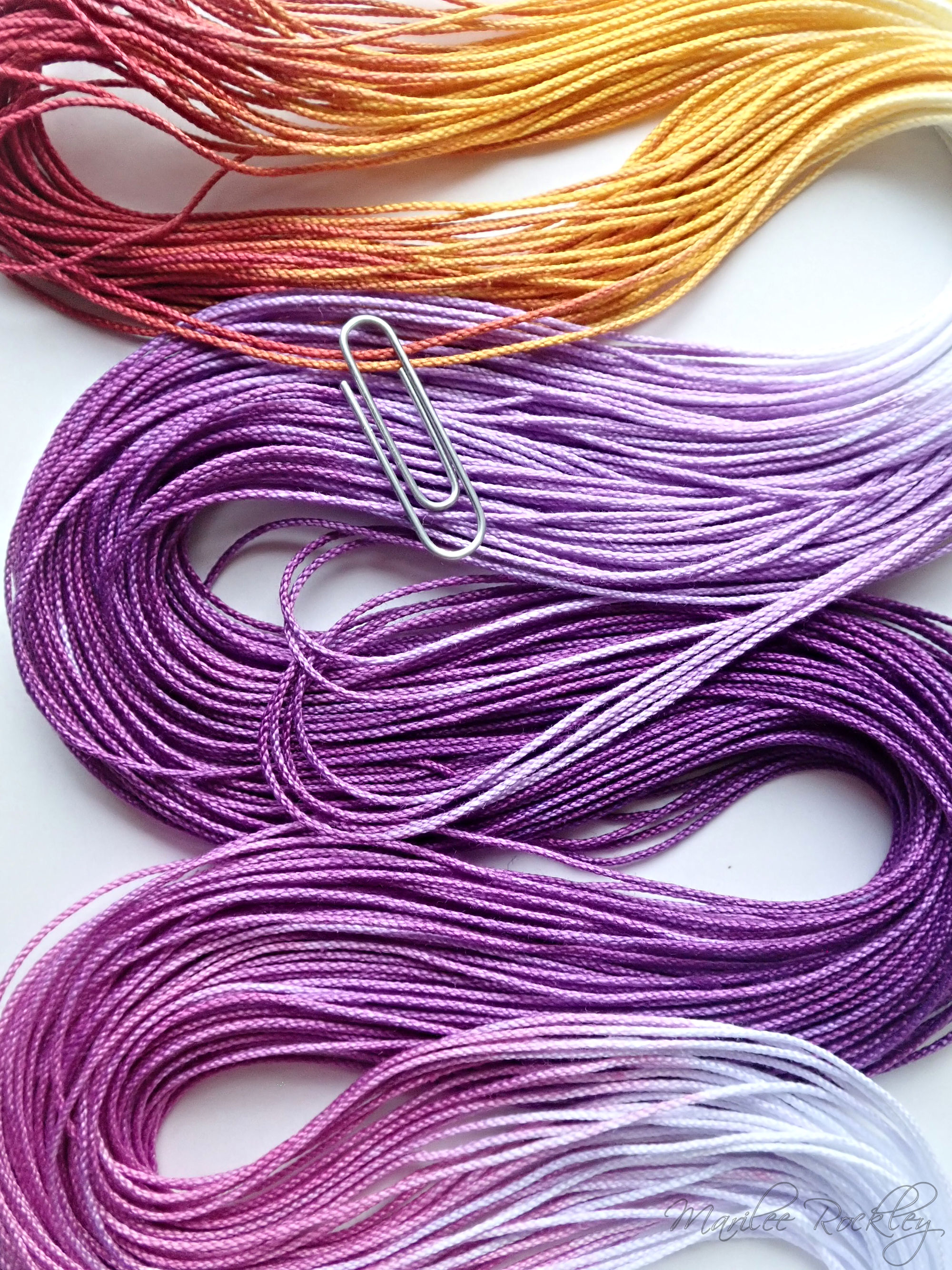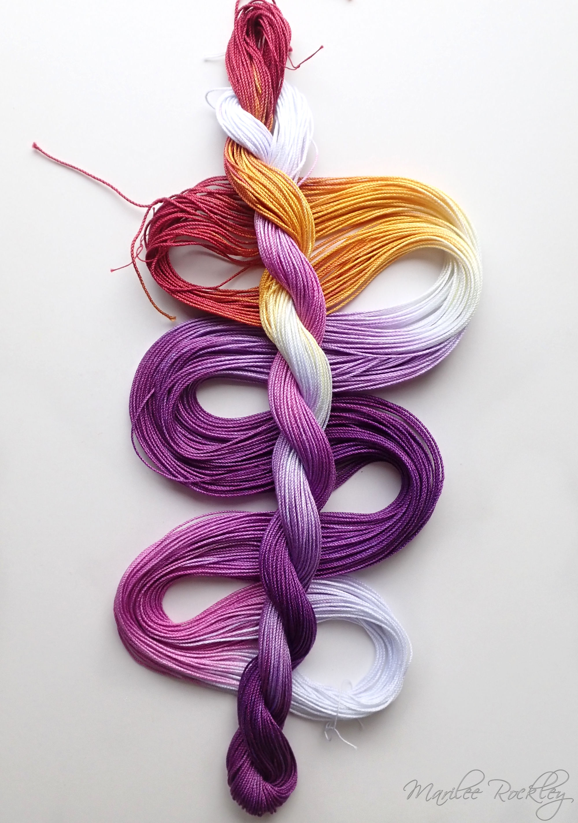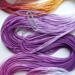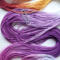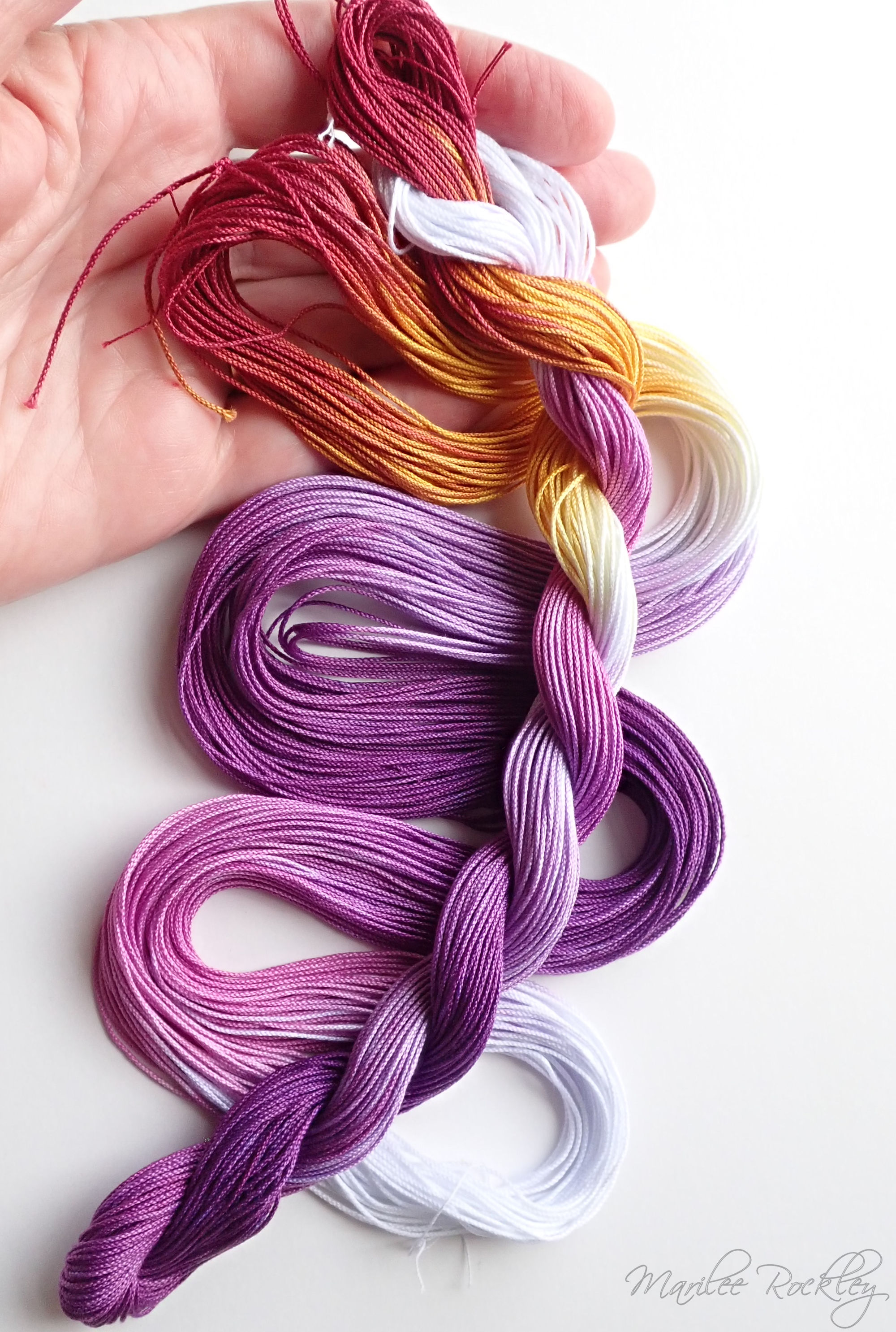 The base thread is Lizbeth, which is 100% Egyptian cotton. It is super-combed, gas-singed, mercerized, very strong, tightly twisted, lustrous, hard-wearing thread suitable for heirlooms, wearables, and decorative designs. I used Procion MX dyes to hand paint it. This is a lovely thread for tatting or other lace work.
