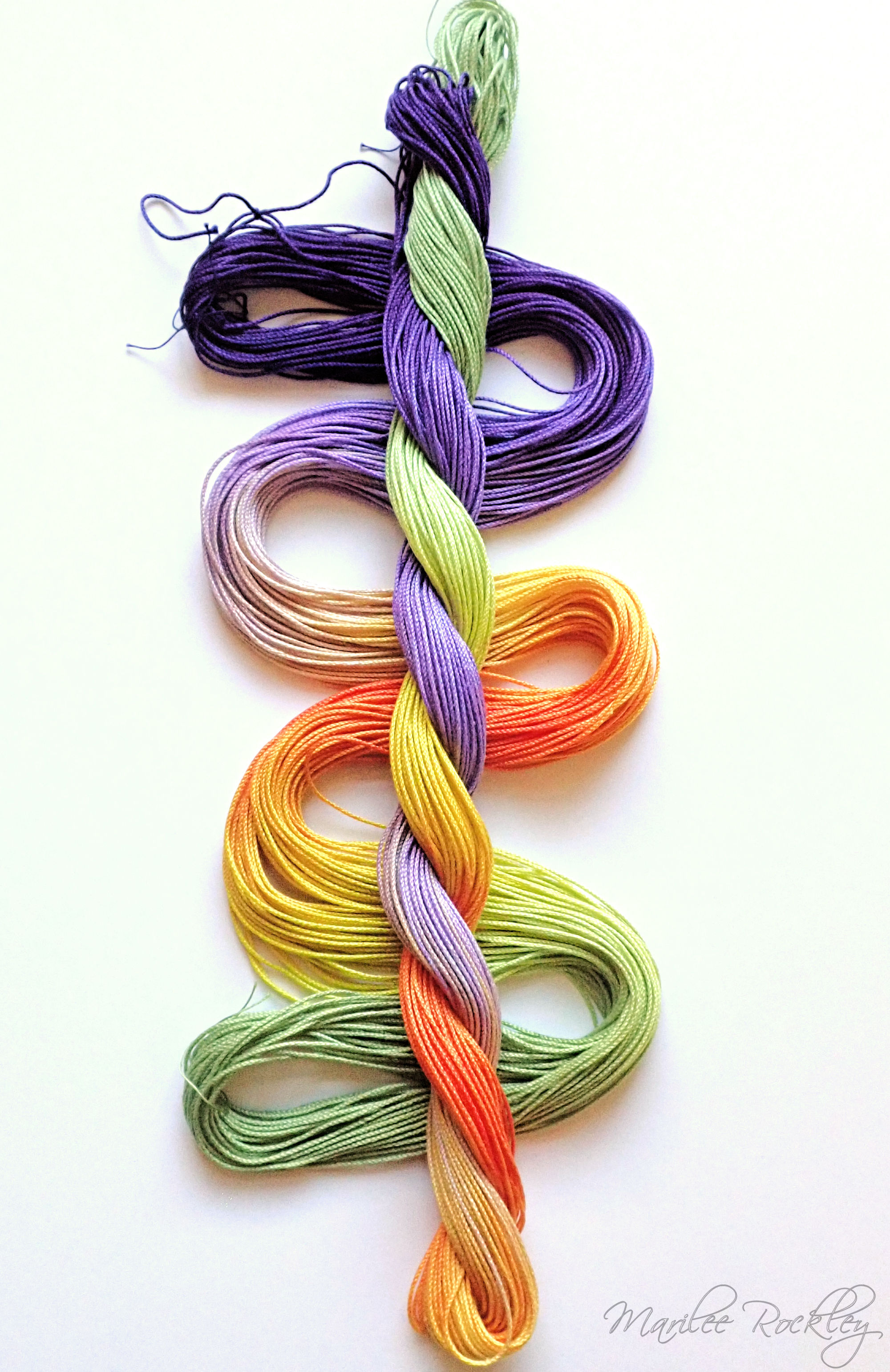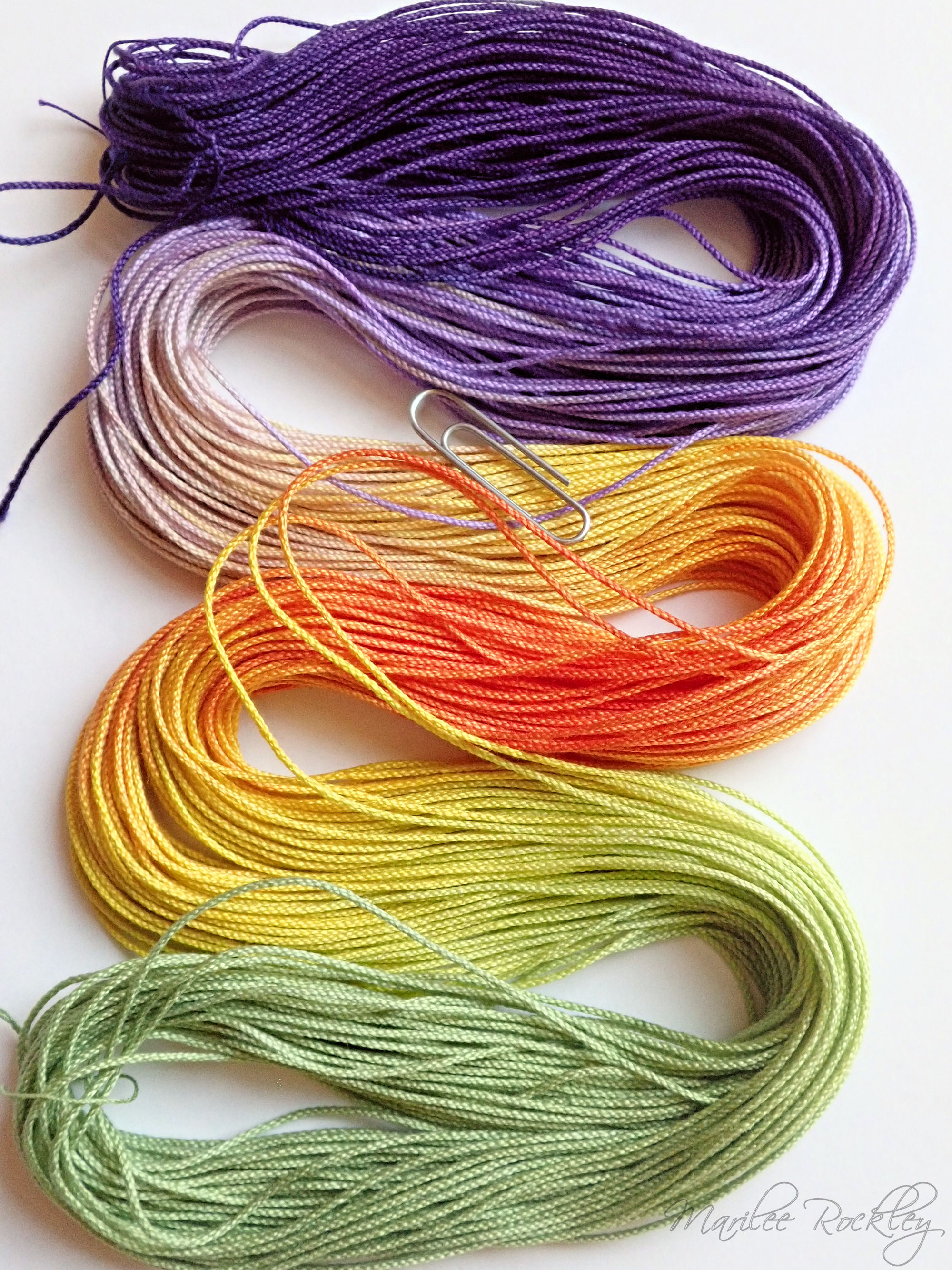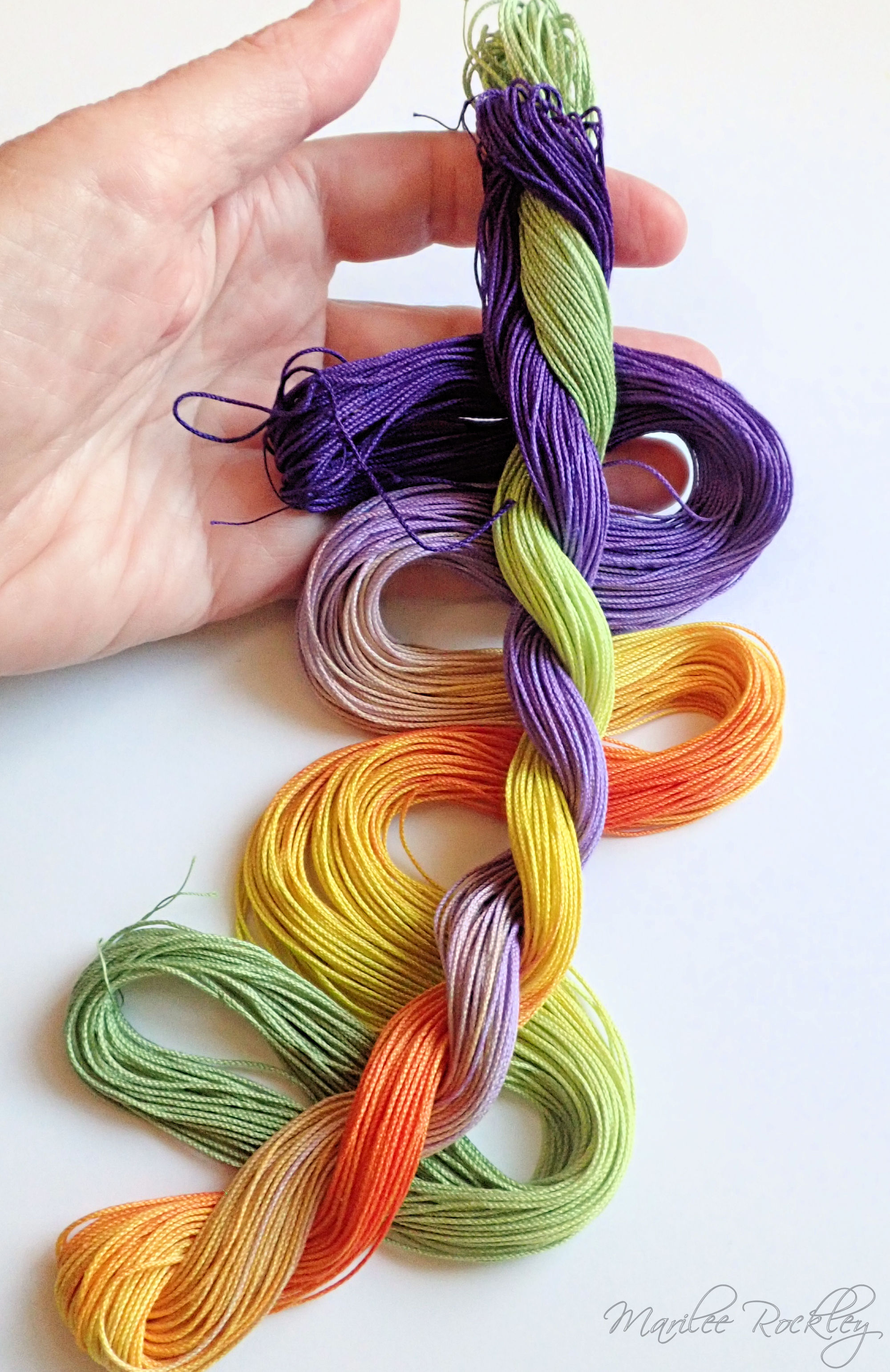 The base thread is Lizbeth, which is 100% Egyptian cotton. It is super-combed, gas-singed, mercerized, very strong, tightly twisted, lustrous, hard-wearing thread suitable for heirlooms, wearables, and decorative designs. I used Procion MX dyes to hand paint it. This is a lovely thread for tatting or other lace work.