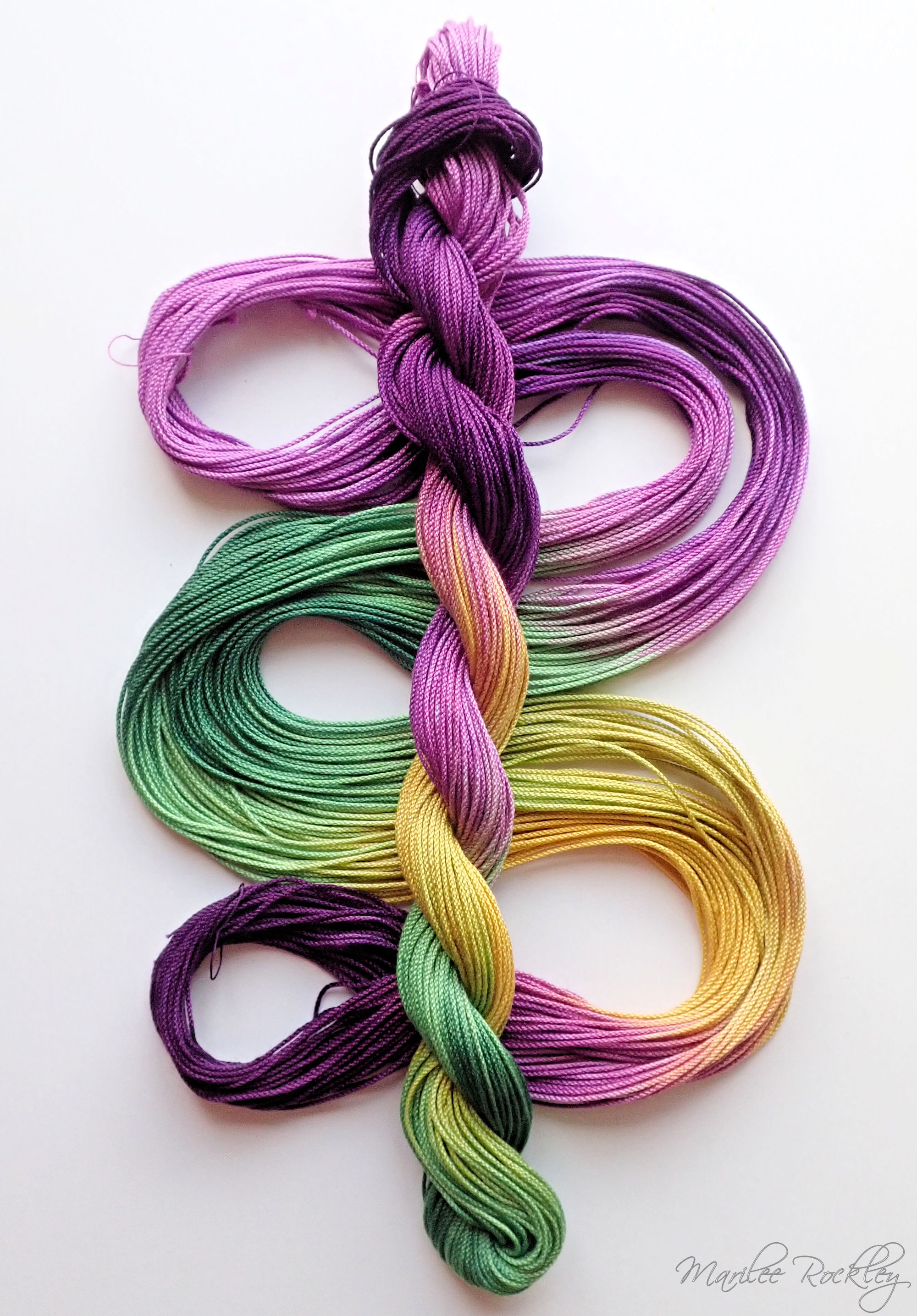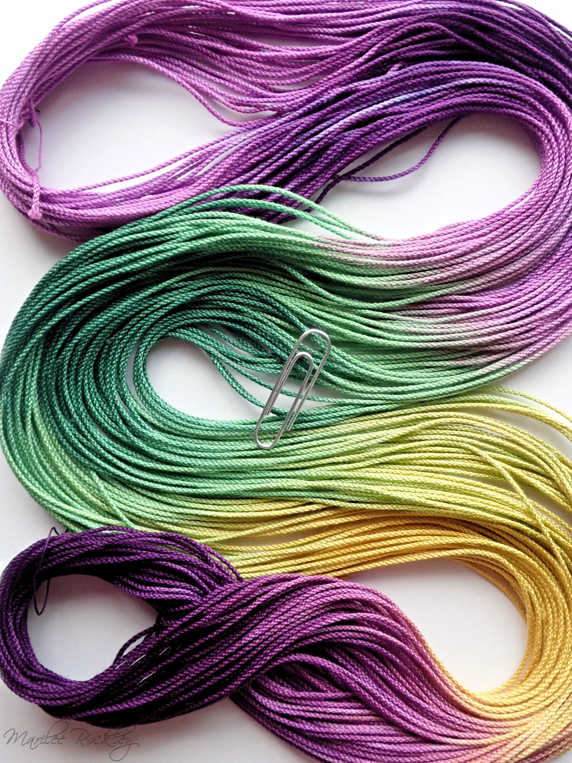 The base thread is Lizbeth, which is 100% Egyptian cotton. It is super-combed, gas-singed, mercerized, very strong, tightly twisted, lustrous, hard-wearing thread suitable for heirlooms, wearables, and decorative designs. I used Procion MX dyes to hand paint it. This is a lovely thread for tatting or other lace work.