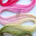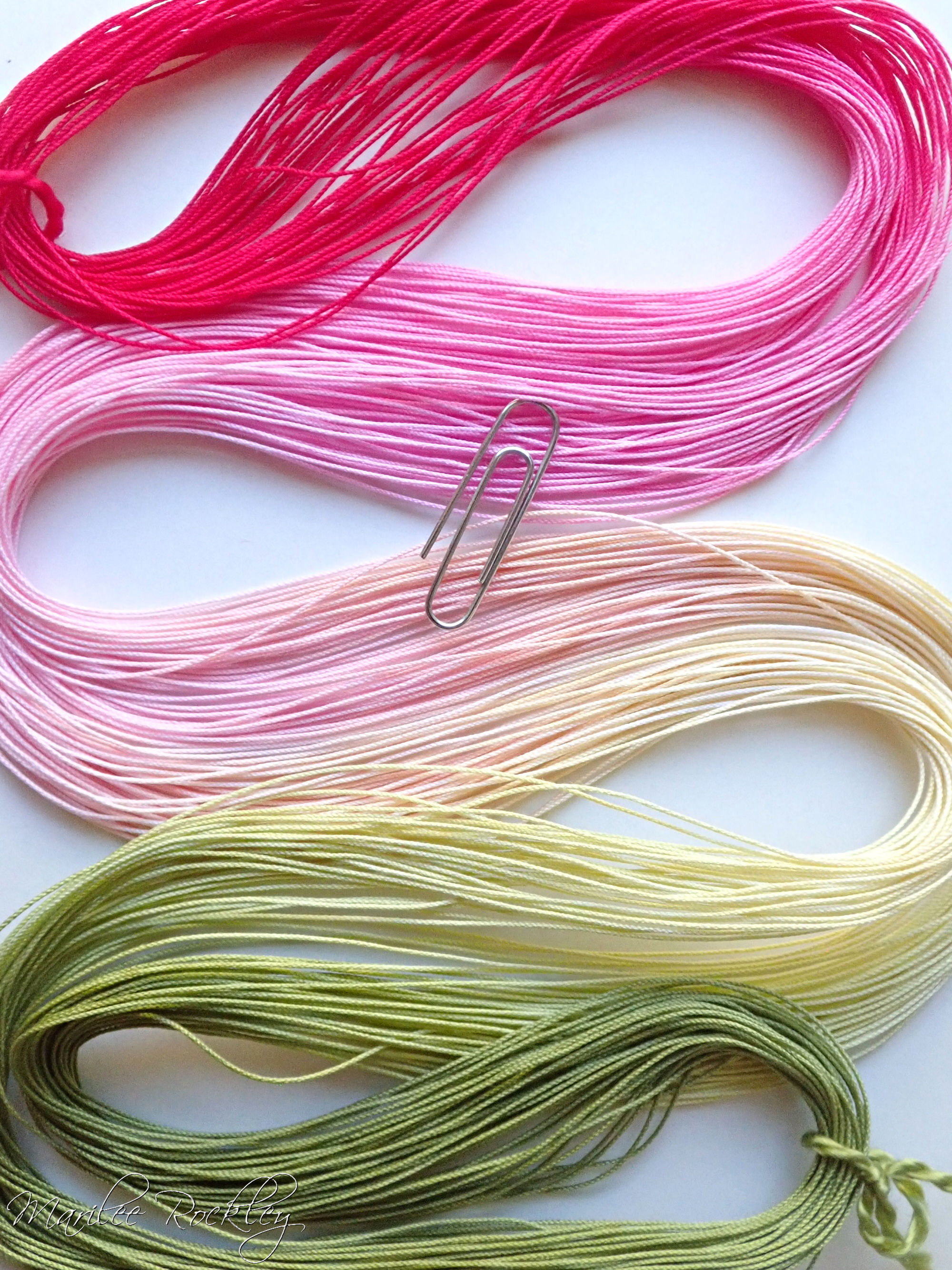 The base thread is Lizbeth, which is 100% Egyptian cotton. It is super-combed, gas-singed, mercerized, very strong, tightly twisted, lustrous, hard-wearing thread suitable for heirlooms, wearables, and decorative designs. I used Procion MX dyes to hand paint it. This is a lovely thread for tatting or other lace work.