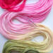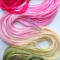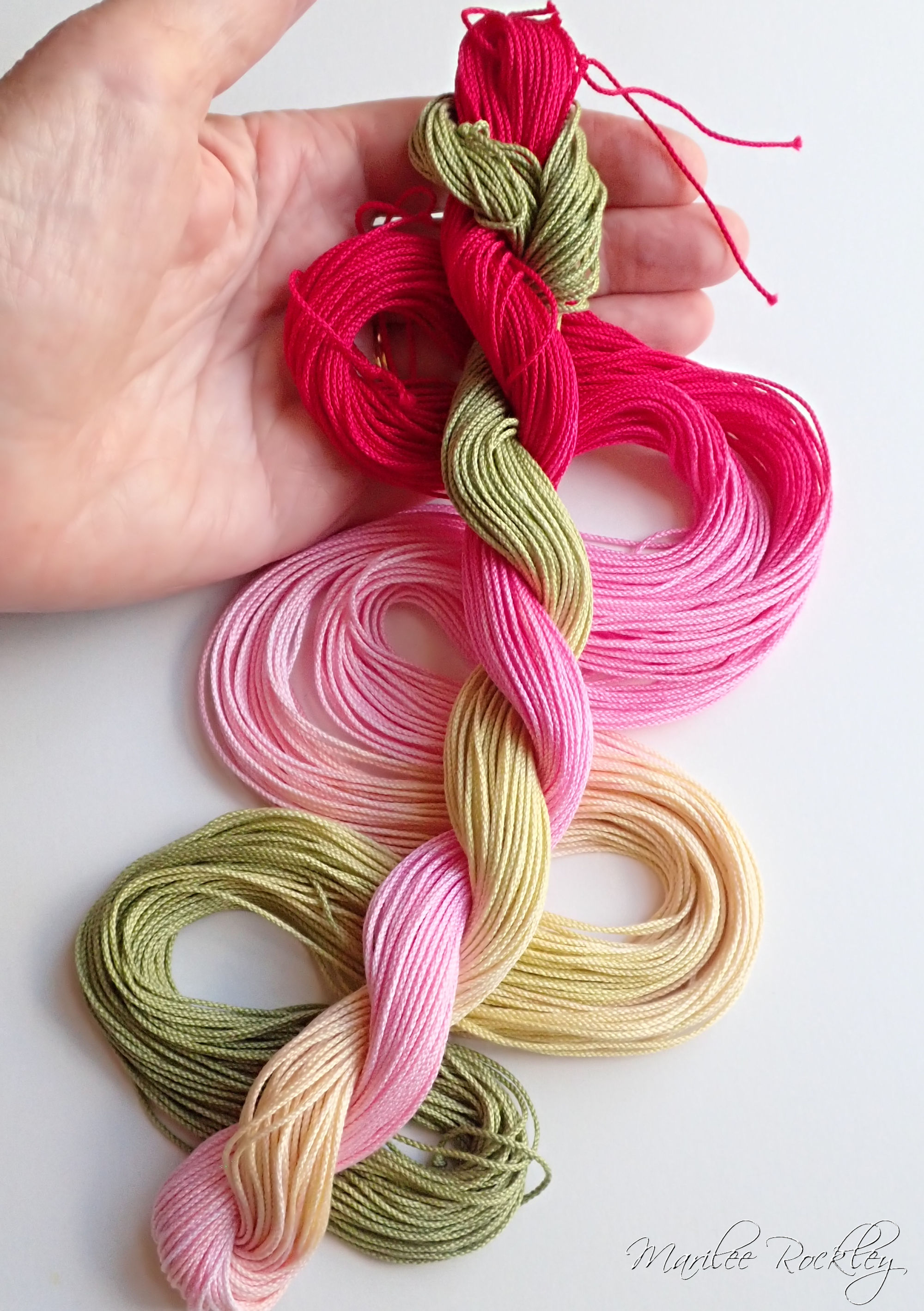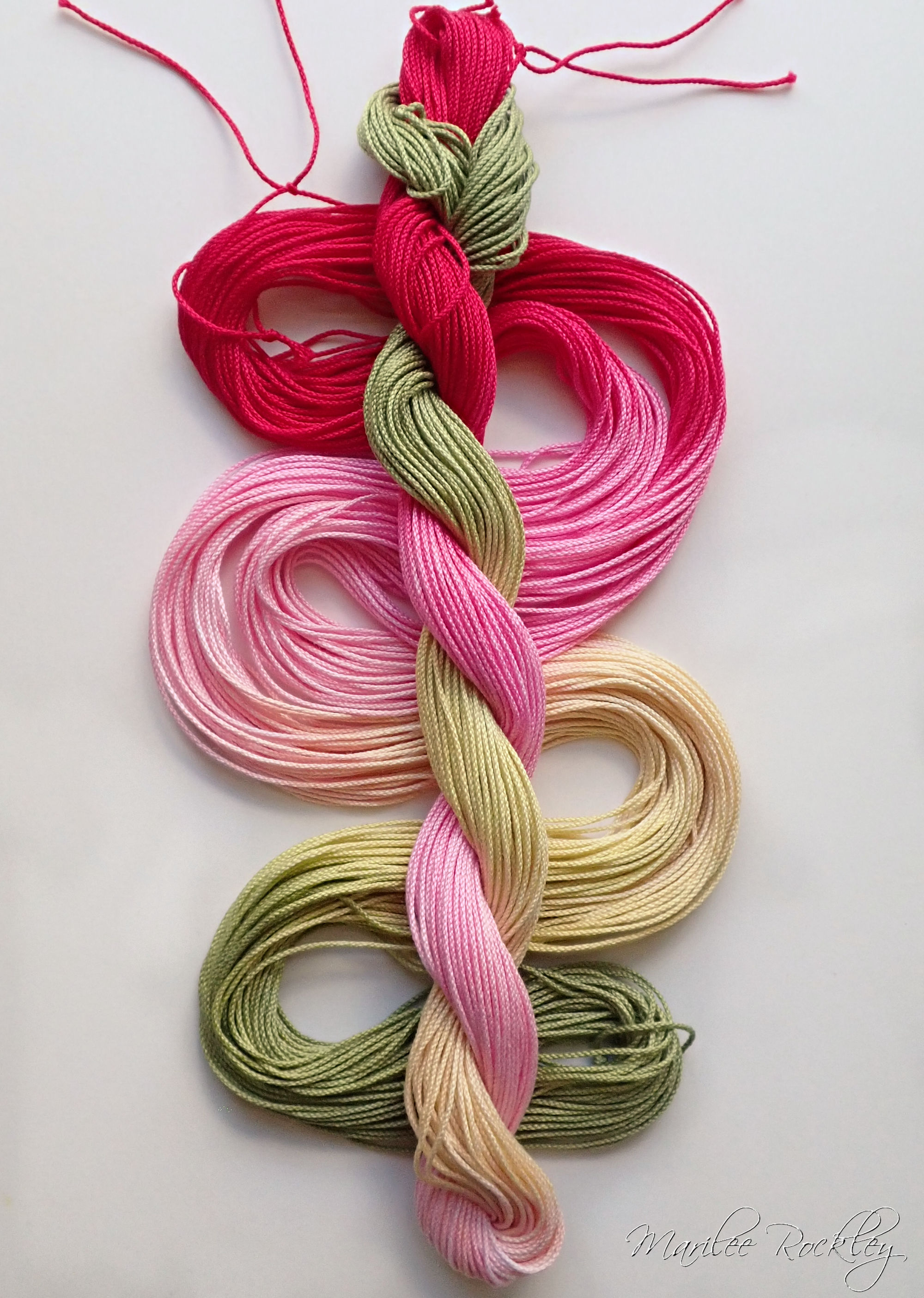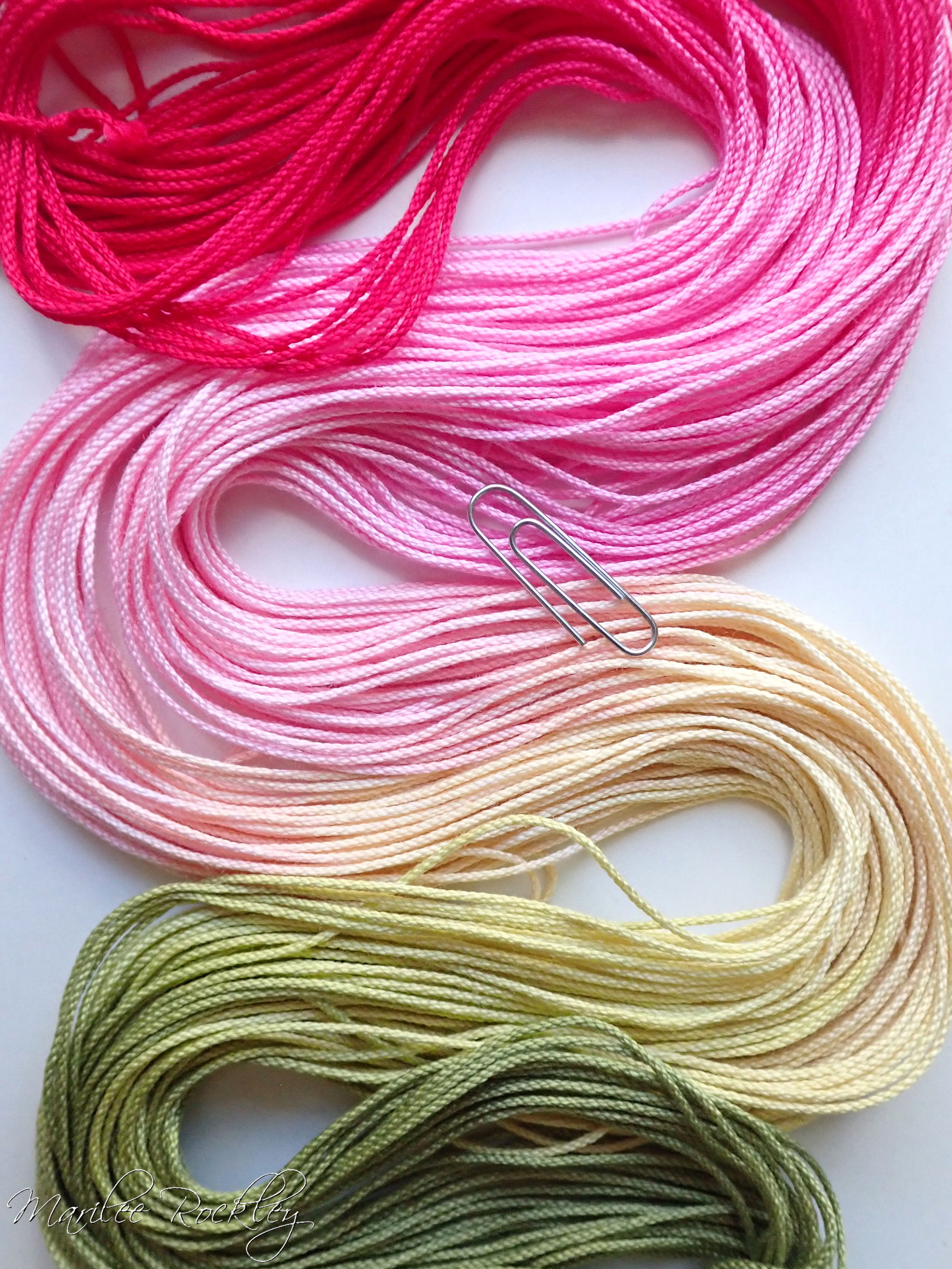The base thread for size 5 is Elisa, a 6 cord cordonnet, 100% cotton, combed, mercerized, and gas singed. It has a slightly softer feeling compared to the Lizbeth thread. It's suitable for heirlooms, wearables, and decorative designs. I used Procion MX dyes to hand paint it.
