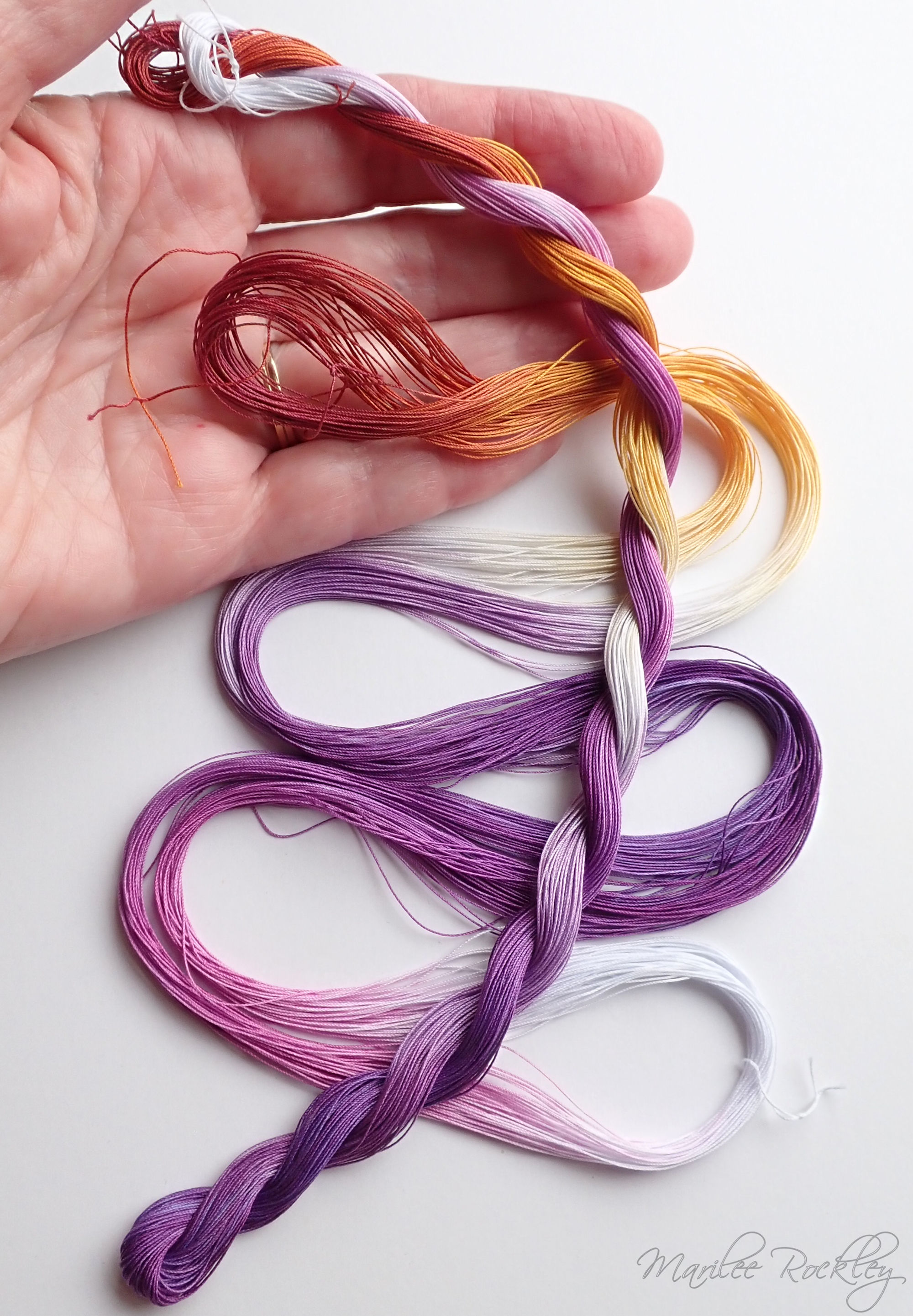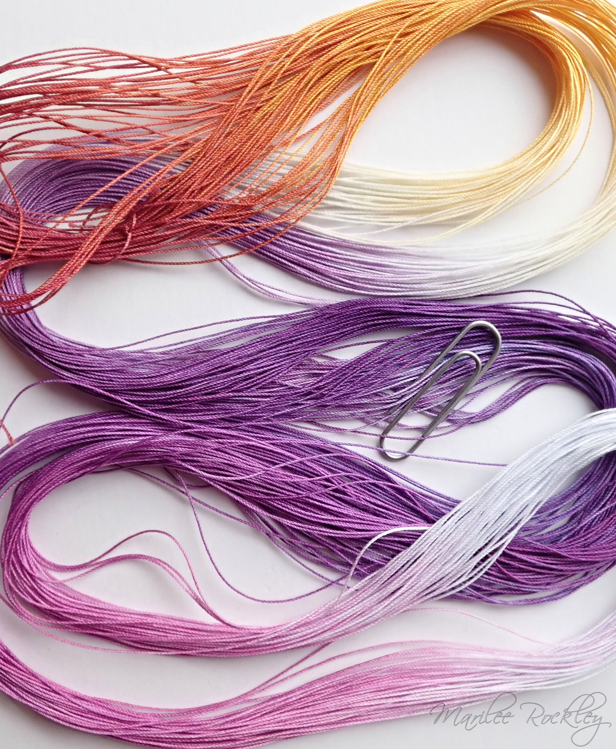 The base thread for size 80 is DMC Cordonnet Special. This is mercerized, very strong, tightly twisted, lustrous, hard-wearing cotton thread suitable for heirlooms, wearables, and decorative designs. I used Procion MX dyes to hand paint it. This is a lovely thread for tatting or other lace work.