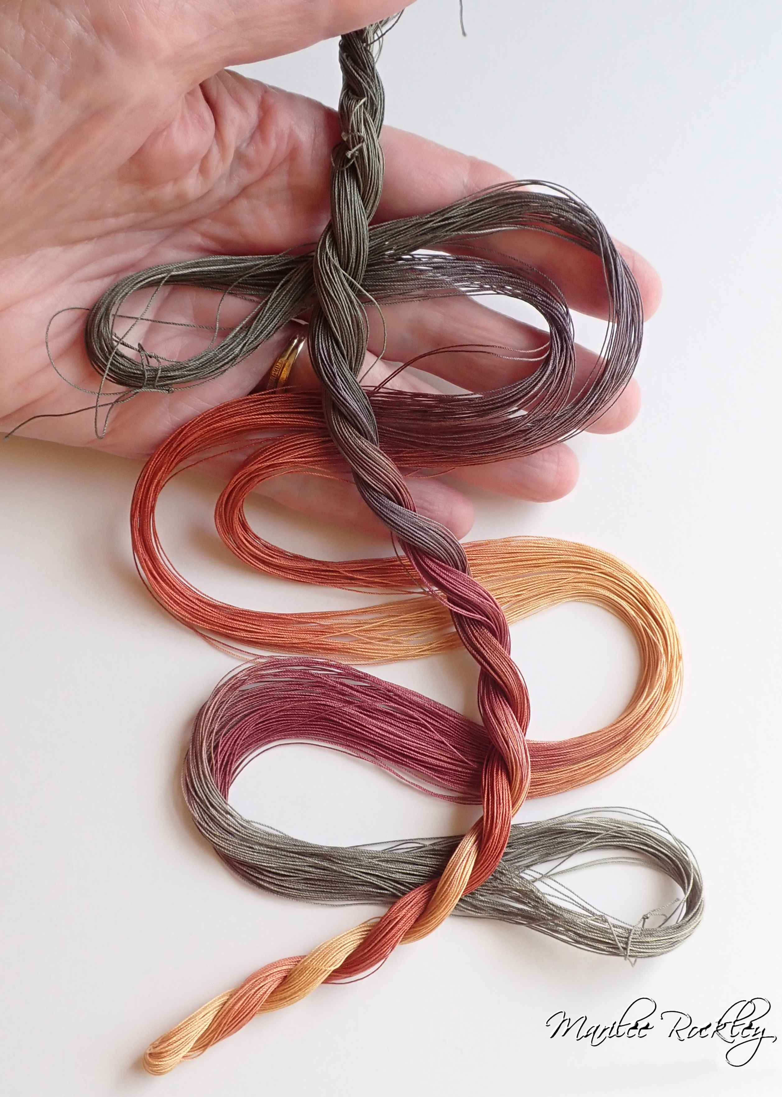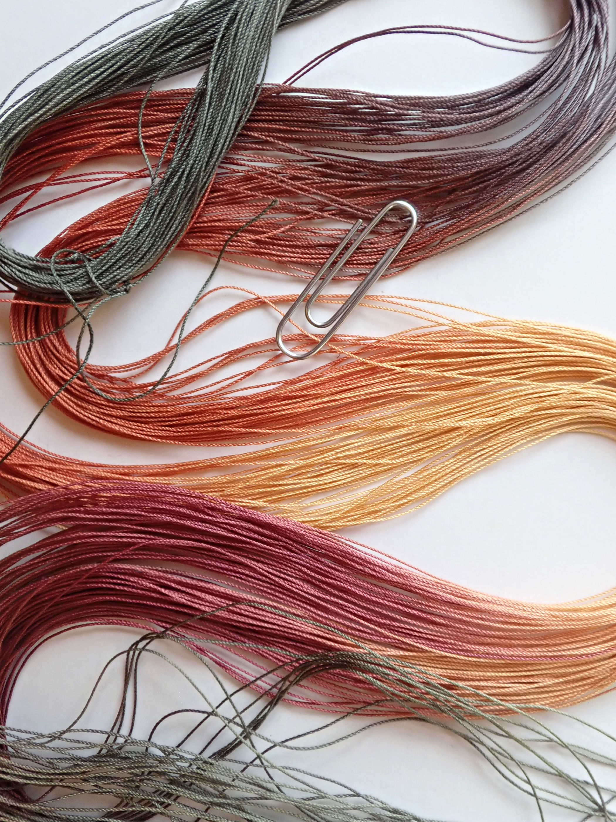 The base thread for size 80 is DMC Cordonnet Special. This is mercerized, very strong, tightly twisted, lustrous, hard-wearing cotton thread suitable for heirlooms, wearables, and decorative designs. I used Procion MX dyes to hand paint it. This is a lovely thread for tatting or other lace work.