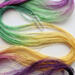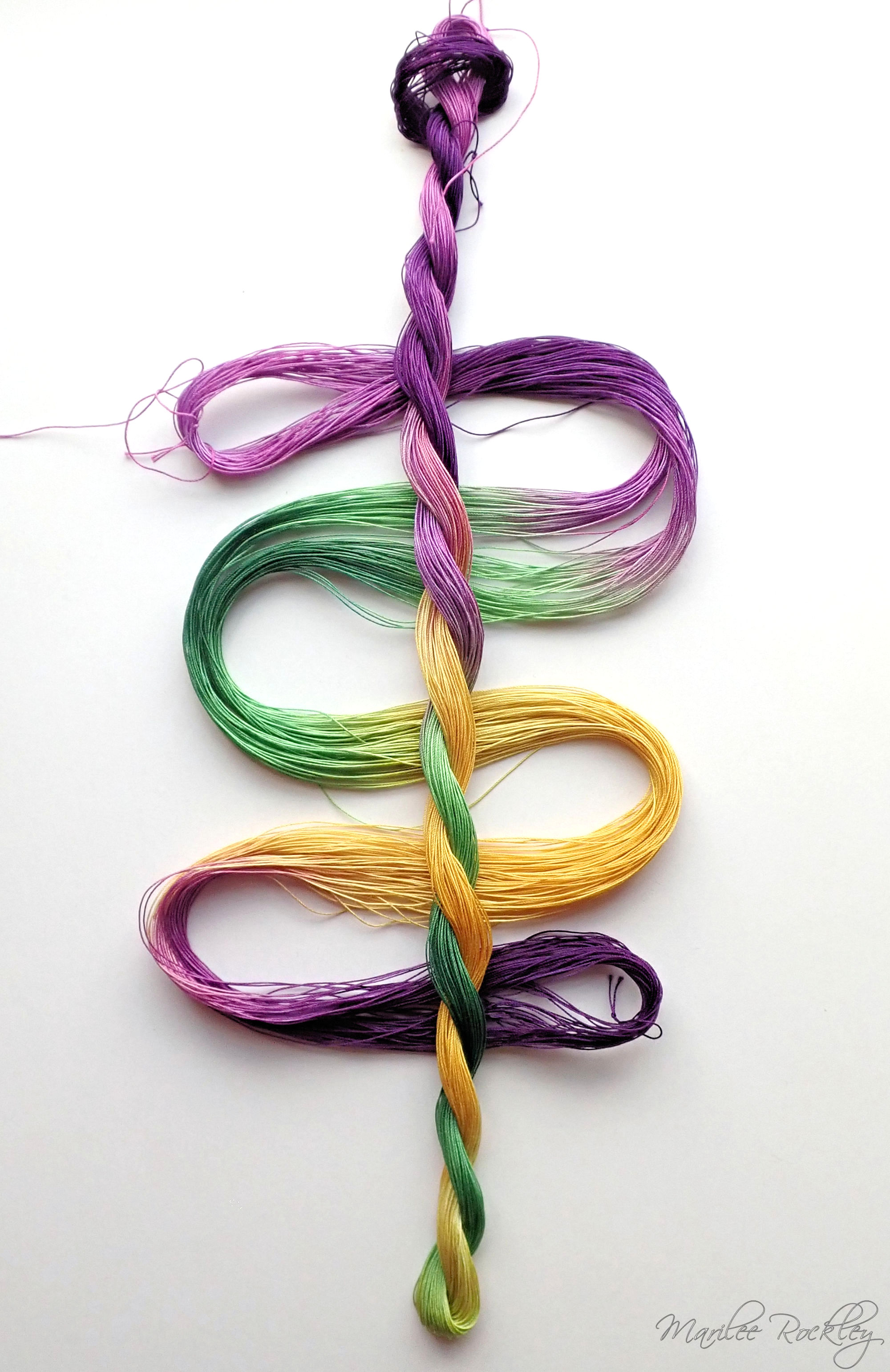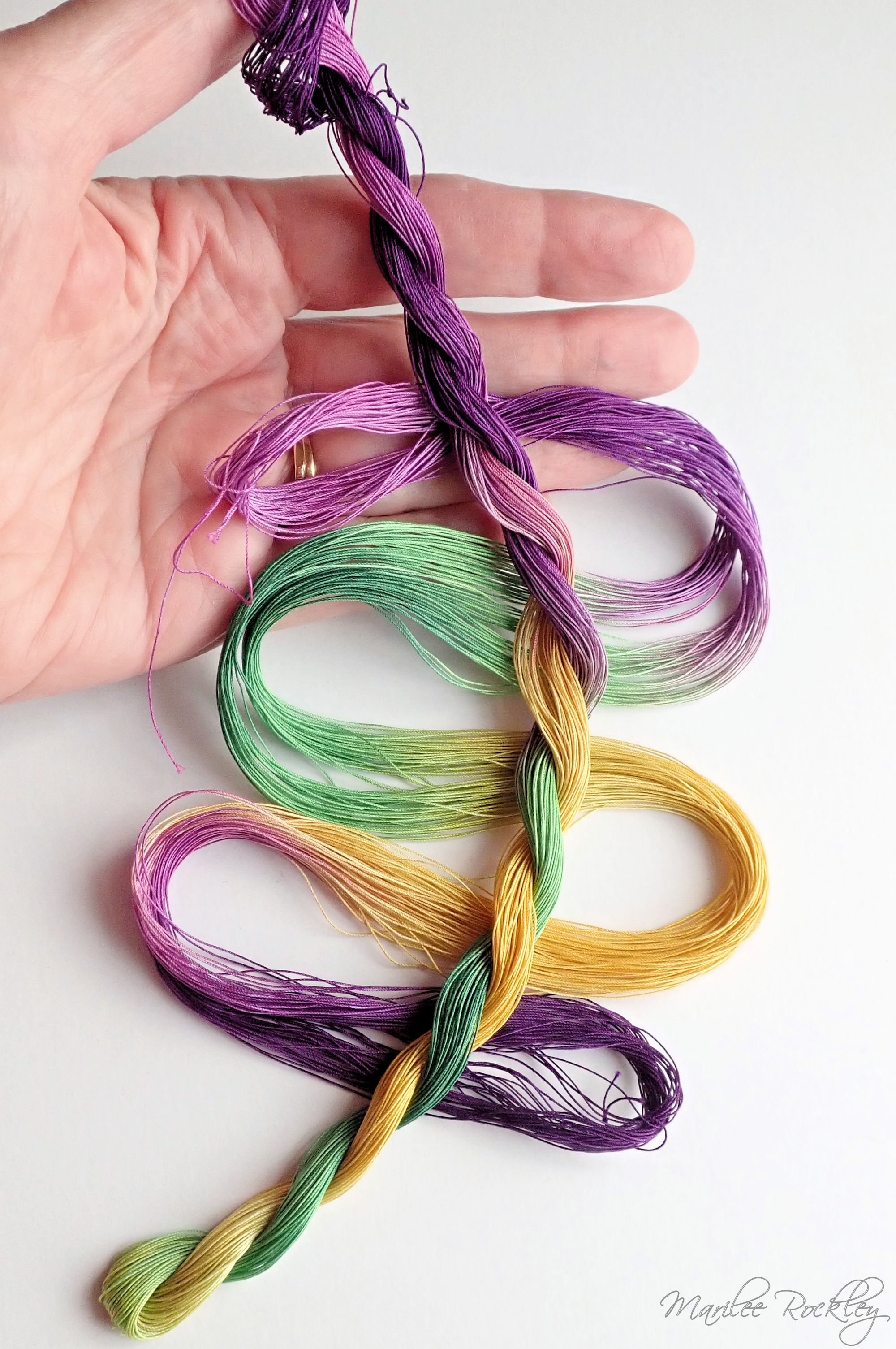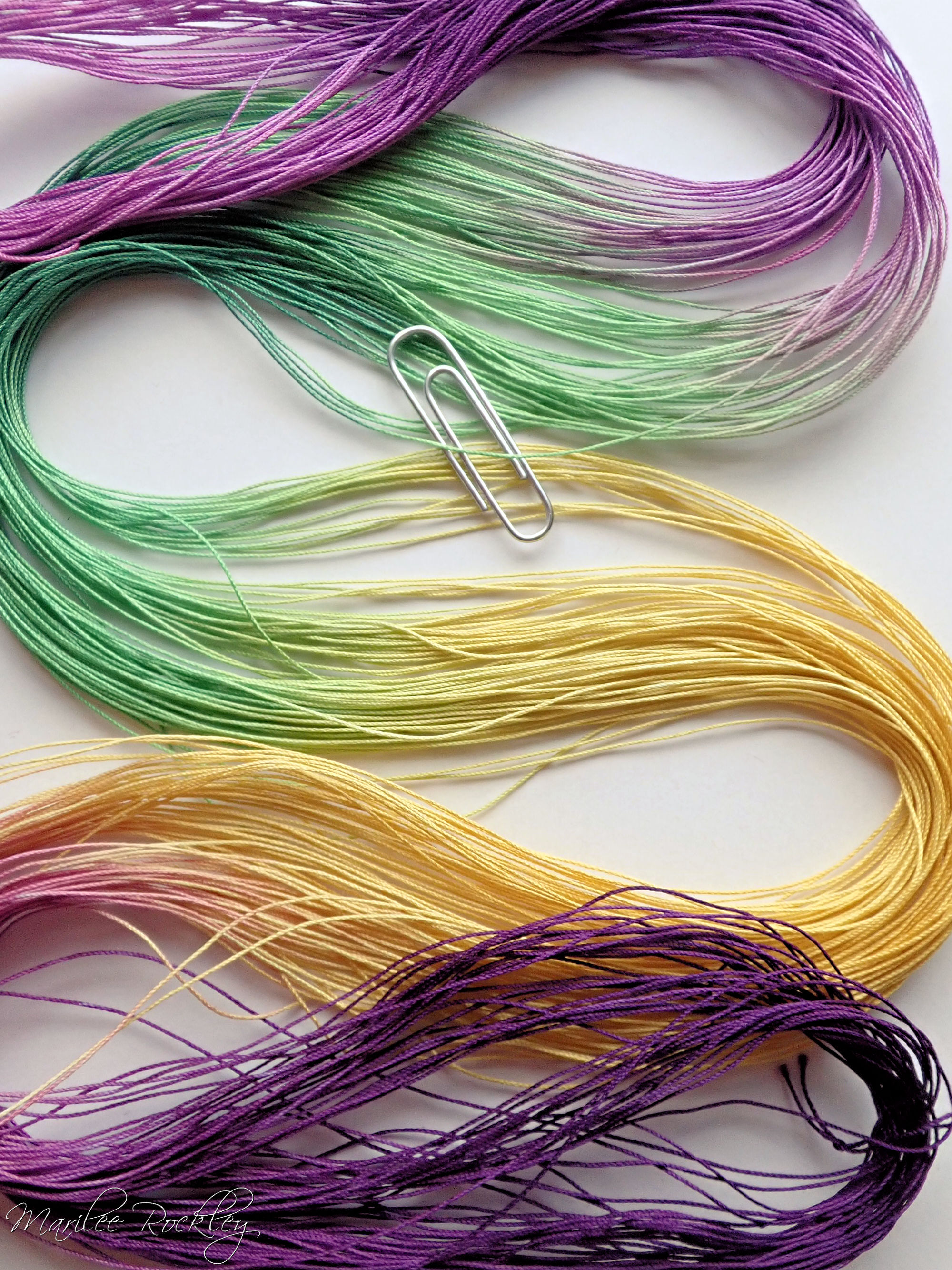 The base thread for size 80 is DMC Cordonnet Special. This is mercerized, very strong, tightly twisted, lustrous, hard-wearing cotton thread suitable for heirlooms, wearables, and decorative designs. I used Procion MX dyes to hand paint it. This is a lovely thread for tatting or other lace work.