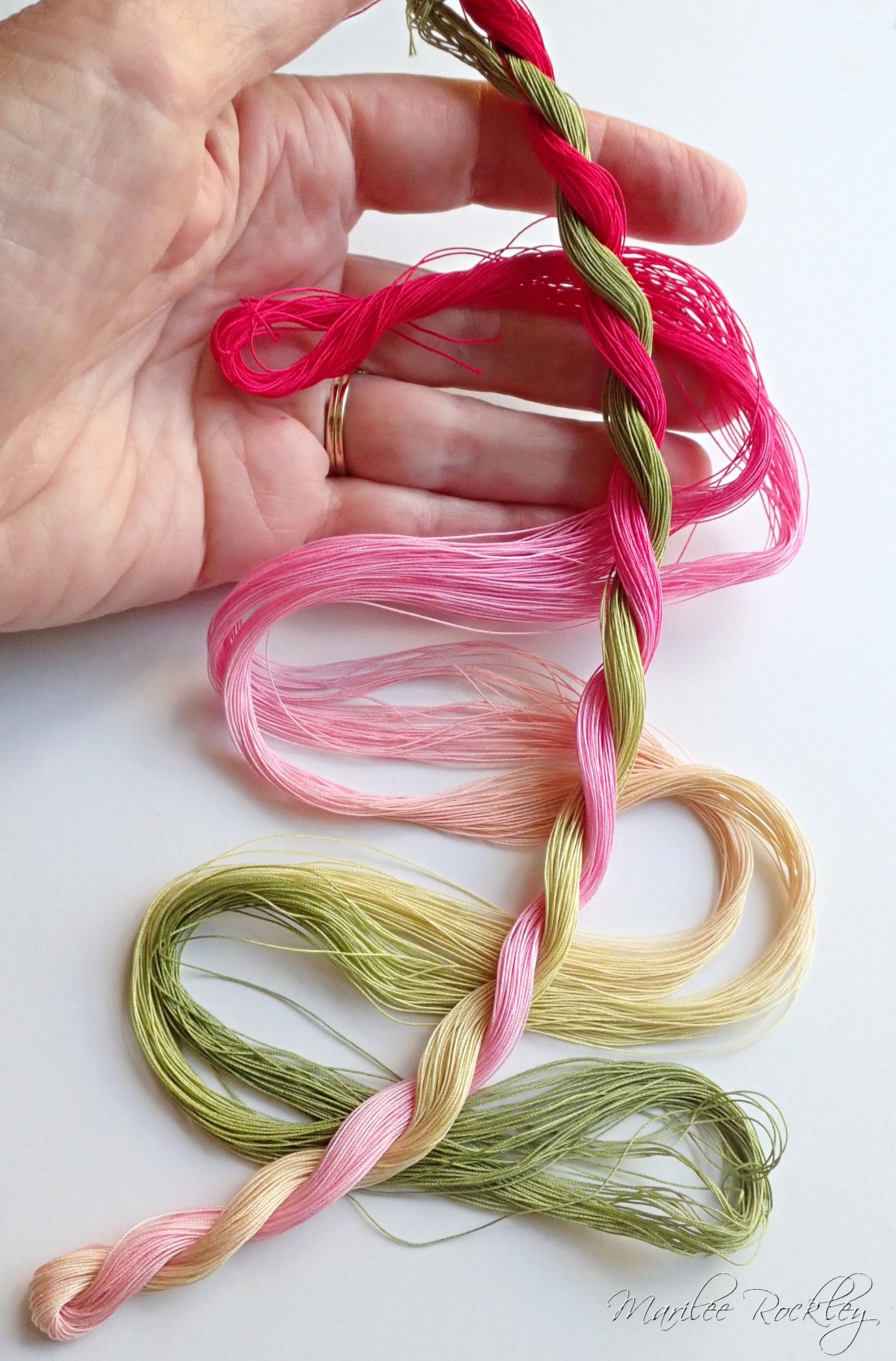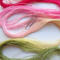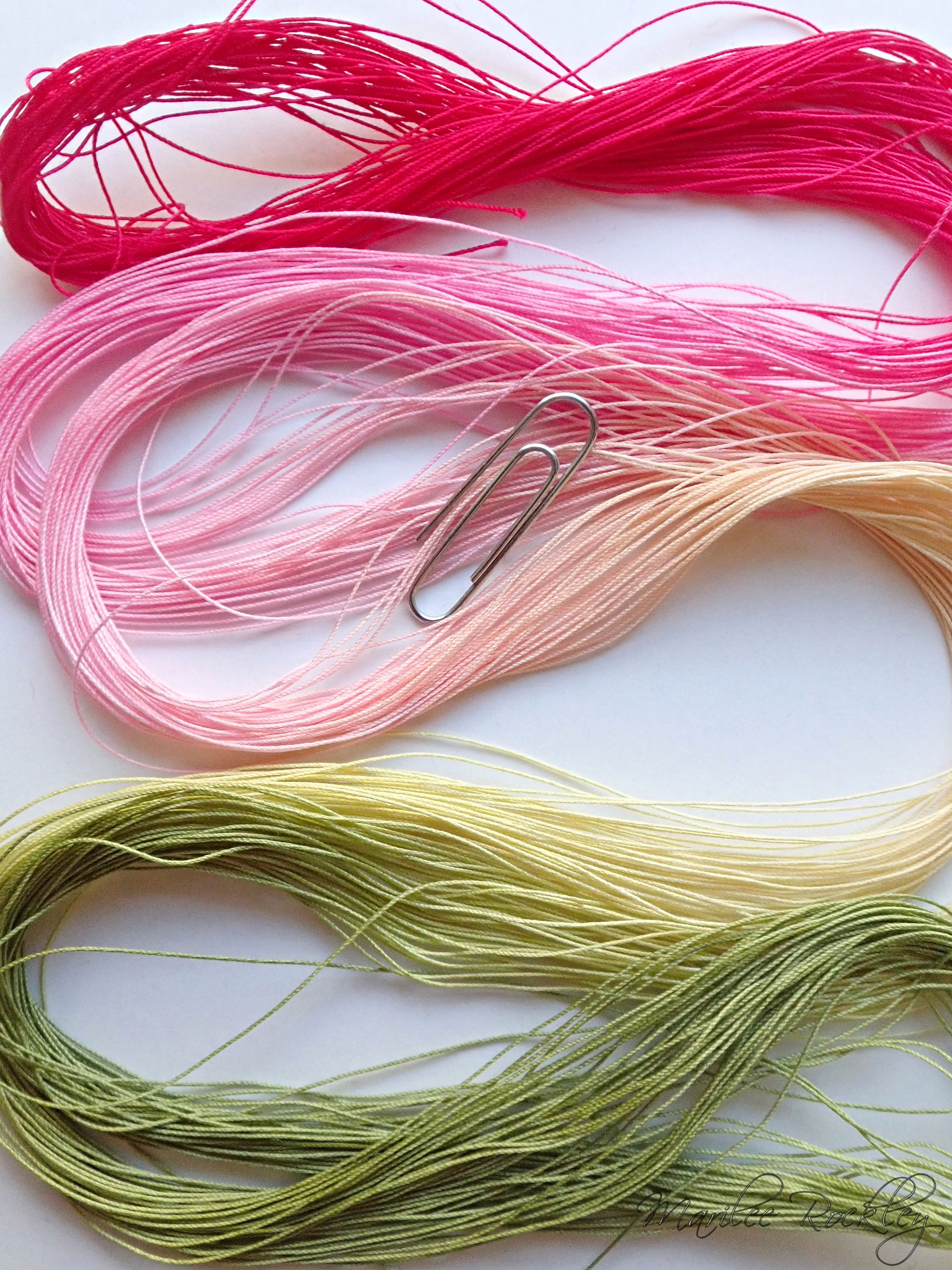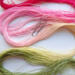 The base thread for size 80 is DMC Cordonnet Special. This is mercerized, very strong, tightly twisted, lustrous, hard-wearing cotton thread suitable for heirlooms, wearables, and decorative designs. I used Procion MX dyes to hand paint it. This is a lovely thread for tatting or other lace work.