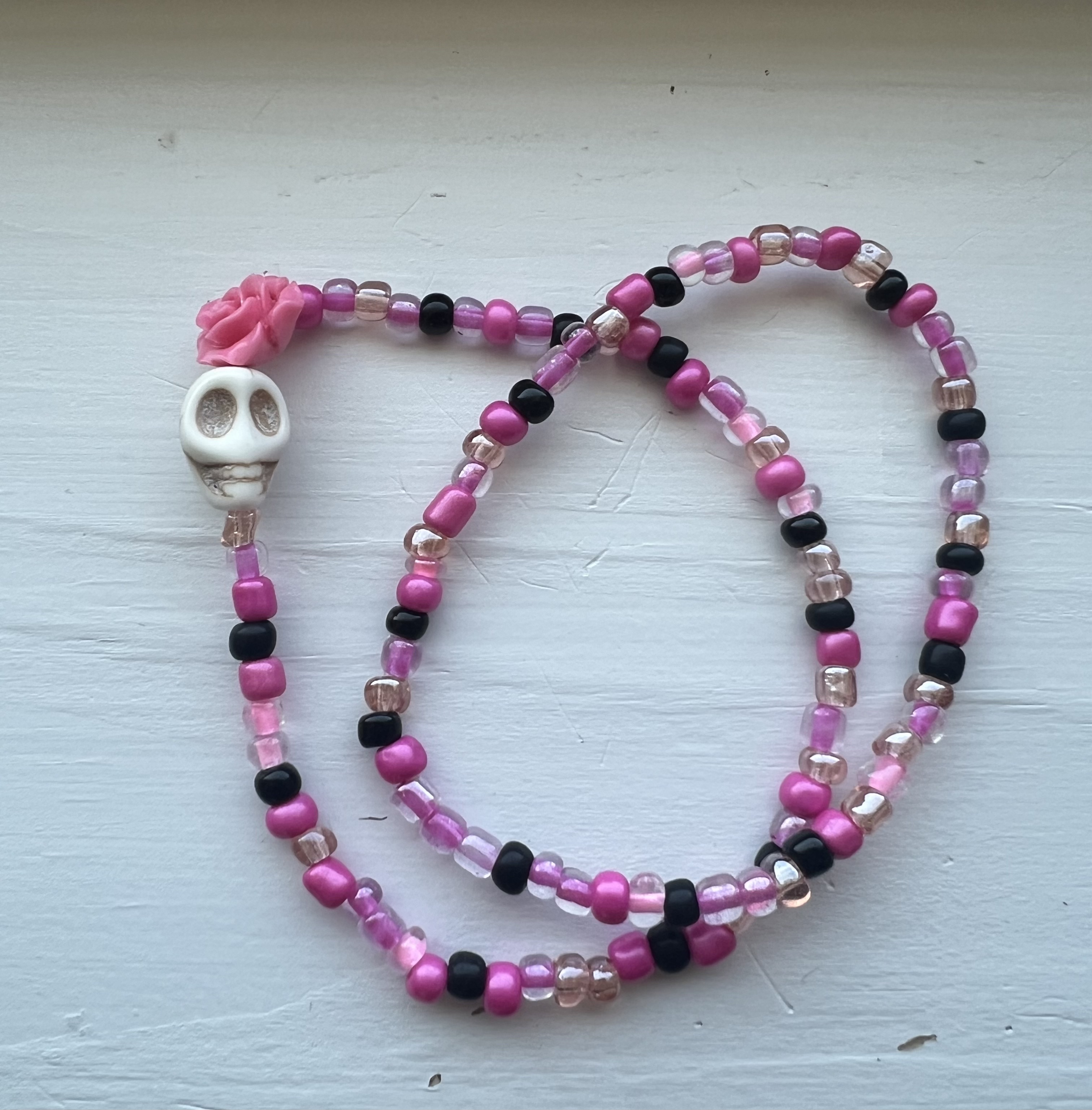 Soft romance meets playful edge with the Skull & Bloom Beaded Bracelet. Featuring a carved ivory skull, a delicate pink rose bead, and a mix of glossy pink, blush, and black glass beads, this piece is a perfect balance of sweet and spooky.