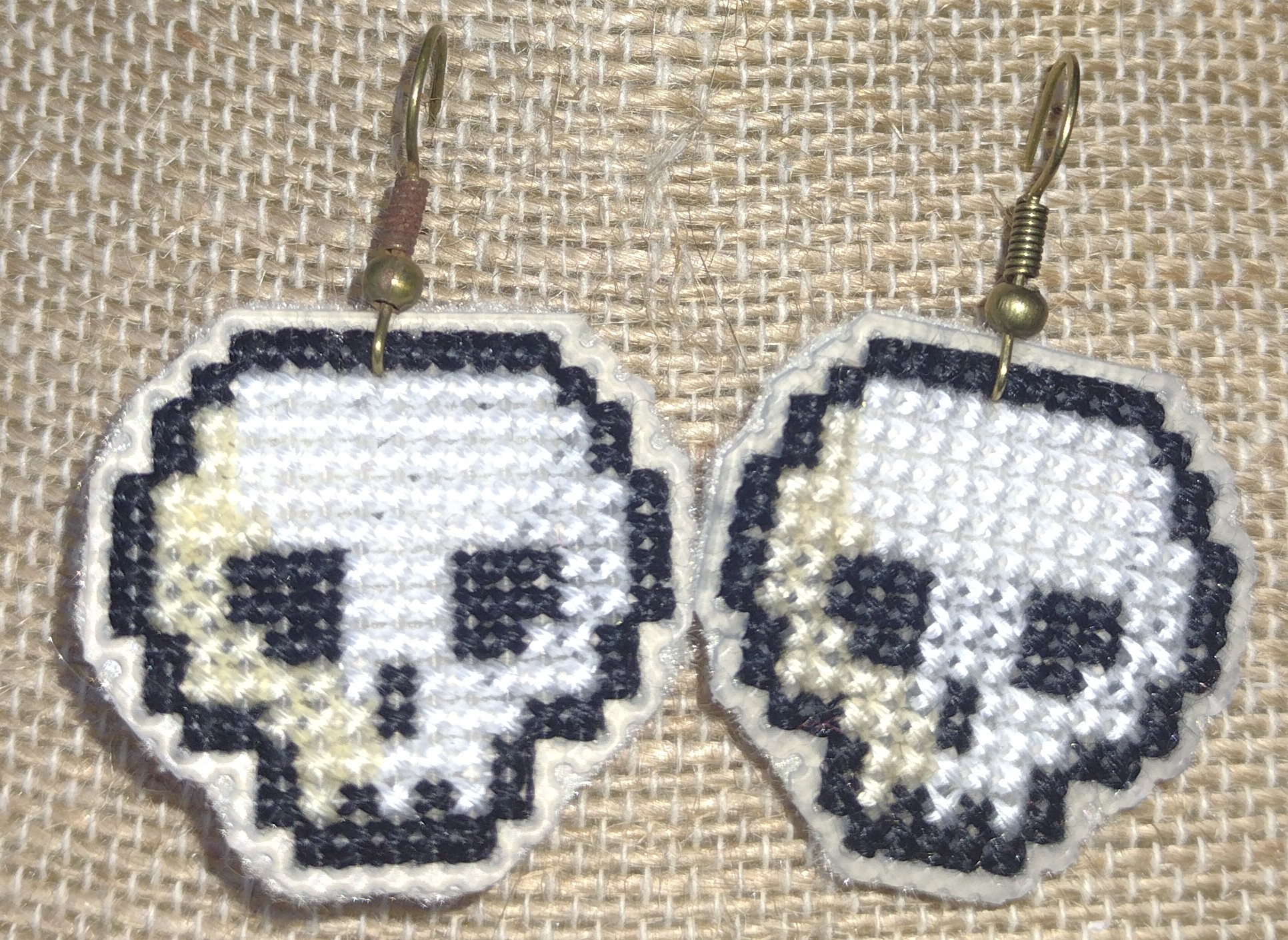 Death comes for us all. These earrings are of white stylized skulls. They are hand-stitched on plastic canvas, so they are very light weight. The backing is beige felt.