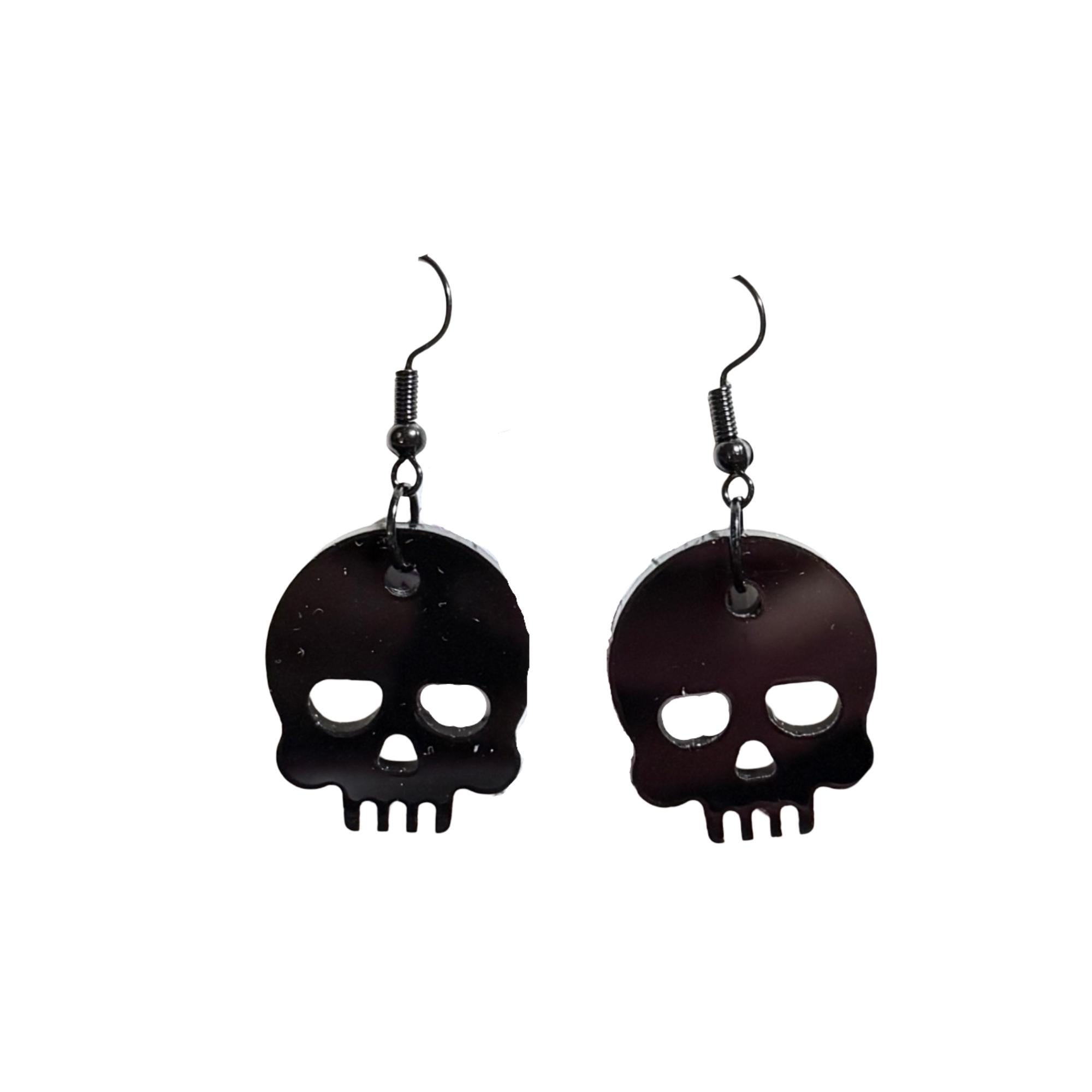 These are a pair of black skull laser cut lightweight acrylic earrings. They are made from 1/8 in thick medium black acrylic. They are on ear wires. All metal components are silver, gold, or brass plated, or black alloy, nickel & lead free, and hypoallergenic. They are approx. 1" long. Backs not included but available upon request.