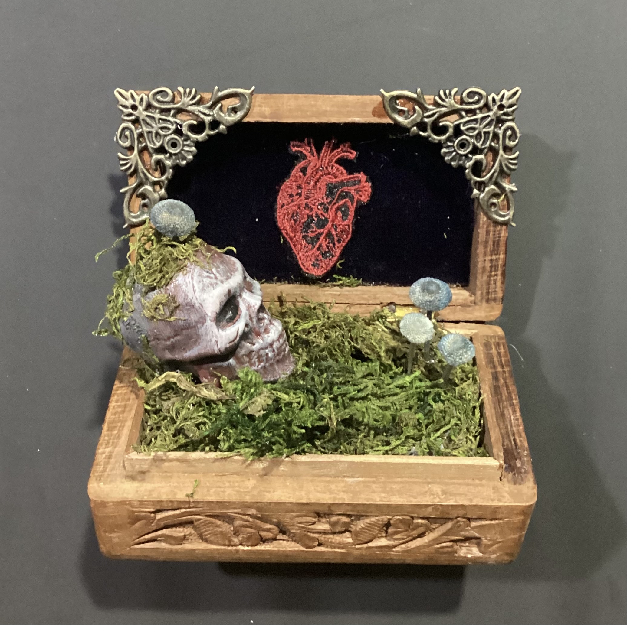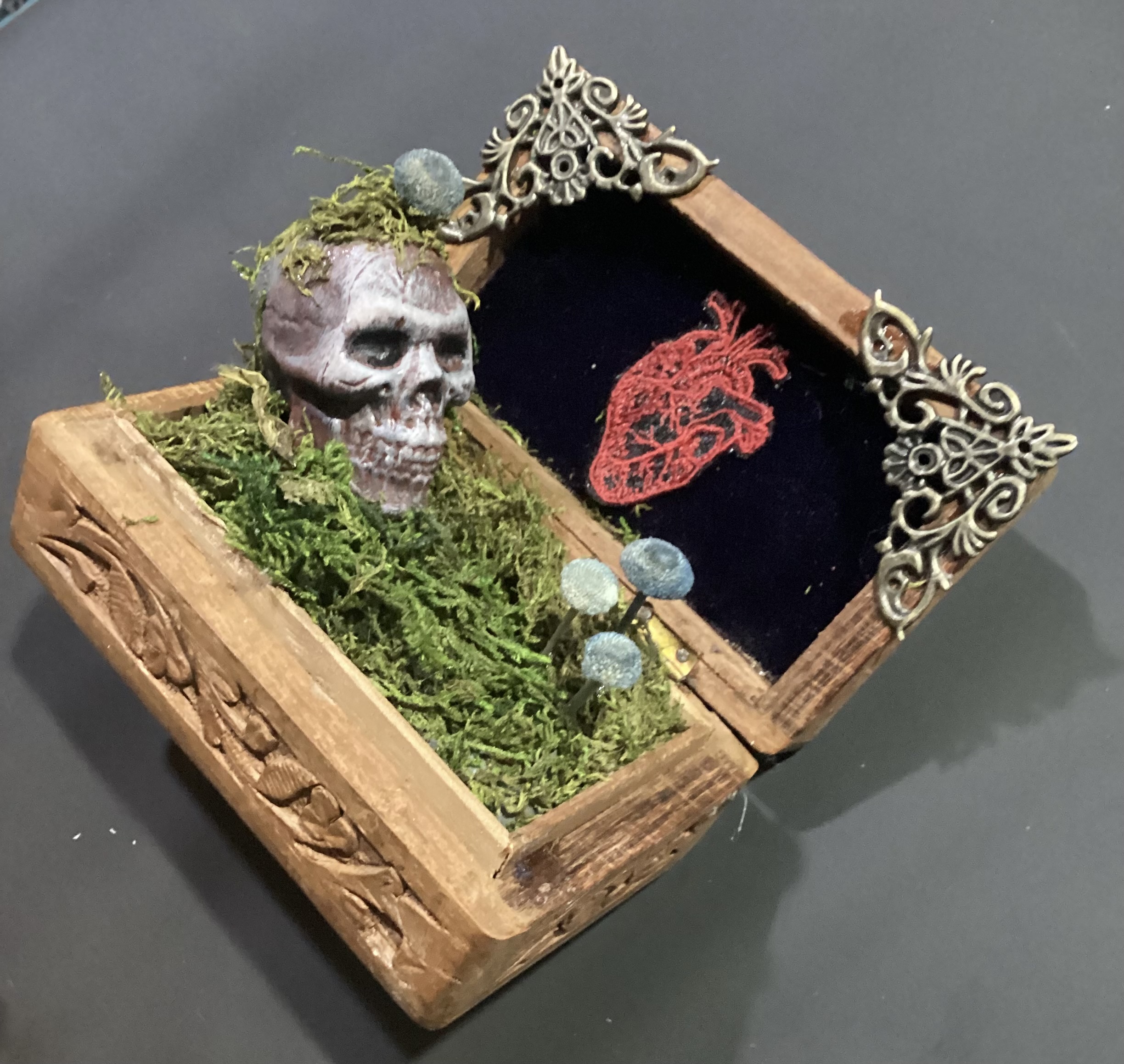 This is an up cycled mixed media sculpture. The wooden case has a fixed hinge lid. The outside of the box is hand carved wood and distressed inside the lid. We have ornamental corner, brackets, framing, a red embroidered heart on black velvet in the body of the box, we have a painted skull Nestled in a bed of moss with mushroom with crafted mushrooms growing