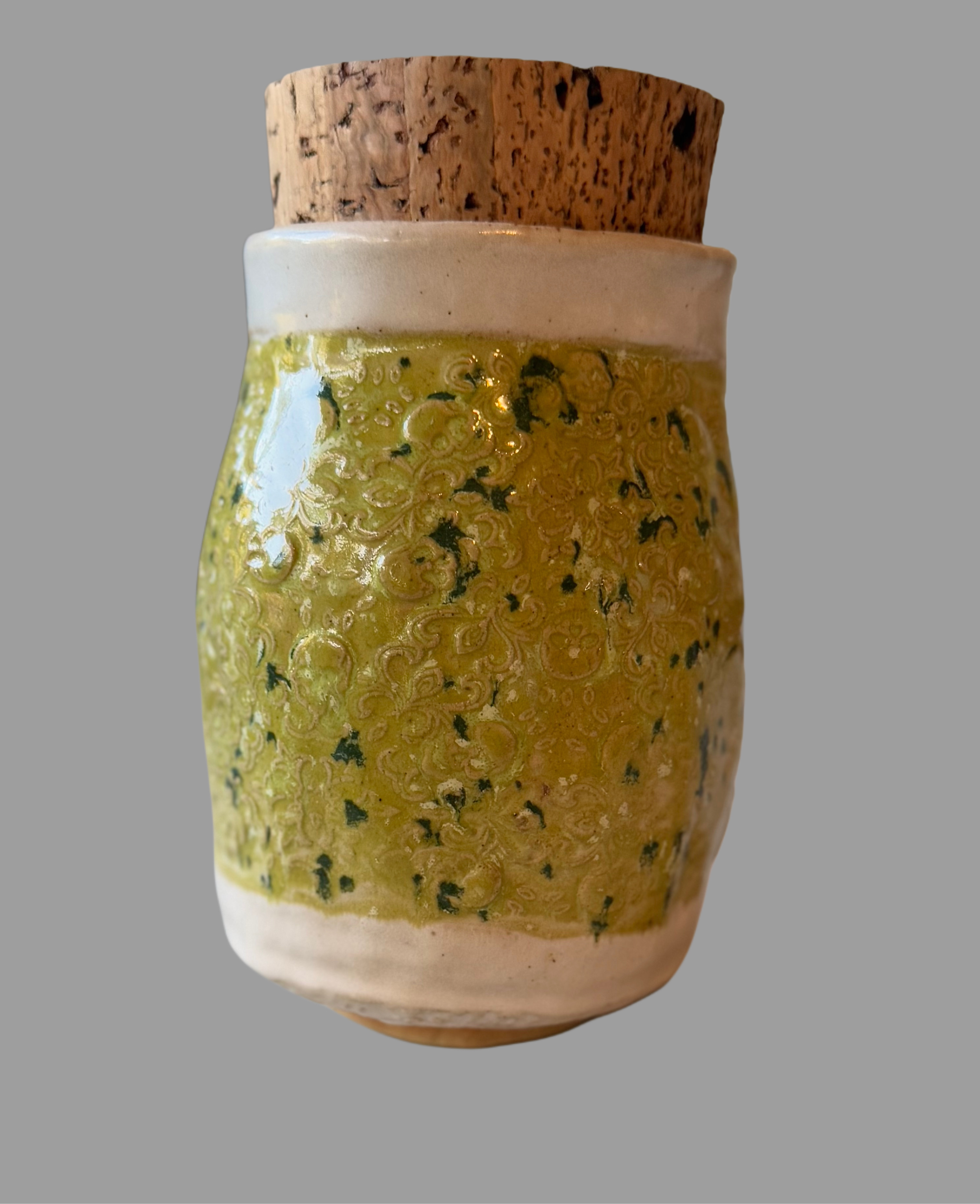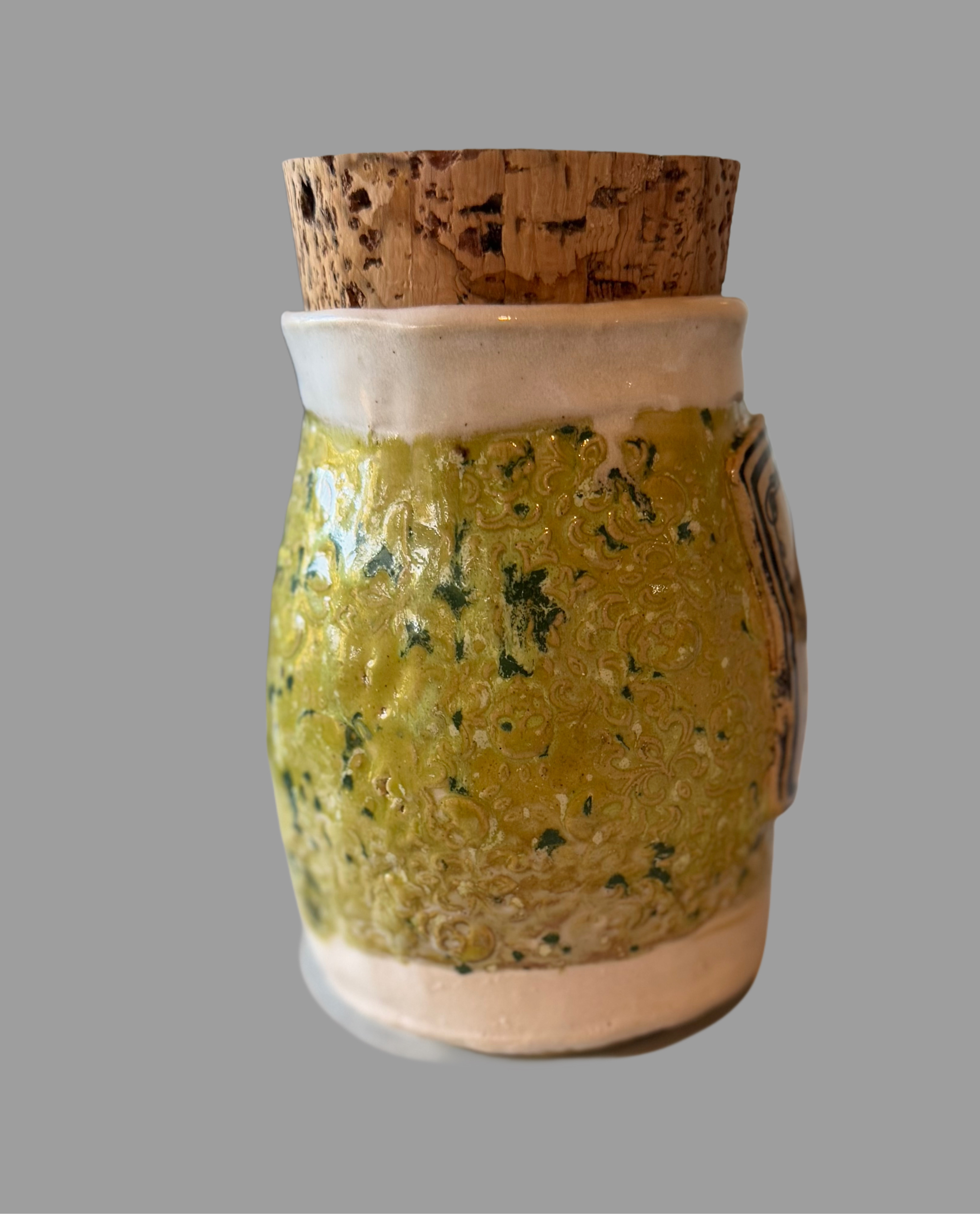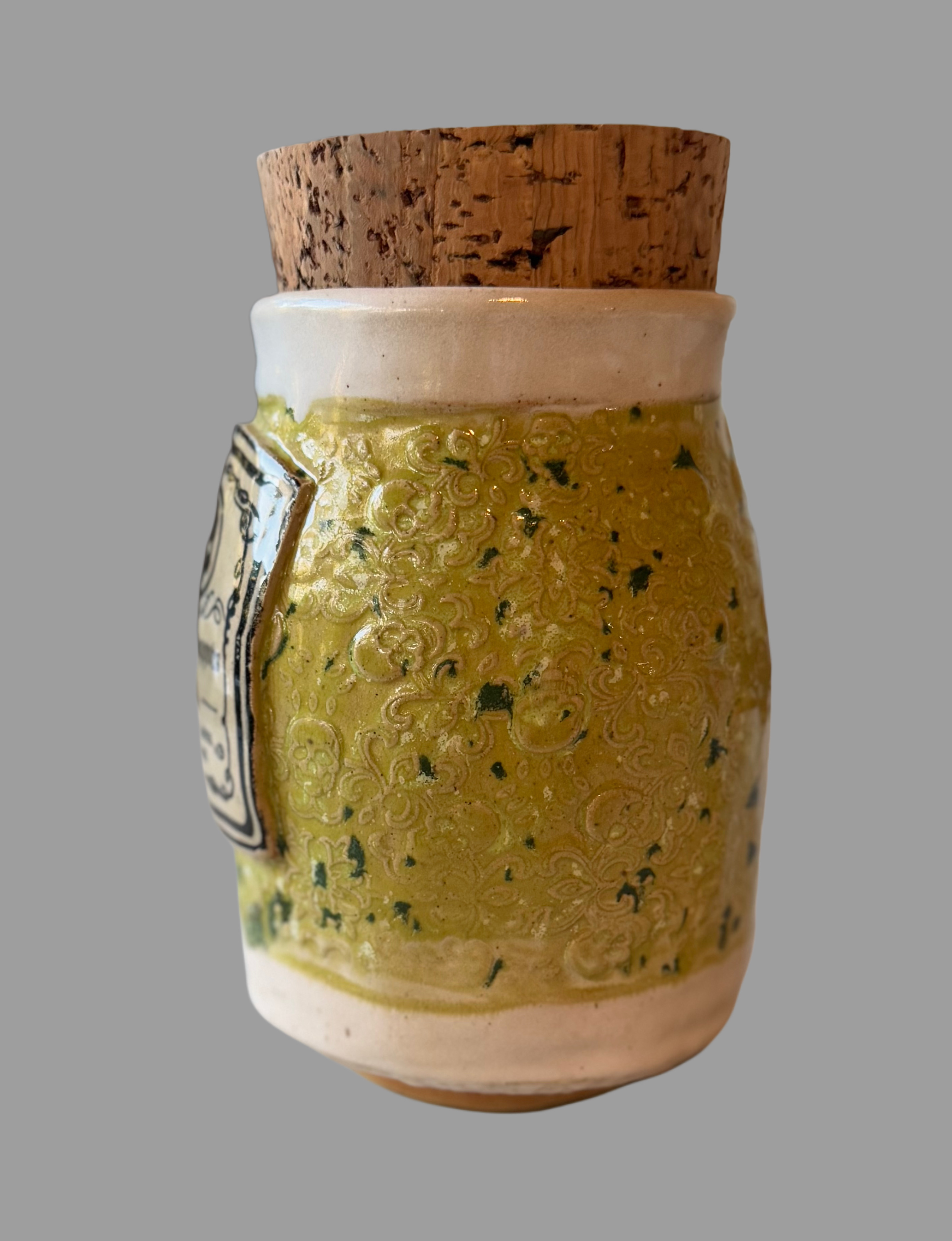 This jar is hand-built from clay and textured with patterned rollers for extra detail before being shaped into its classic apothecary form. The label is applied with a custom ceramic transfer and fired directly into the glaze so it becomes a permanent part of the surface. Layers of green and cream glaze create the oozy, otherworldly finish. It’s bisque-fired first, then glaze-fired to over 2300°F for durability. The jar is topped with a natural cork lid to complete the vintage apothecary look.