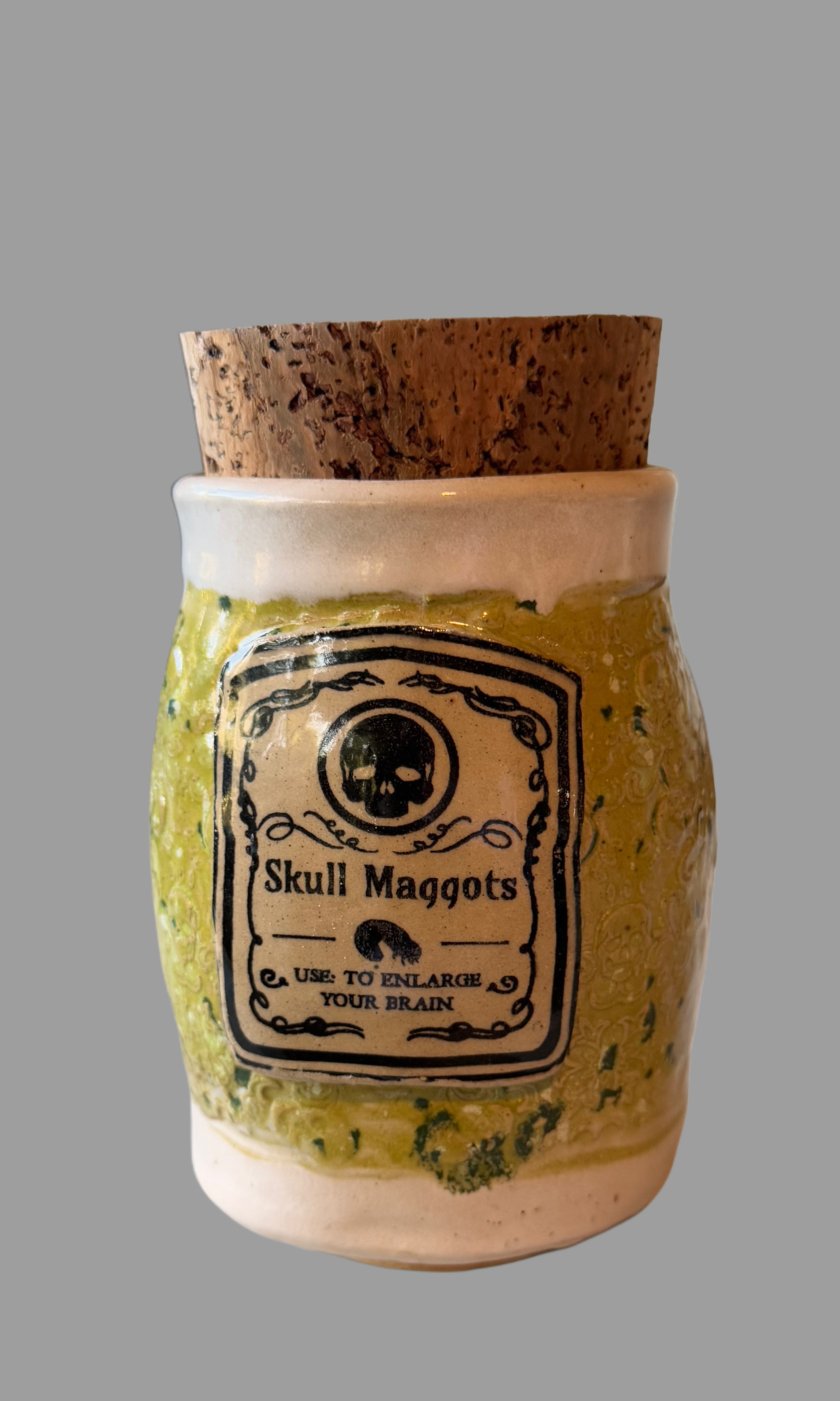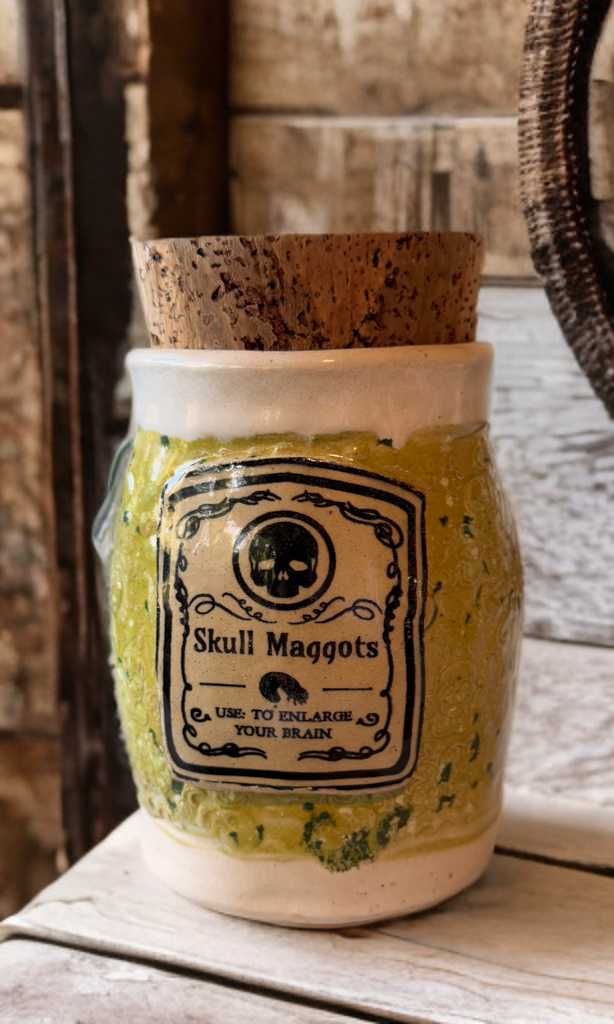 Straight from a witch’s shelf of curiosities, this whimsical apothecary jar is labeled “Skull Maggots – Use to Enlarge Your Brain.” With its eerie green glaze, textured surface, and oversized cork stopper, it looks like it was pulled from a mad scientist’s lab or a haunted apothecary cabinet. Perfect as a spooky kitchen jar, Halloween décor, or conversation piece, it adds a playful touch of creepy charm to your collection.