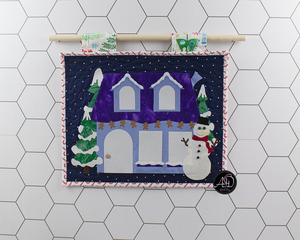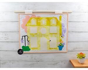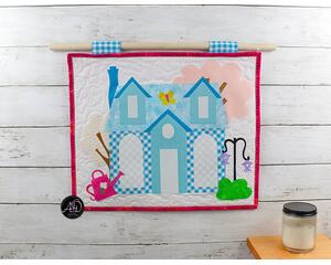 It's time to roast some gooey marshmallows! Sky Pines Cabin wall hanging showcases a blue cabin complete with a grill for making scrumptious delights. The night sky is full of constellations and star searching! This delicate piece is entirely handcrafted and free-motion quilted, created with heartfelt dedication. All appliques are raw-edge and personally designed and cut. The border is a green floral fabric, while the backing is a red fabric with dots and spots. Equipped with sewn-in hanging sleeves that match the sky of the wall hanging, this wall hanging is all set for display.