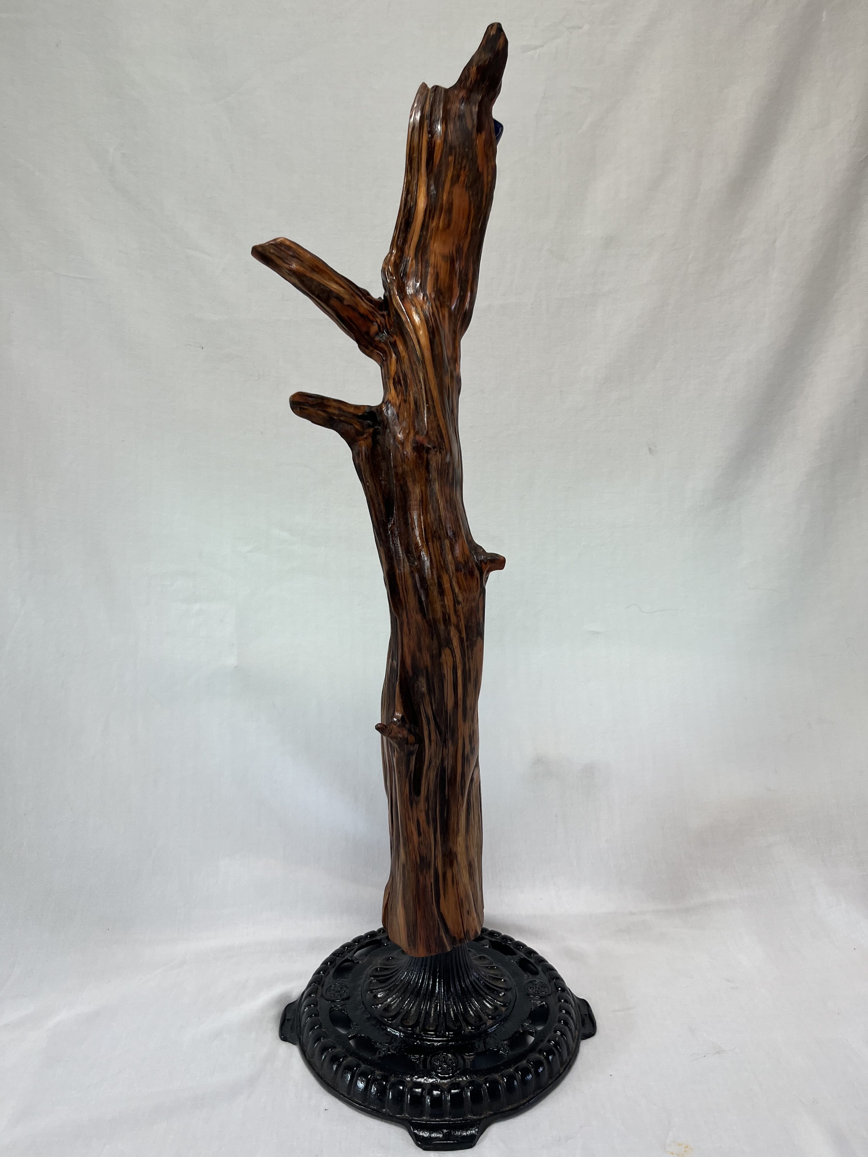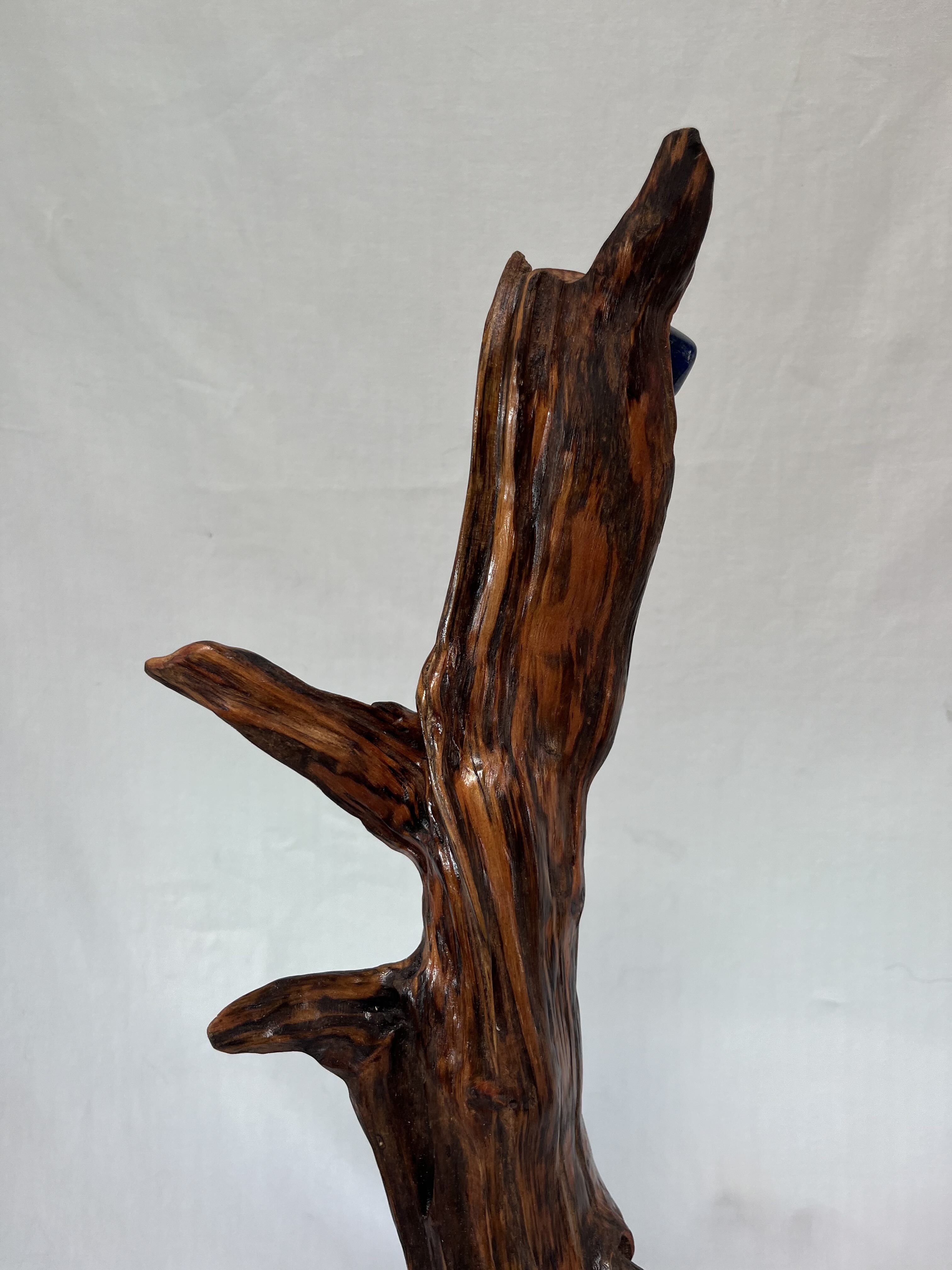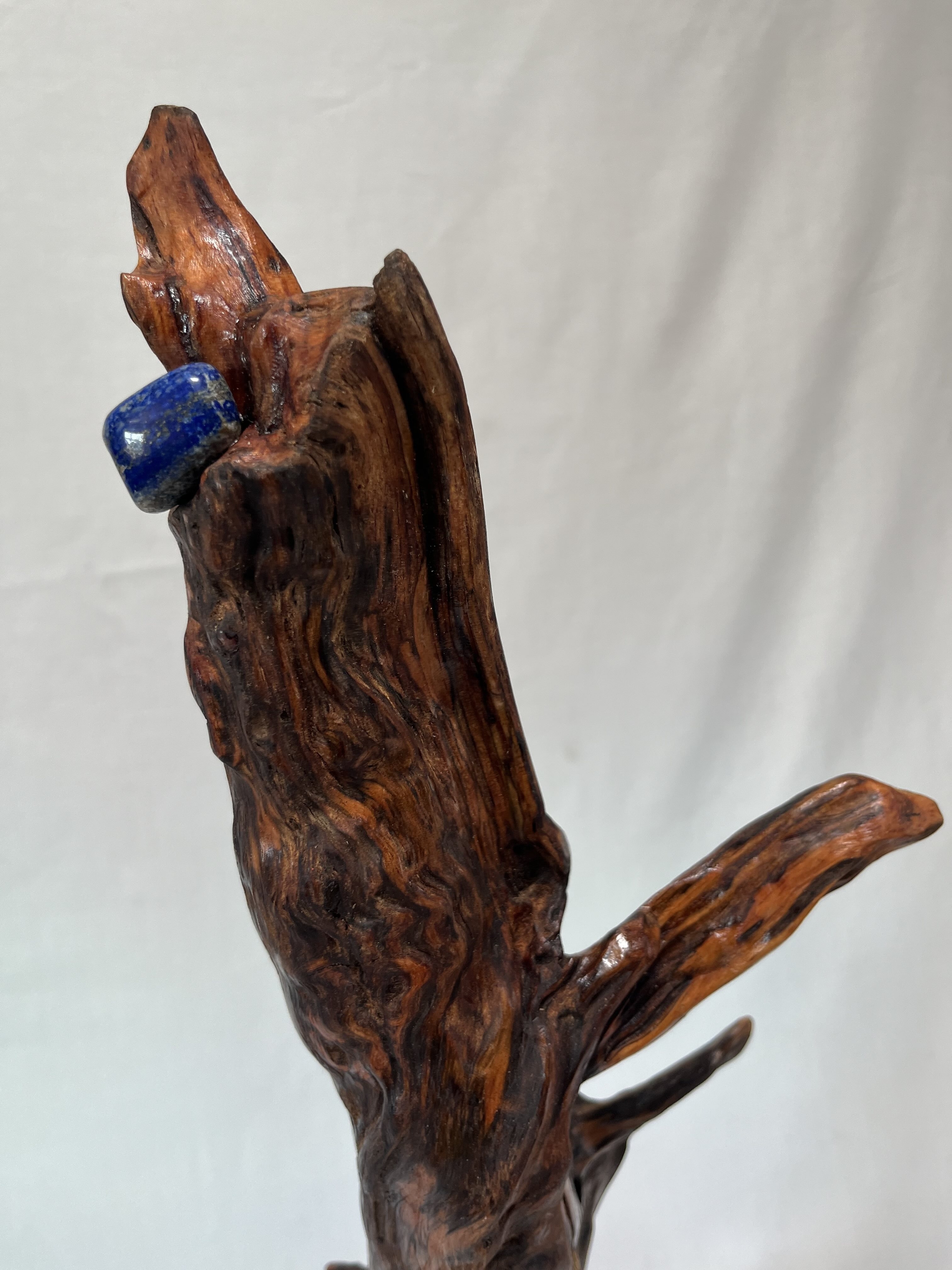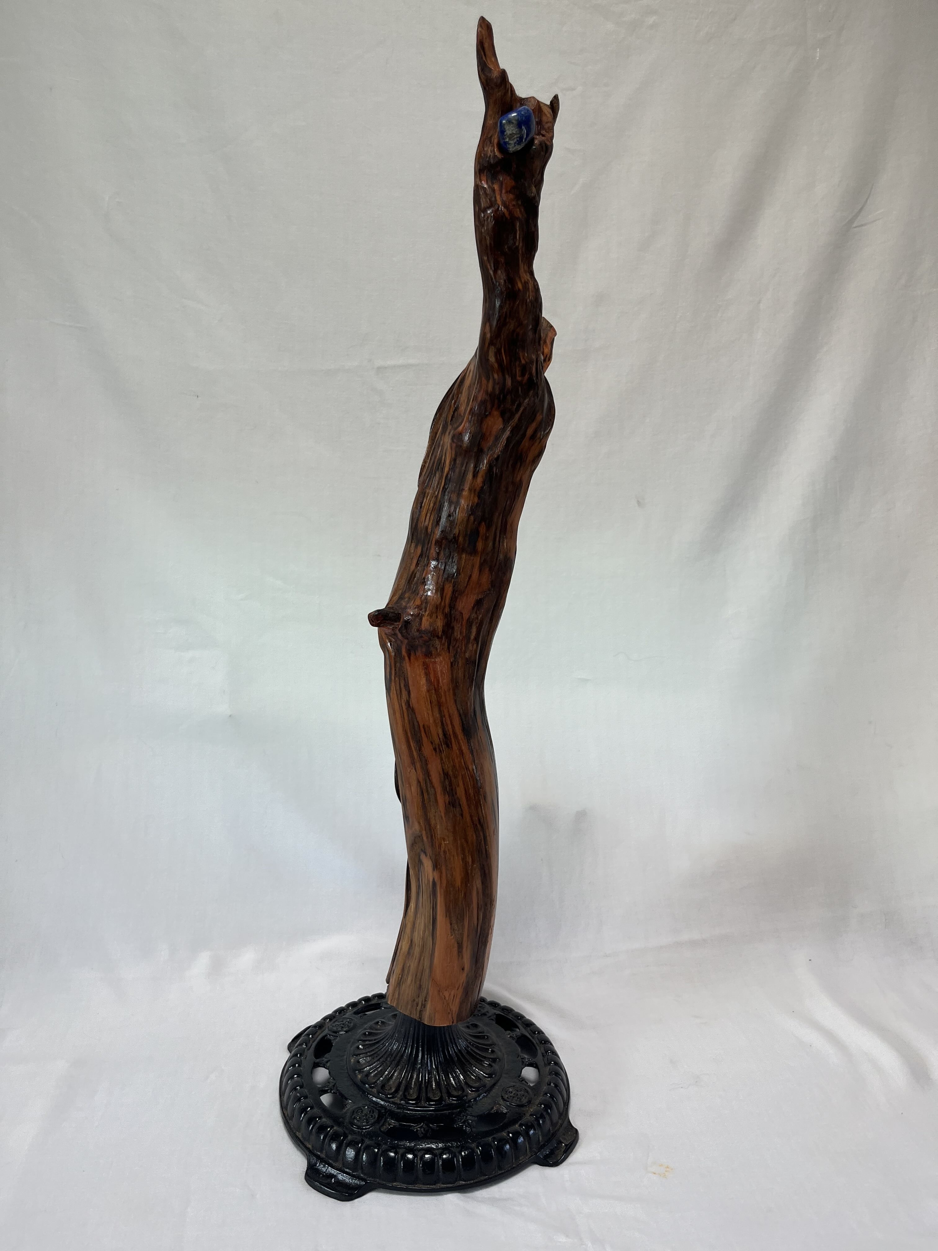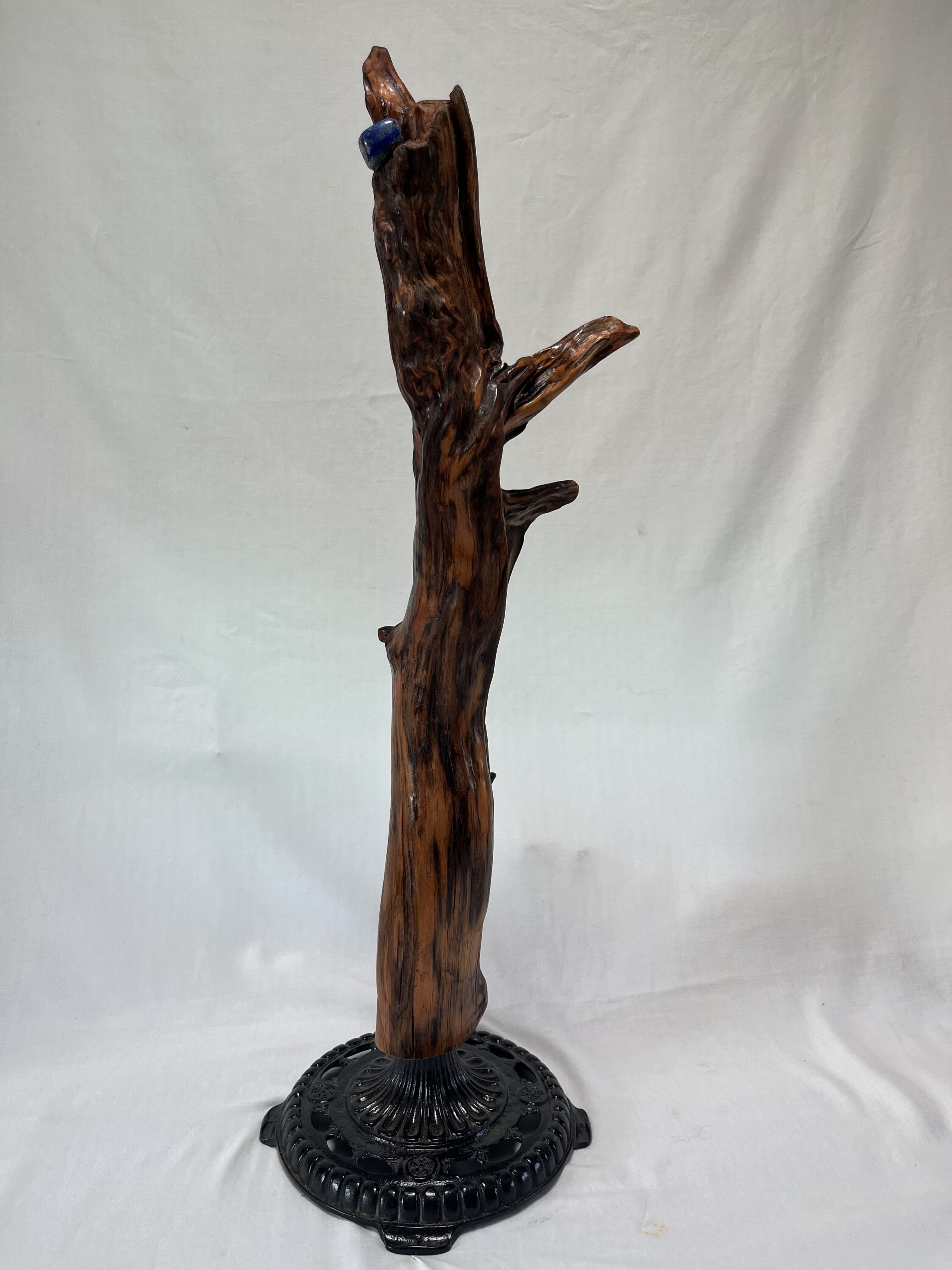 This one-of-a-kind, Earth nature altar has been hand sanded and shaped from a 150-year-old , Douglas Fir tree root piece that came from the ground pretty much intact. Uniquely colored by the deeply imbedded sap the surface is quite smooth except for one small burl-like section at the top. Here the grain displays an interesting swirly pattern. The mounted stone is a Lapus Lazuli, which enables access to the mystical realm, wisdom and planetary knowledge. Lapus Lazuli is also seen as the stone of total awareness. Rather than horizontal, as it lay in nature, the piece has been mounted vertically on a vintage cast-iron lamp stand encouraging the earth spirit of the piece to reach for the sky.