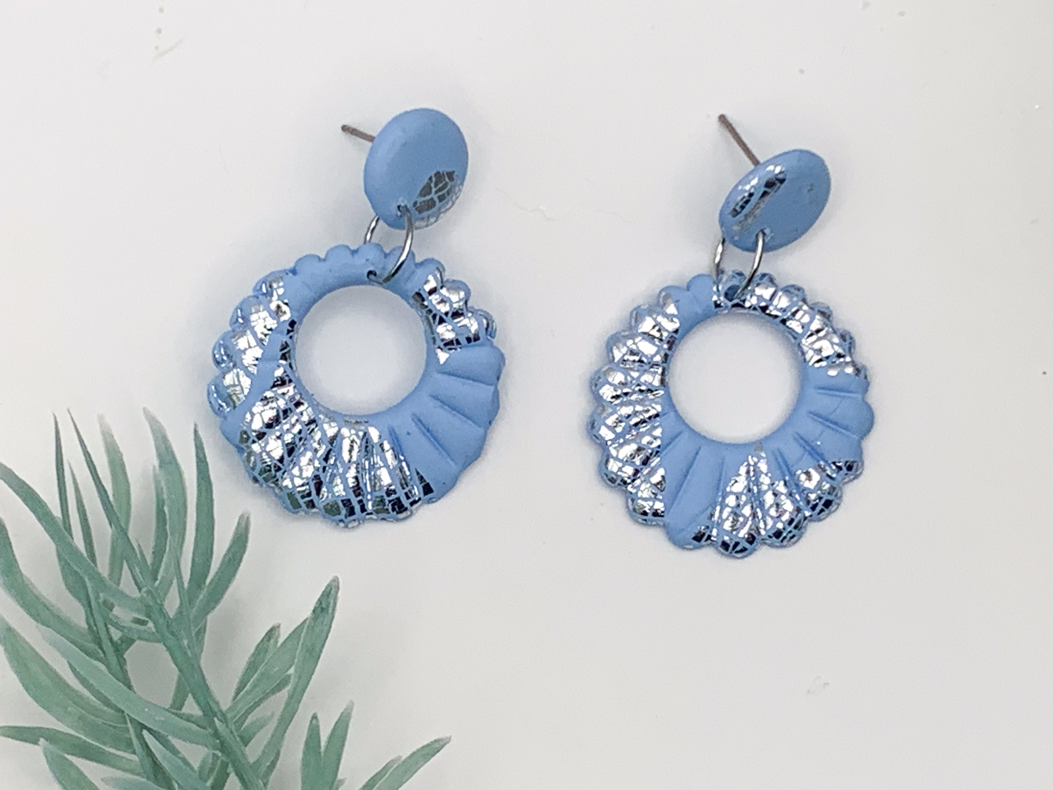 Modern and chic! These powder blue circle earrings feature shimmering silver foil accents for a bold yet minimalist look.