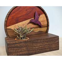 You can add an optional floating element that adds more depth to the piece, like the bird pictured in the large piece. If you have a particular element you'd like to add, please message me before purchasing so I can make sure it's doable. The pictured hummingbird, butterfly and dragonfly are made of purple heart, but any floating elements for this piece will be made from walnut, since purple heart is already in the background.