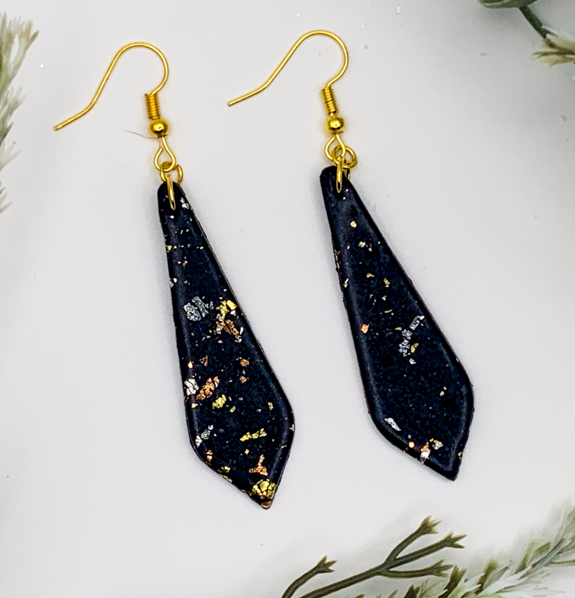 Edgy and elegant! These elongated black clay earrings feature shimmering gold and silver foil details for a modern, geometric vibe. Lightweight yet bold—your new go-to statement piece!