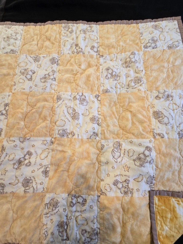 Baby quilt 36"X 36" featuring a Sleeping Bear theme. The back has a white-yellow background. The quilting is done in a half-moon design.