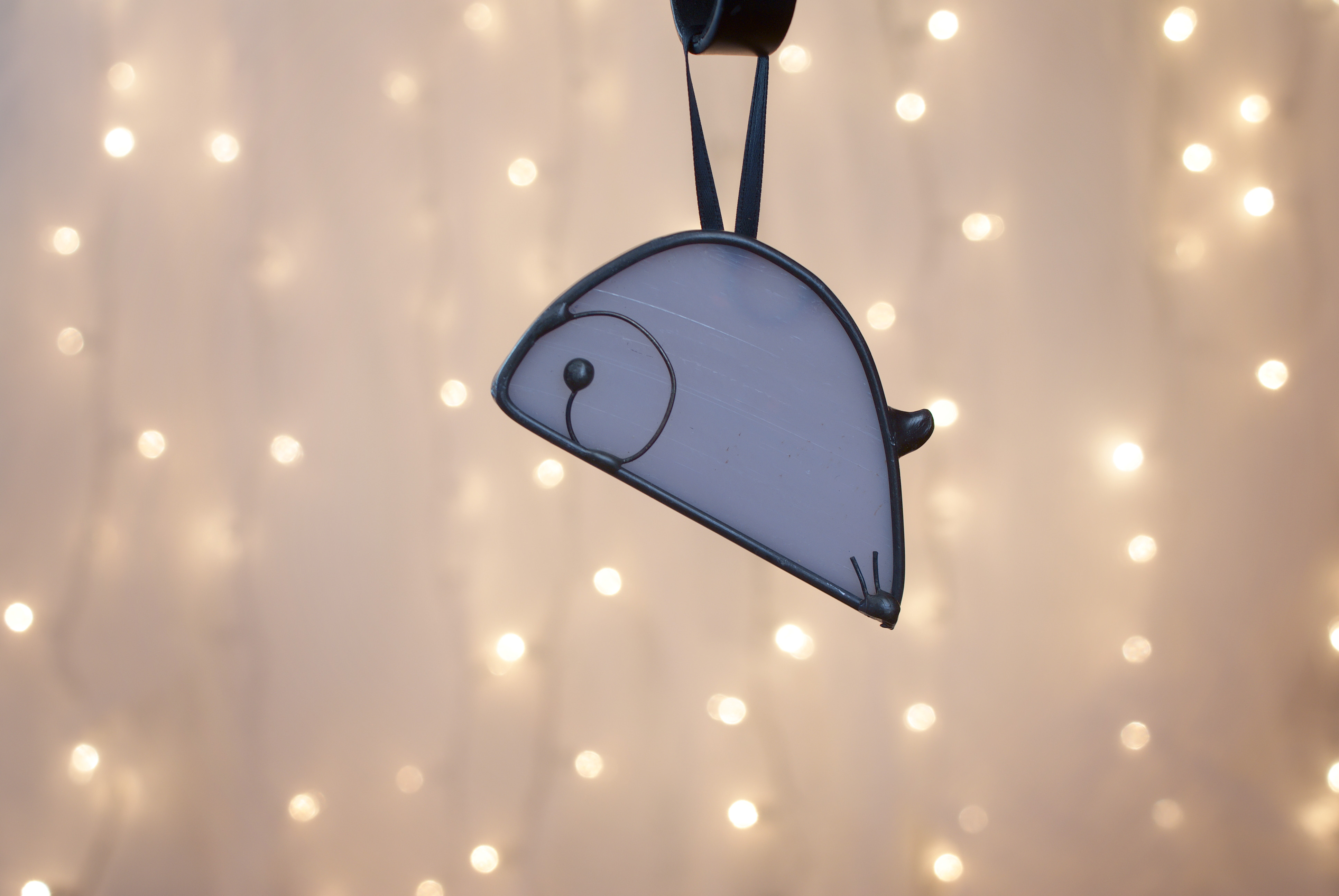 The Sleeping Mouse Stained Glass Suncatcher, in grey or caramel, adds a whimsical charm to your home. Meticulously cut from authentic stained glass with softly swirled colors and intricate wire details including whiskers, ears, and a tail, this piece includes love and care in every detail.