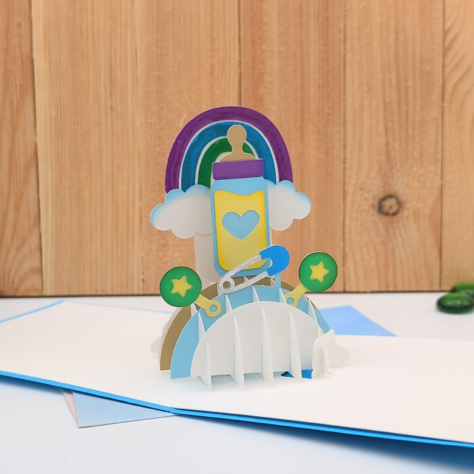 This handcrafted slice form pop-up card is a sweet celebration of new life. Featuring a dimensional baby bottle with a heart, a rainbow arch, and playful baby rattles, it pops up when opened to reveal a vibrant 3D scene. The front reads “Celebrate,” while the inside is blank—ready for your personal message. Perfect for baby showers, newborn gifts, or welcoming a little one with handmade charm. A keepsake-worthy design full of color, movement, and warmth.