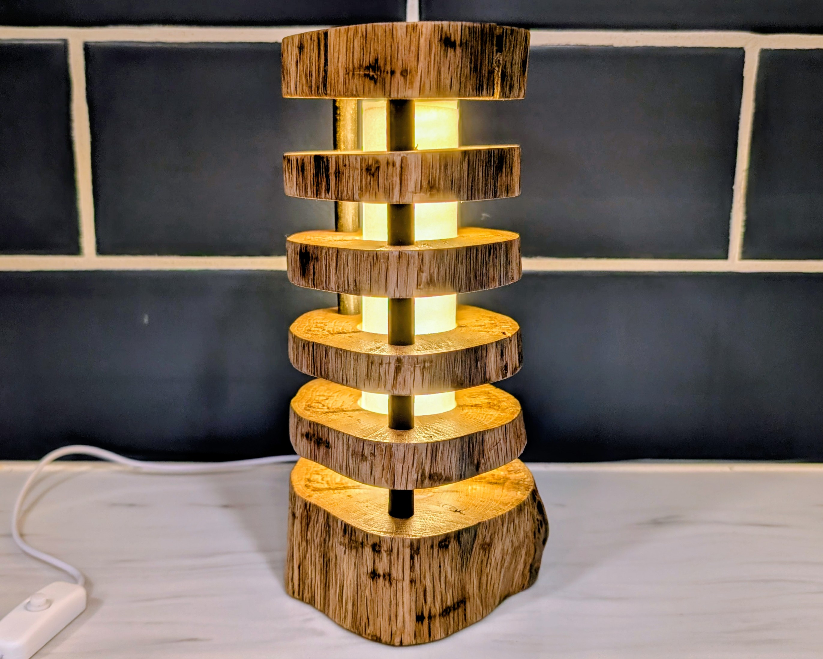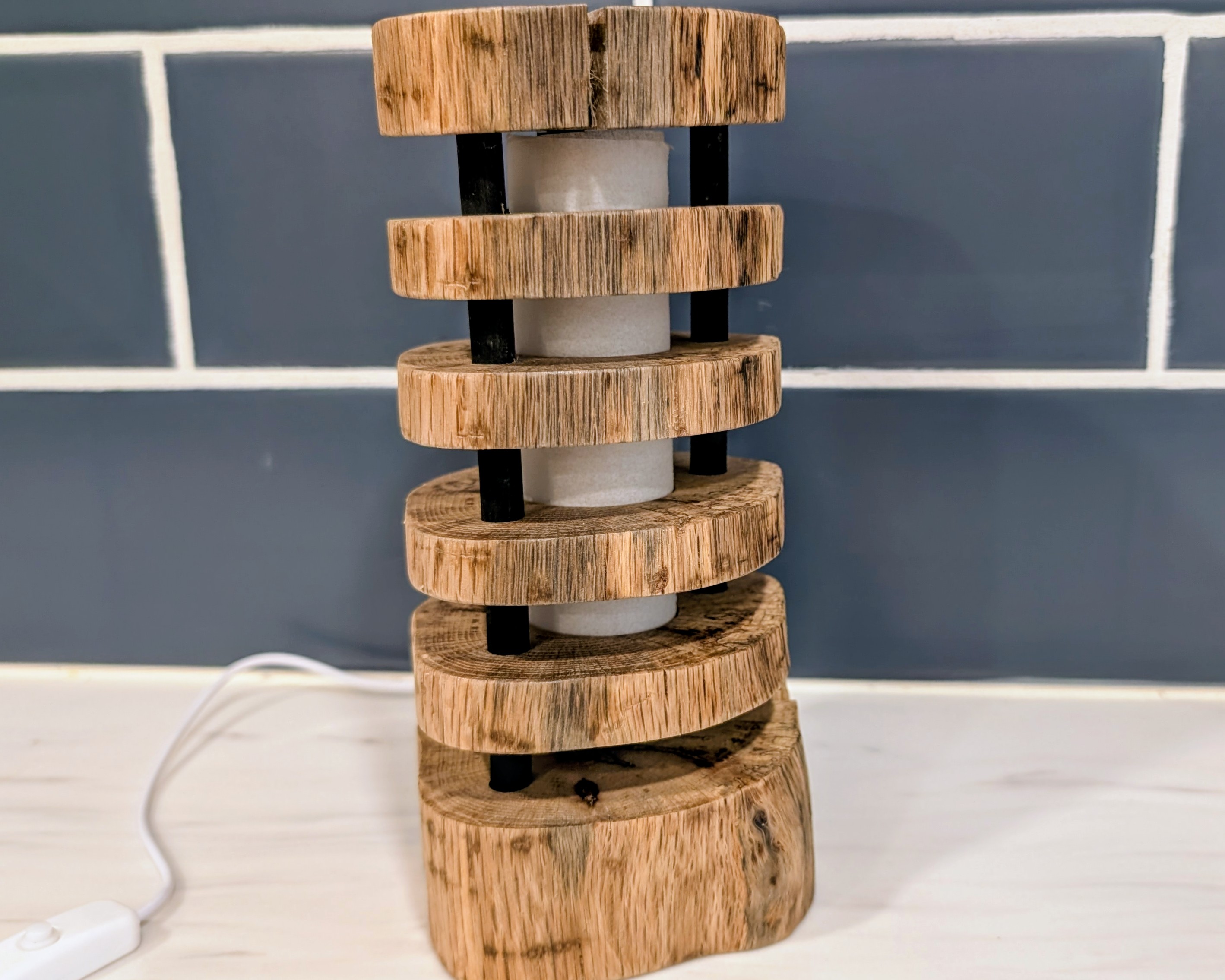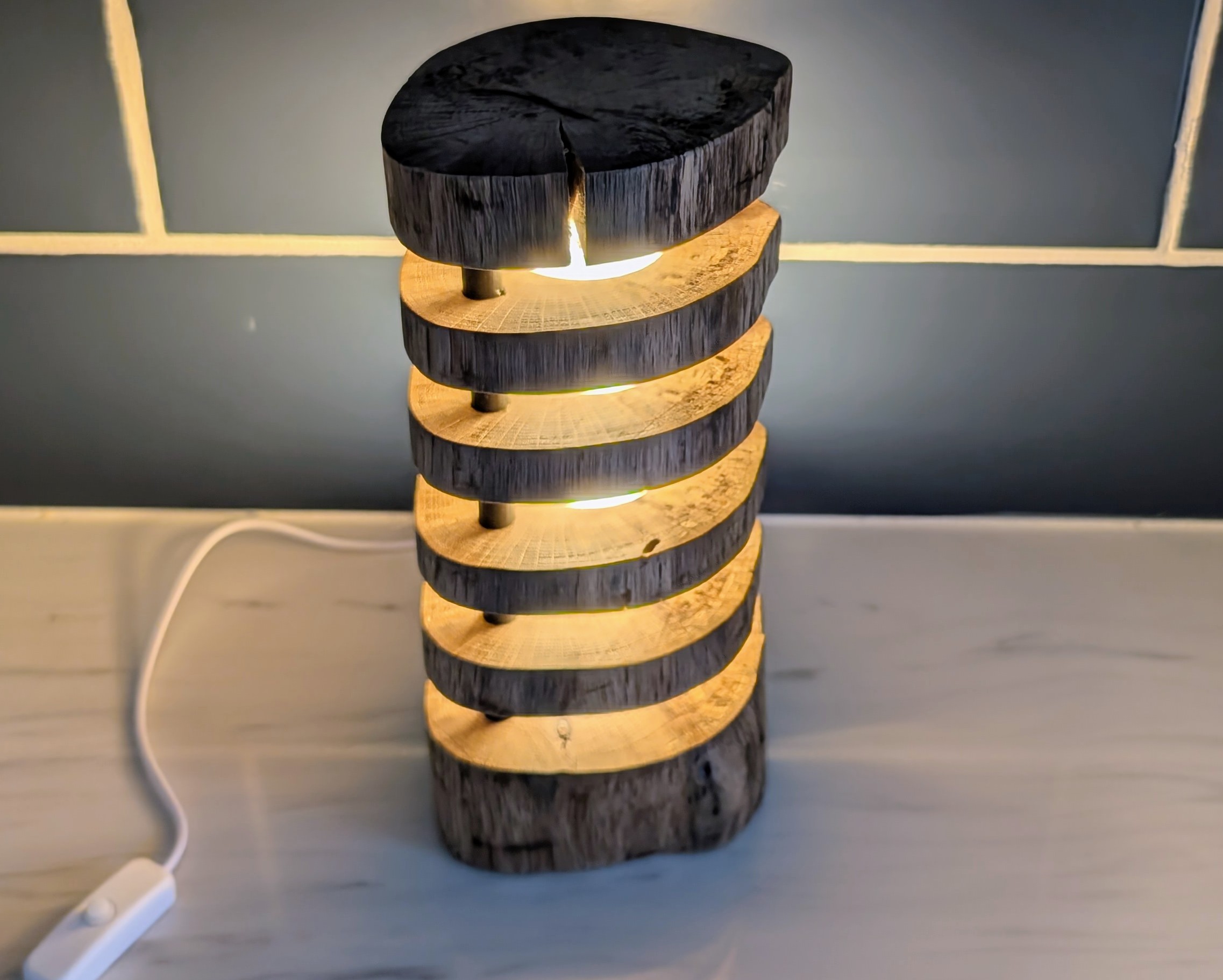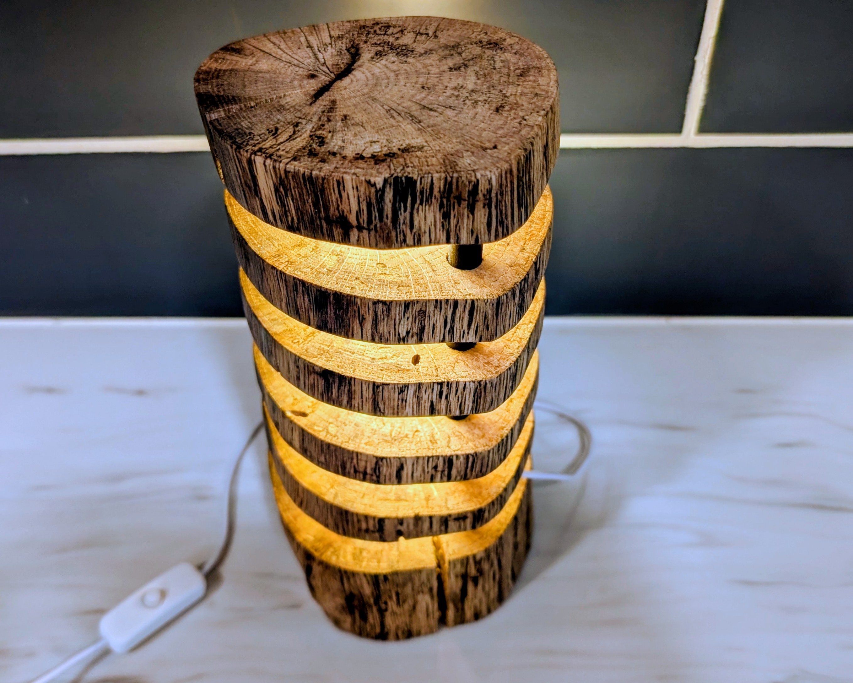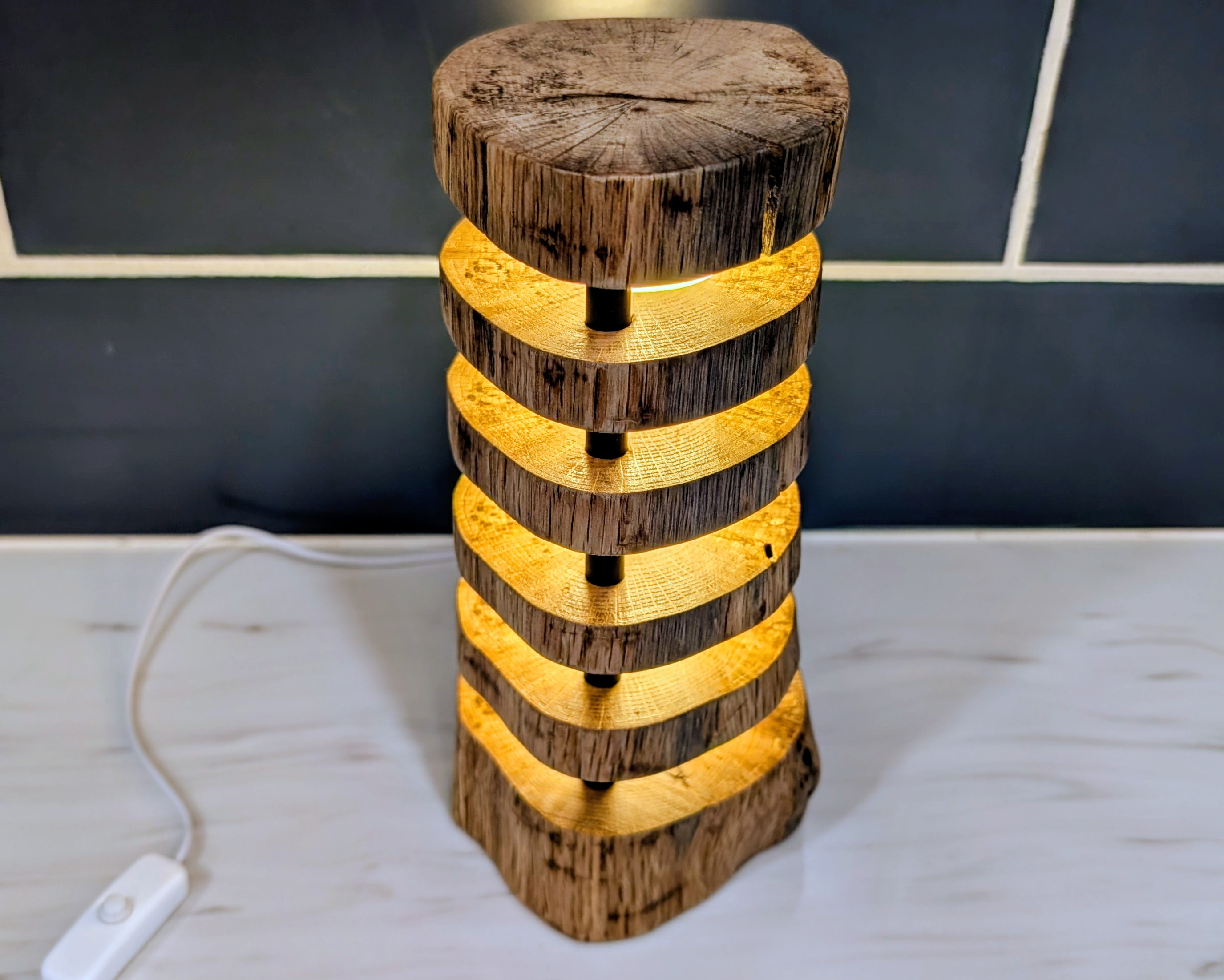 Bring the warmth of the forest into your home with this handcrafted lamp made from a reclaimed oak branch. Each branch is carefully cut into stacked sections, creating organic gaps that allow the soft glow of an LED light to shine through. The natural edges, textures, and grain of the oak are left beautifully intact, making every piece completely unique.