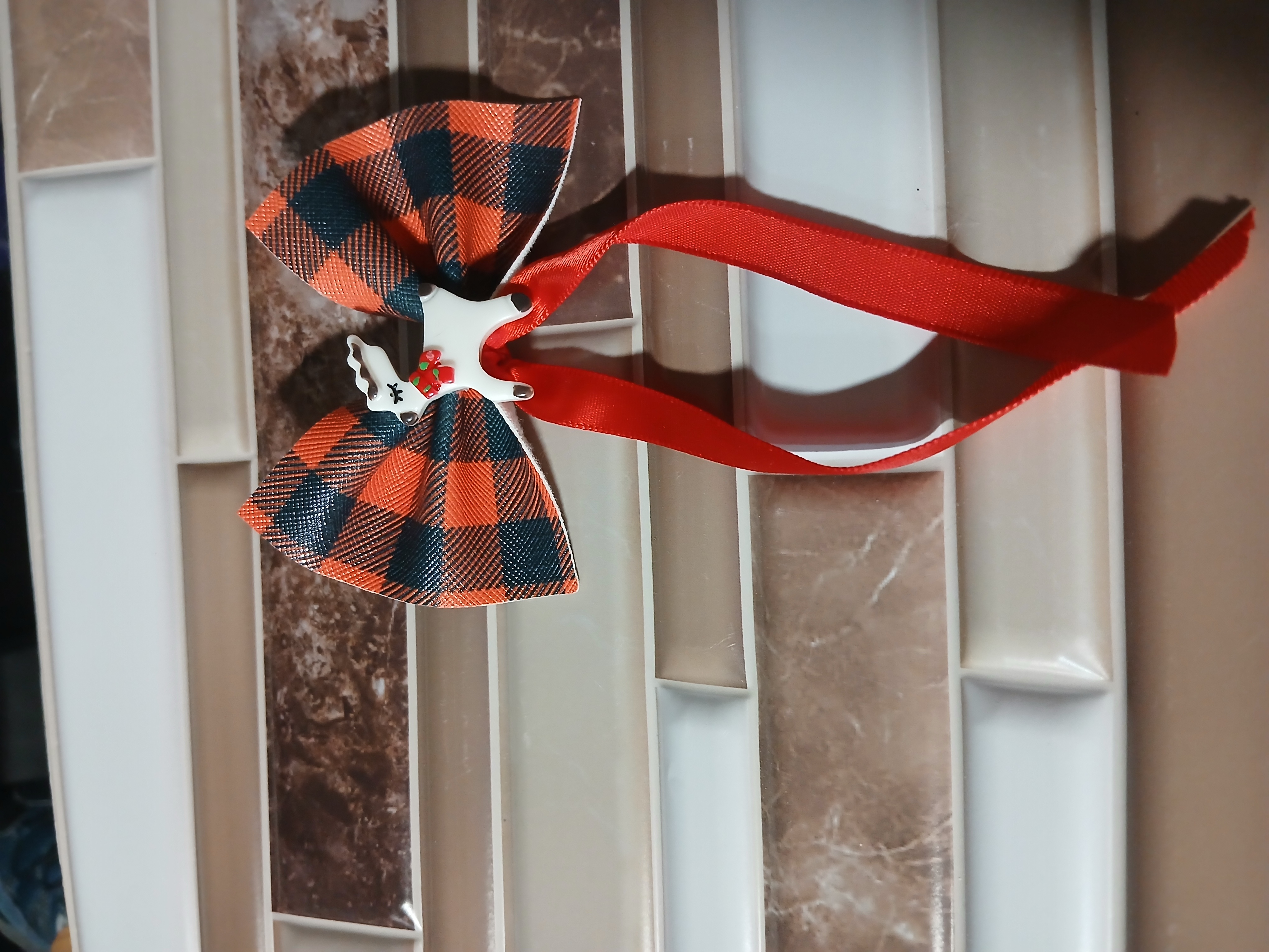 Small black and red plaid faux leather hair bow with white reindeer in center