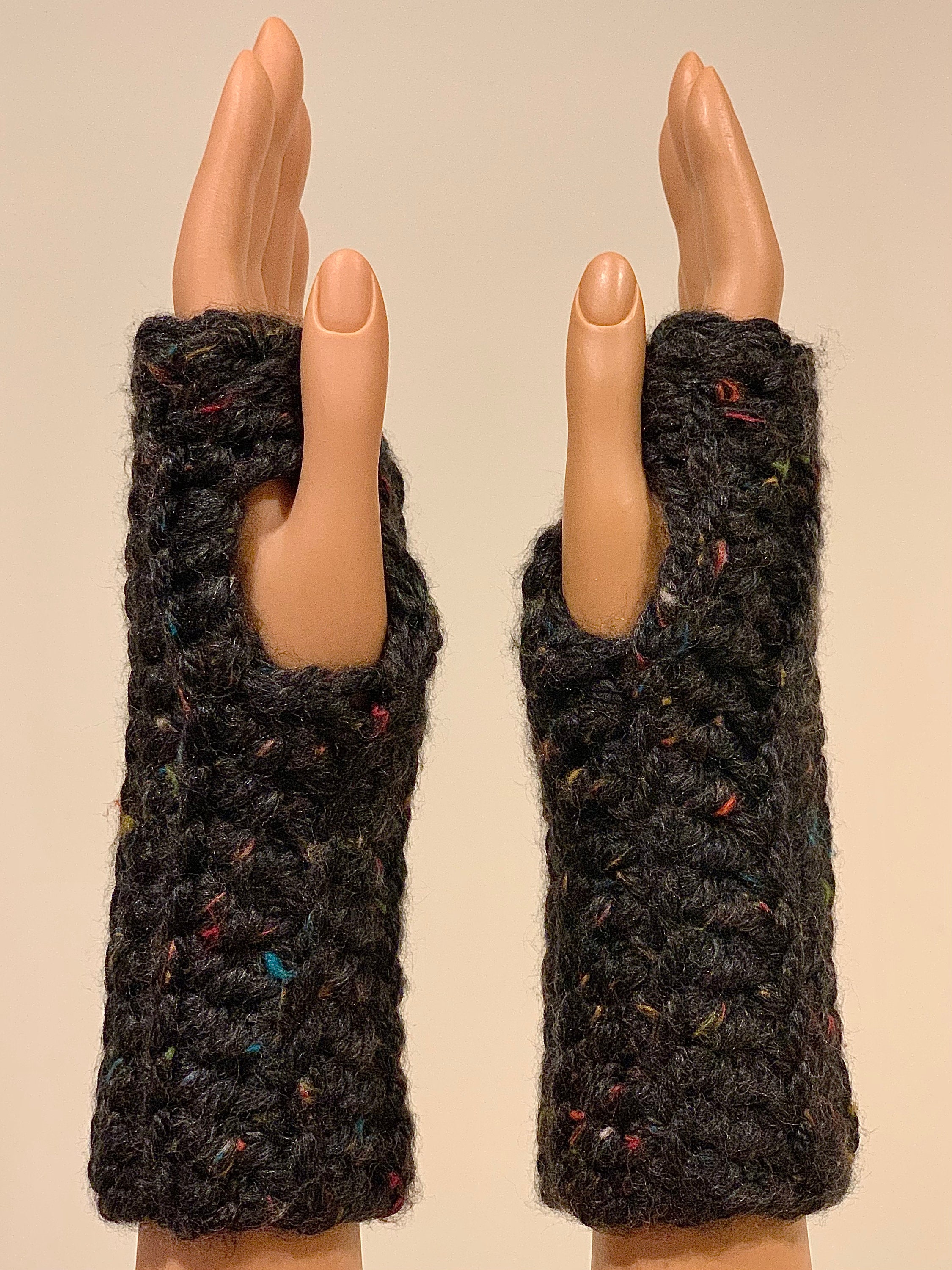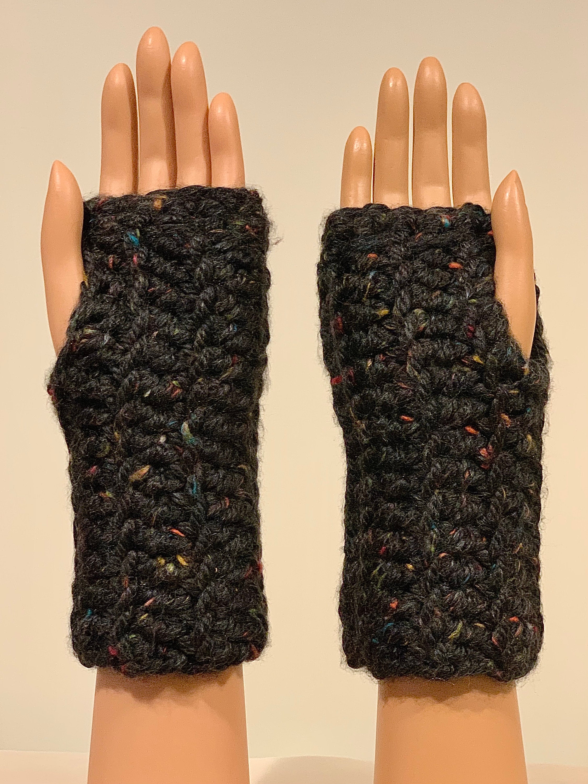 These fingerless mittens are suitable for both outdoor and indoor use. They are stylish and cozy, coordinating beautifully with my eternity scarves and other crocheted creations (hats, headbands, clip-on flowers, and more).